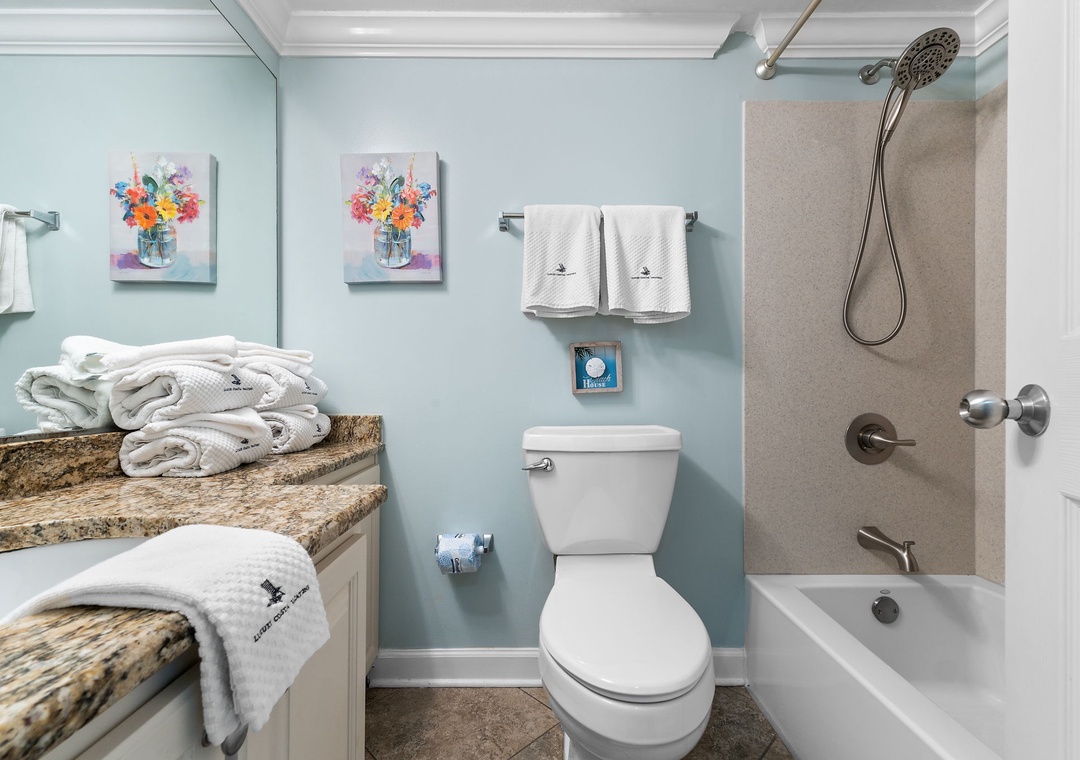 The king primary suite is a tranquil retreat, offering private balcony access where you can listen to the waves and enjoy the morning sunrise. The suite includes a large flat-screen TV and a luxurious ensuite bathroom, complete with a stylish bowl sink and a fully tiled shower featuring a rain shower head. Two additional bedrooms provide plenty of space for guests: one with two queen beds and a flat-screen TV, and the other with two full beds and a WiFi-enabled DVD monitor, allowing Phoenix East 511 to sleep up to ten guests comfortably. A shared guest bathroom and a full-sized washer and dryer add extra convenience to make your stay truly relaxing.