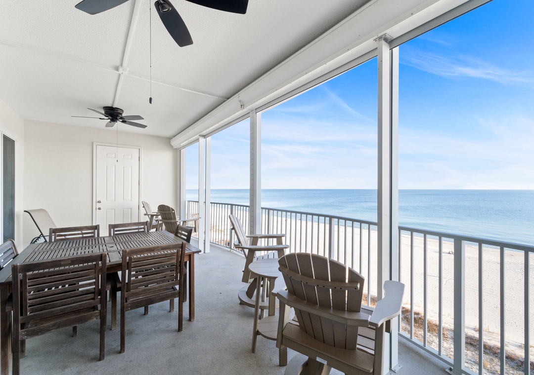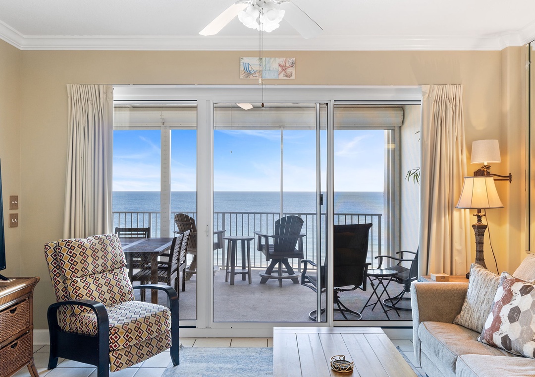 This spectacular 2 bedroom unit offers almost 1400 square feet of luxury living and an open and spacious floor plan, while elegant furnishings and accents give the unit a sophisticated yet comfortable feel. The living area hosts plush furnishings, a large LCD television, and most importantly, beachfront balcony access! Floor-to-ceiling sliding glass doors open to the expansive covered terrace, and with plenty of seating you can enjoy your favorite beverage and even savor a delicious meal while delighting in panoramic vistas of the sparkling Gulf Coast!