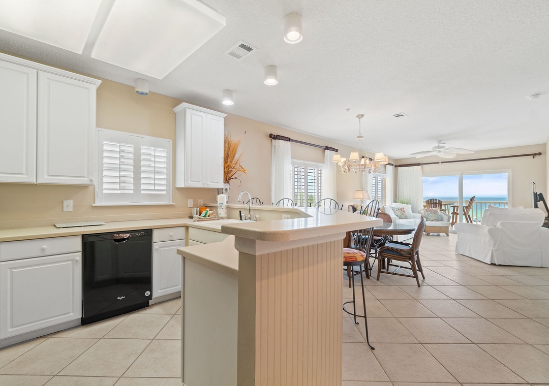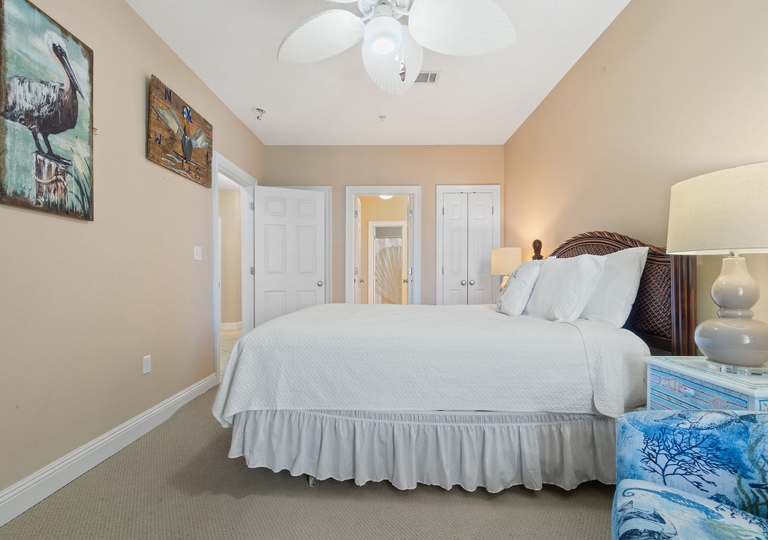 The additional bedrooms are thoughtfully arranged for all guests, with the second bedroom featuring two sets of twin bunk beds with plush bedding, and the third bedroom offering a comfortable queen bed. This luxury unit also includes a full-size washer and dryer for added convenience. Stop dreaming and start planning your perfect vacation—book with us at Riviera Dunes and experience the best of Perdido Key!