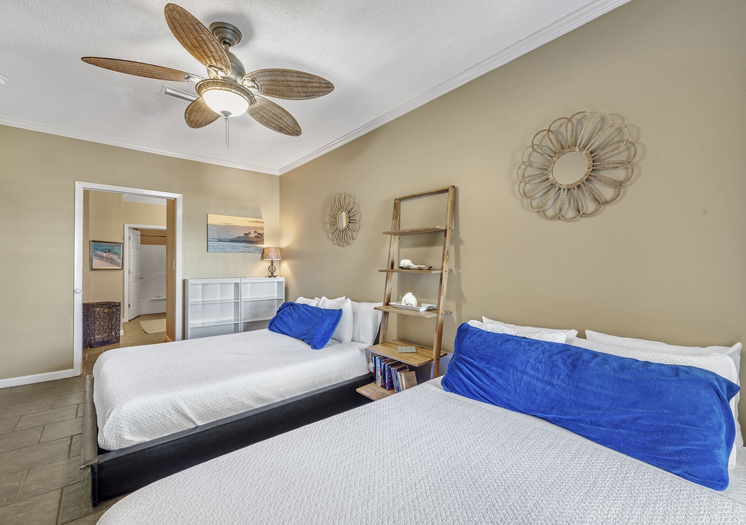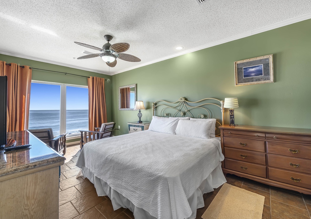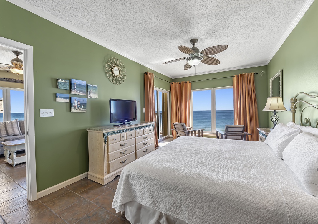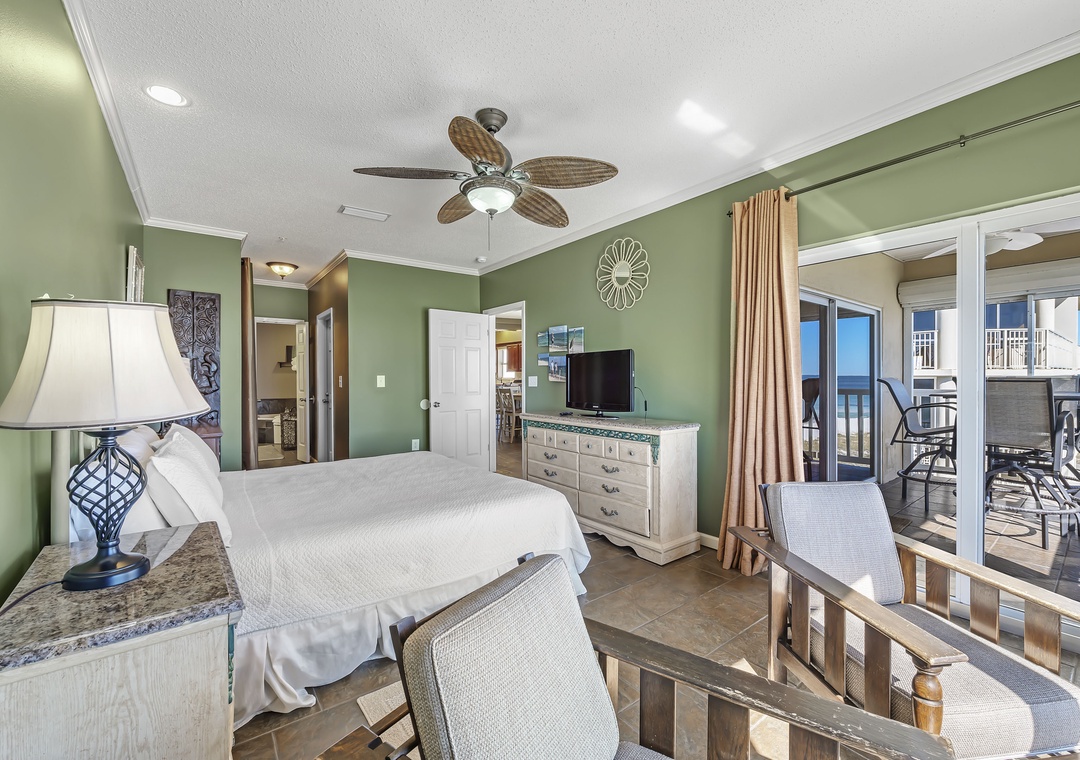 The gourmet kitchen is fully equipped, featuring custom cabinetry, stainless steel appliances, and everything needed to create memorable meals. A wood dining table seats eight, with additional seating at the breakfast bar for more casual dining. At day’s end, retreat to the grand master suite, where you’ll find a king bed, premium linens, and balcony access. The ensuite bath offers an oversized jetted tub, dual vanities, and a custom walk-in shower, making it a sanctuary of relaxation. Three additional guest bedrooms provide comfortable accommodations with luxury linens, flat-screen TVs, and sleeping arrangements for up to 10 guests. This beachfront haven promises a vacation of relaxation, luxury, and endless Gulf views.