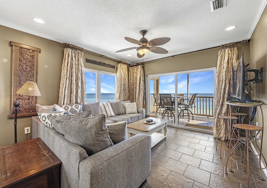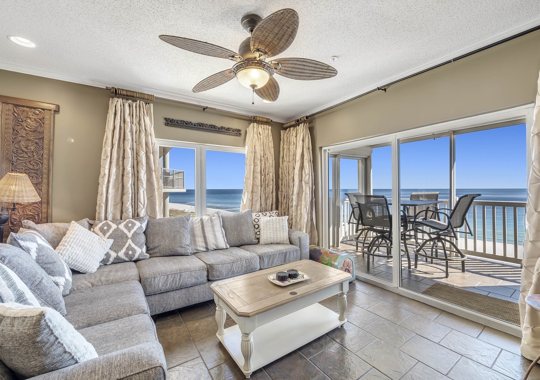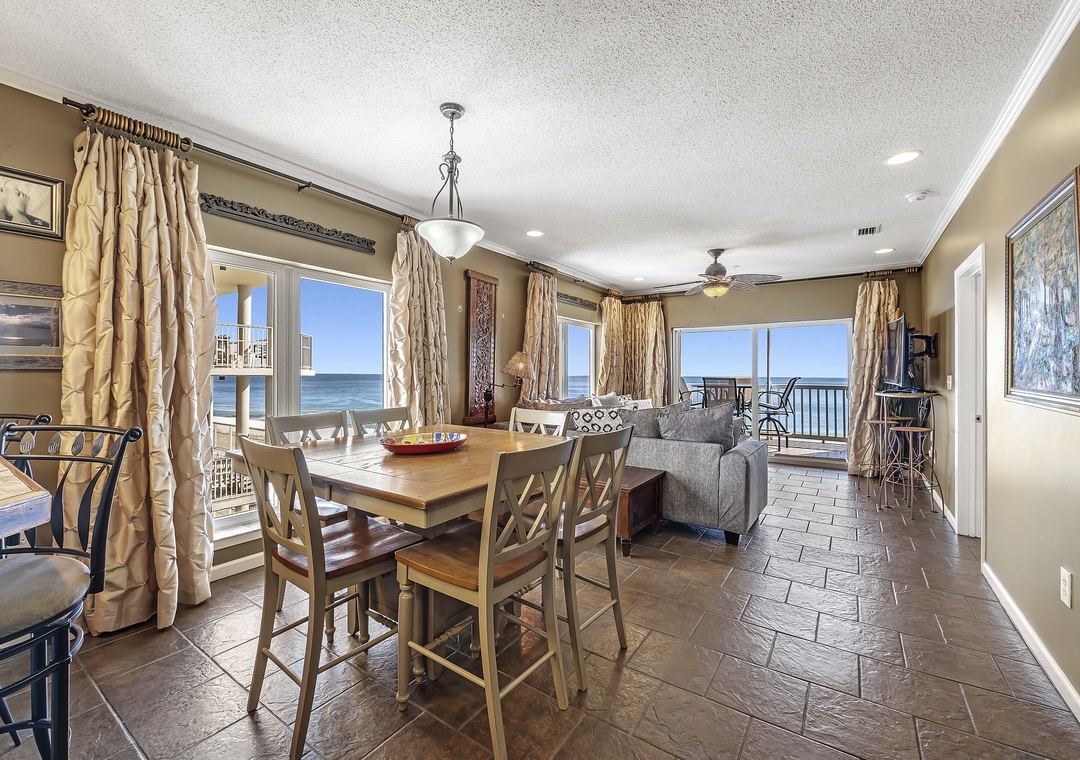 Experience the ultimate Florida getaway at Riviera Dunes, a 4-bedroom beachfront retreat in Perdido Key. This stunning vacation rental offers a perfect blend of luxury and comfort on a quiet stretch of pristine coastline. With sugar-white sands and endless Gulf views as your backdrop, this is truly a place for an unforgettable escape. Inside, the condo boasts a beautifully designed, open floor plan with high-end finishes, a spacious living area with ample seating, and floor-to-ceiling sliding glass doors leading to an expansive Gulf-front balcony. The covered terrace is ideal for relaxing, dining, or simply soaking in the breathtaking views.