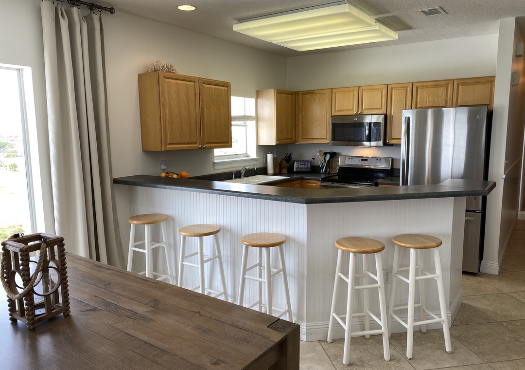 The gourmet kitchen is fully equipped with custom cabinetry, stainless steel appliances, and everything needed to prepare memorable meals. A beautiful wood dining table comfortably seats eight, complemented by additional seating at the breakfast bar for relaxed, casual dining. When it’s time to unwind, retreat to the luxurious primary suite, offering a king bed with premium linens, private balcony access, and a spa-inspired ensuite bath complete with a jetted soaking tub, dual vanities, and a custom walk-in shower.