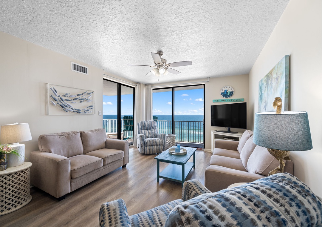Indulge on your next vacation and stay in this stunning 10th floor 3 bedroom, 2 bath unit at Romar Place 1002! Situated upon a pristine stretch of white beach, this amazing complex combines luxury, comfort and recreation into one remarkable vacation destination! Wake up and delight in the splendor of coastal living, where panoramic views of sugar-white sands and glistening emerald waters create the perfect setting for an unforgettable beach getaway.
