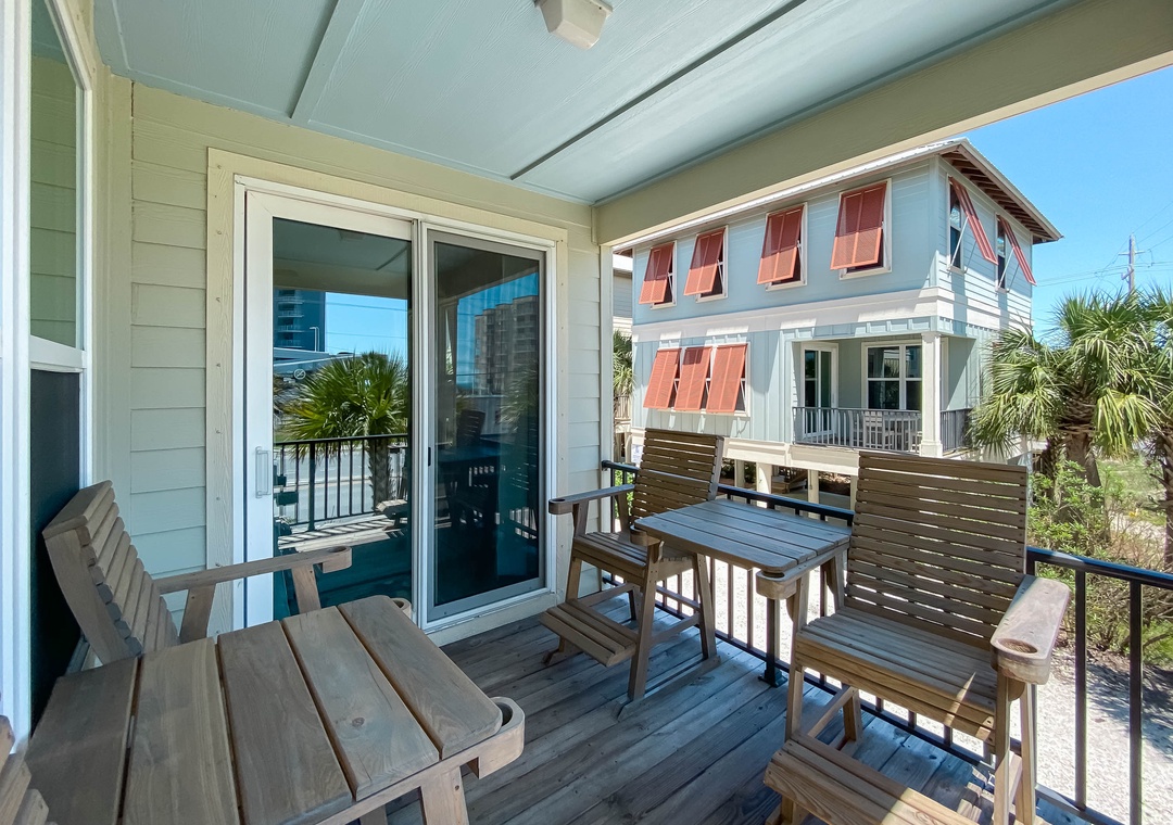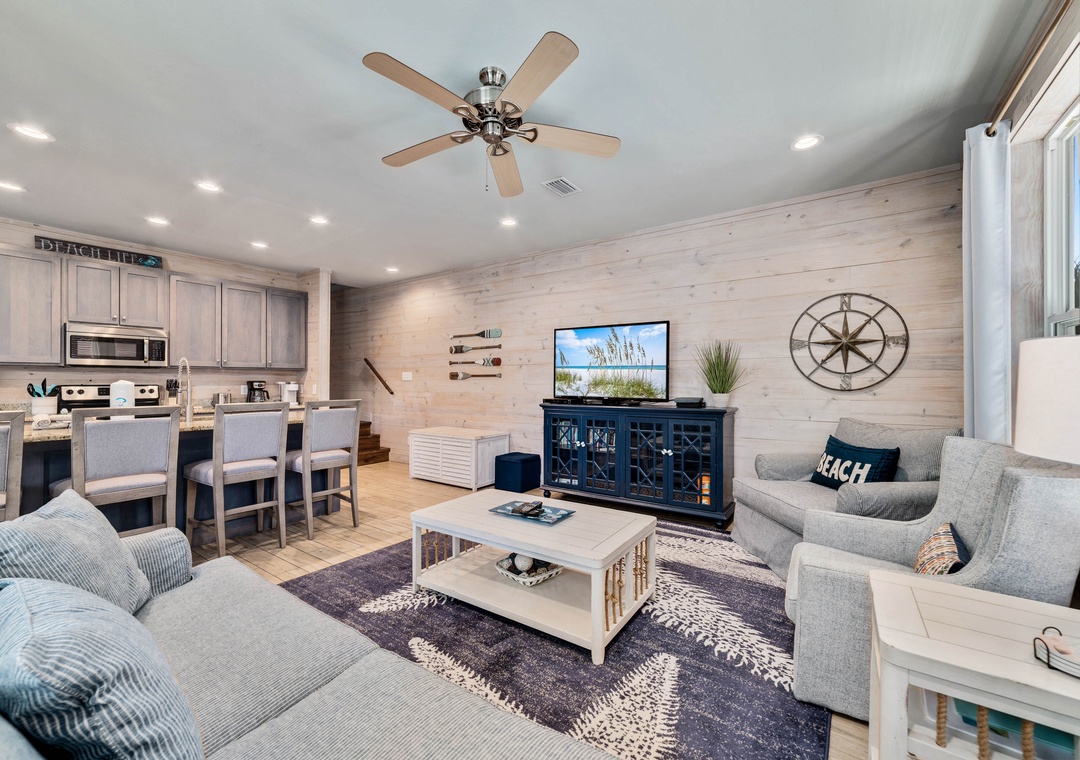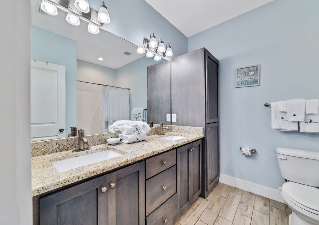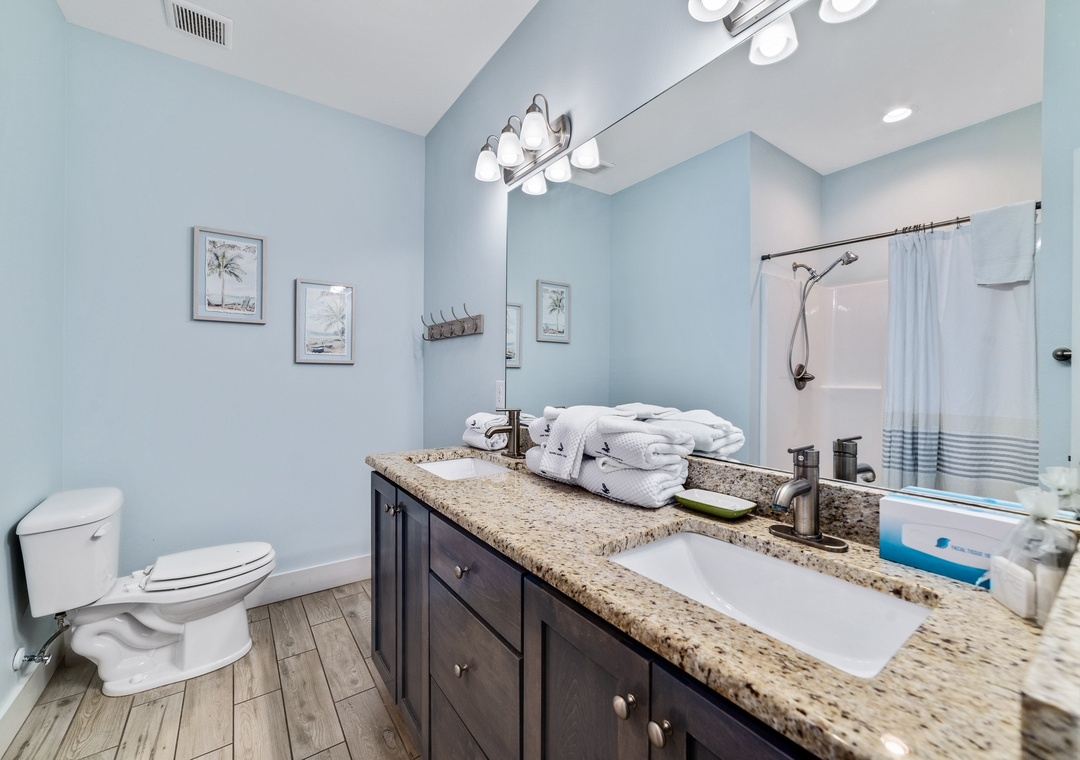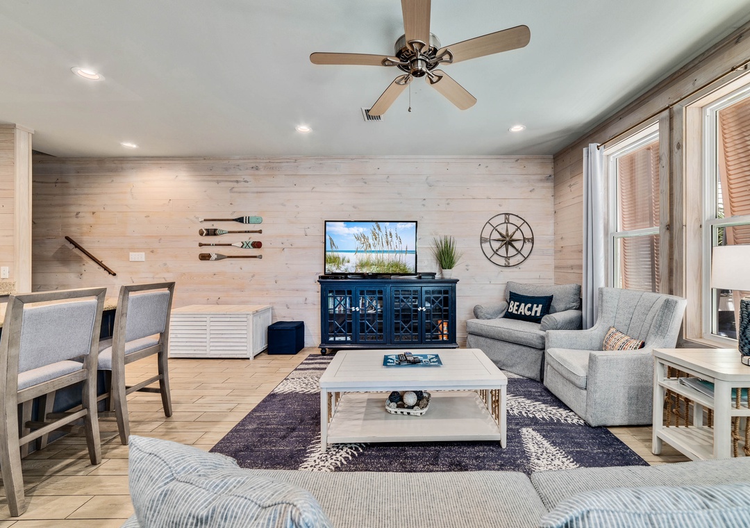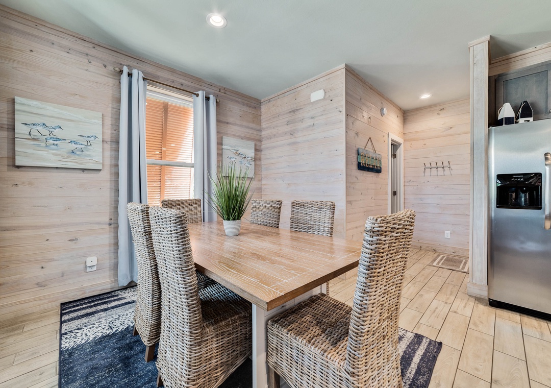 Sandbox Cottage is a 2 bed, 3 bath beach cottage located only 1 block from the white sandy beaches of Gulf Shores. This very spacious home boasts plenty of covered parking, storage, community swimming pool, and direct beach access with a streetlight to safely cross the road. The cottage has 2 large bedrooms, each with their own ensuite. The main floor has a large living room with sofa sleeper, separate dining, kitchen with island and a full bath for extra guests. This chic cottage has white-washed wood walls, plank tile floors, granite countertops throughout, and a full-size washer/dryer.