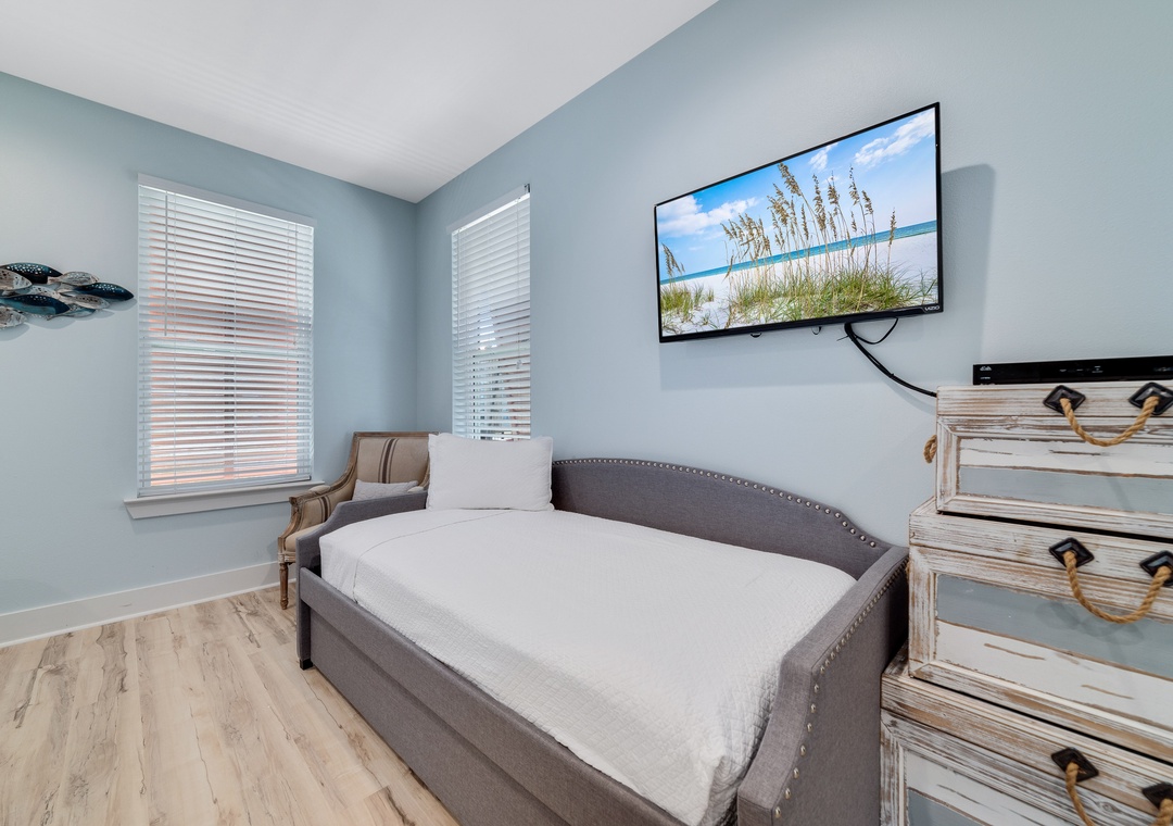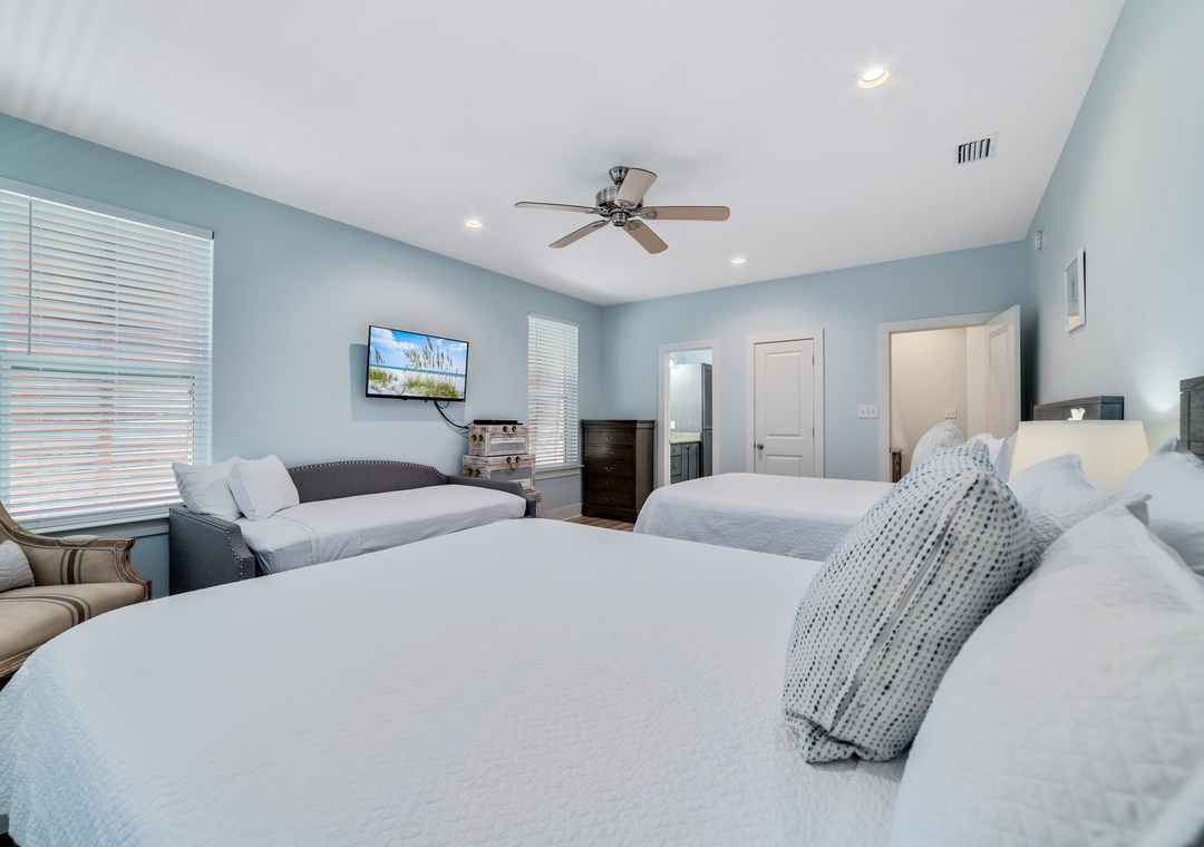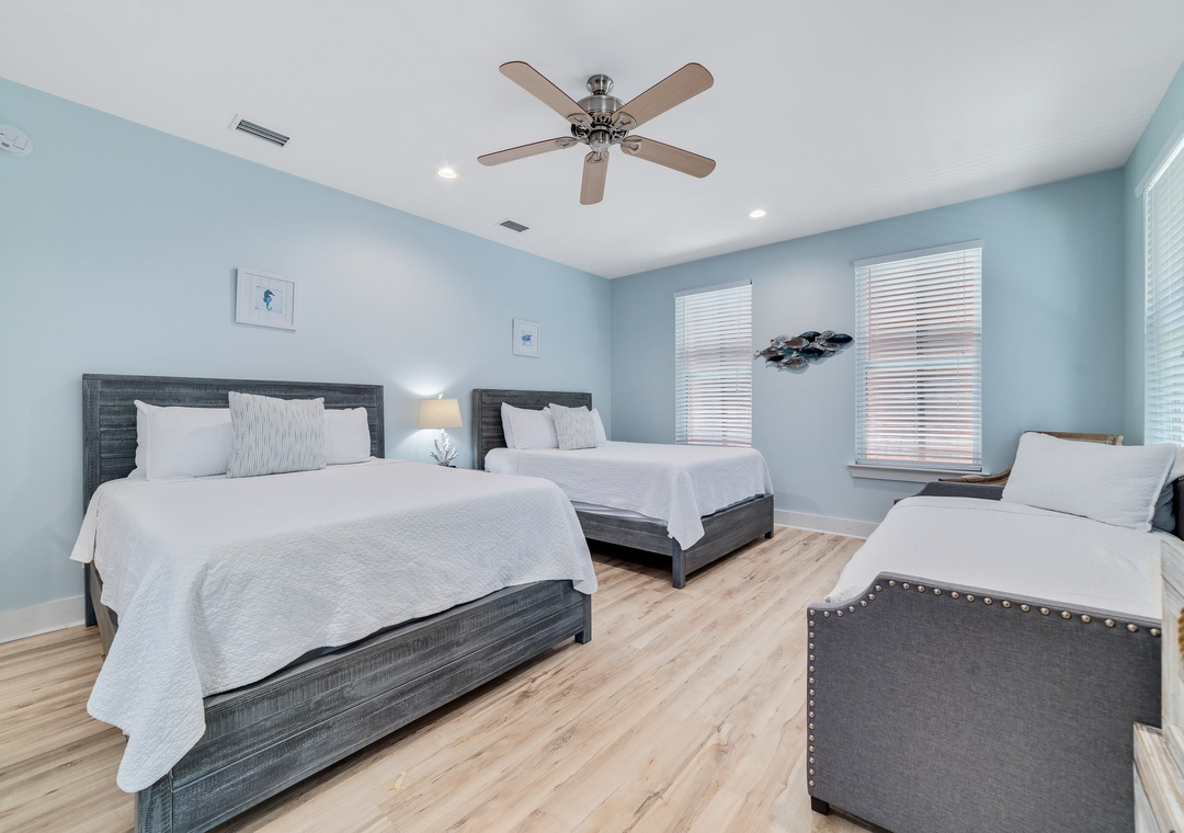 The gorgeous bedrooms accommodate 6 guests with 1 king bedroom with an ensuite bathroom and an additional bedroom featuring 2 queen beds and a twin daybed with trundle, as well as another attached bathroom.
