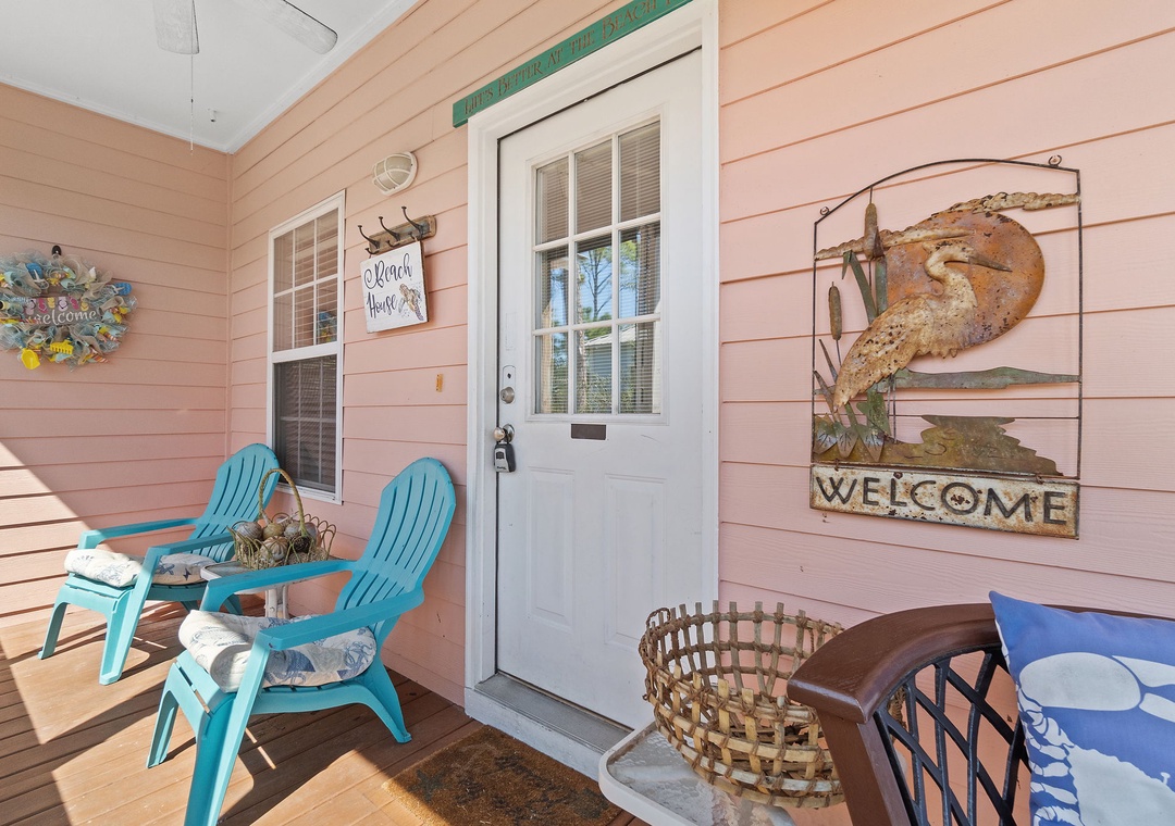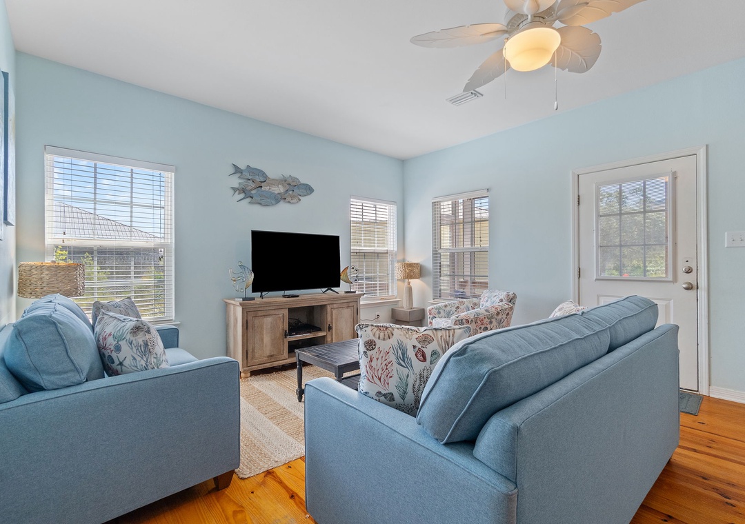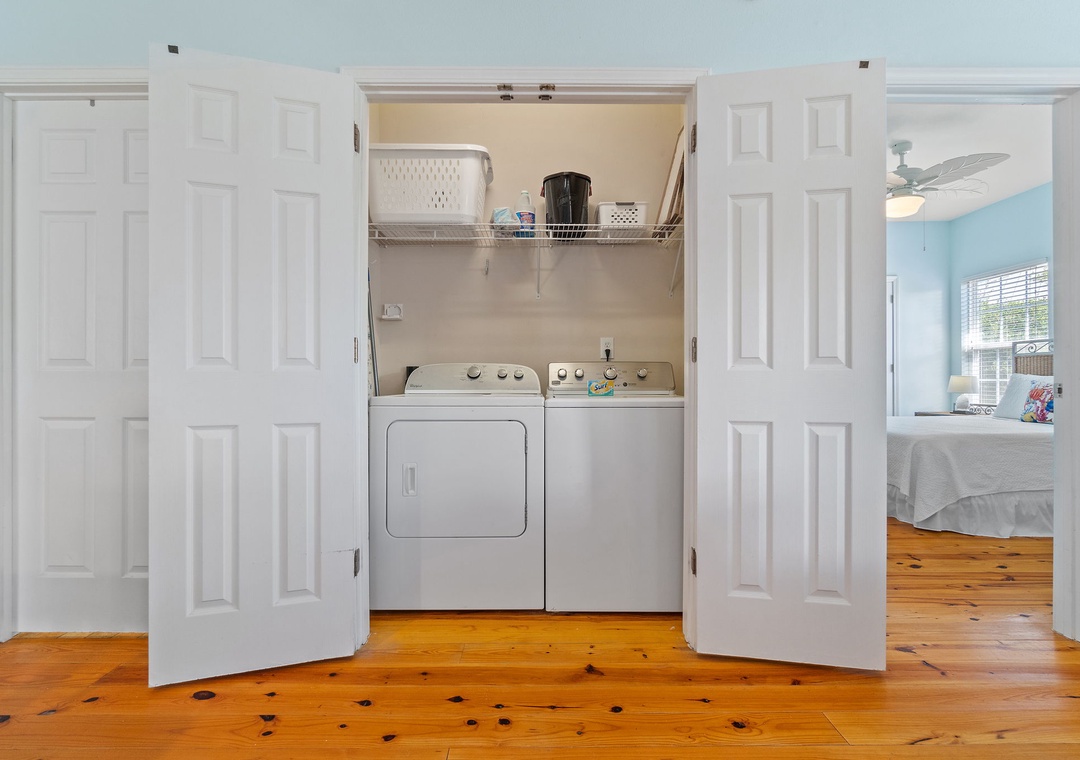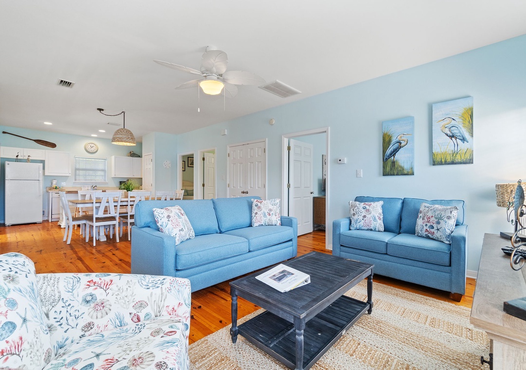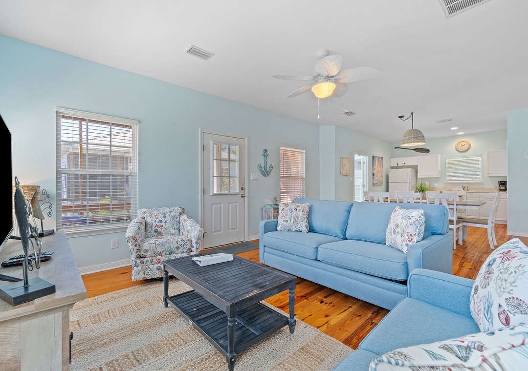 The Coral Coastal Cottage is decorated bright and cheerful, WiFi is included for your convenience. This unit offers a Queen Bed with a TV in the Master Bedroom and attached Private Bath. The first Guest Bedroom offers a Queen bed, and the second Guest Bedroom offers a two Full bunk beds with twin trundle beds! Perfect for the kids! The bedrooms are appointed with high quality mattress sets and high thread count linens, and the bathrooms are stocked with plush 100% cotton oversized towel sets. There is a full-size sleeper sofa in the living room, accommodating up to 12 guests! This unit also offers a full size washer and dryer, kitchen appliances--both large and small, cookware, and utensils. Park right in front of the cottage and no elevators to carry your things up. Just like being at home.