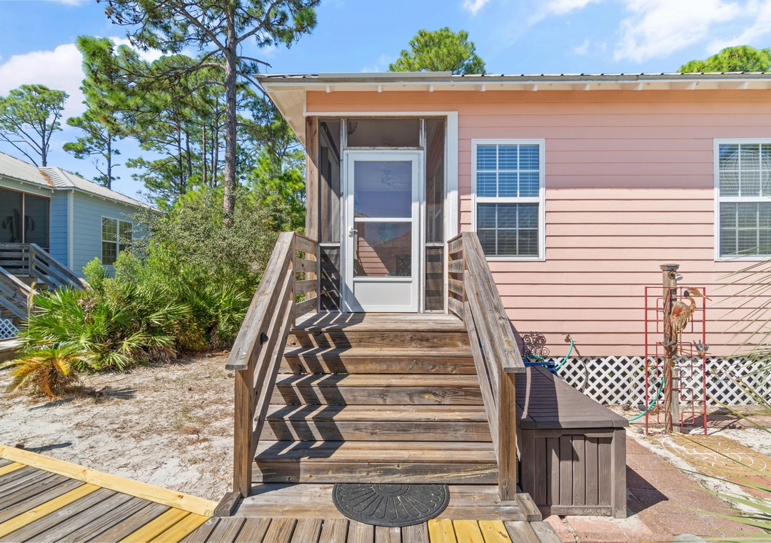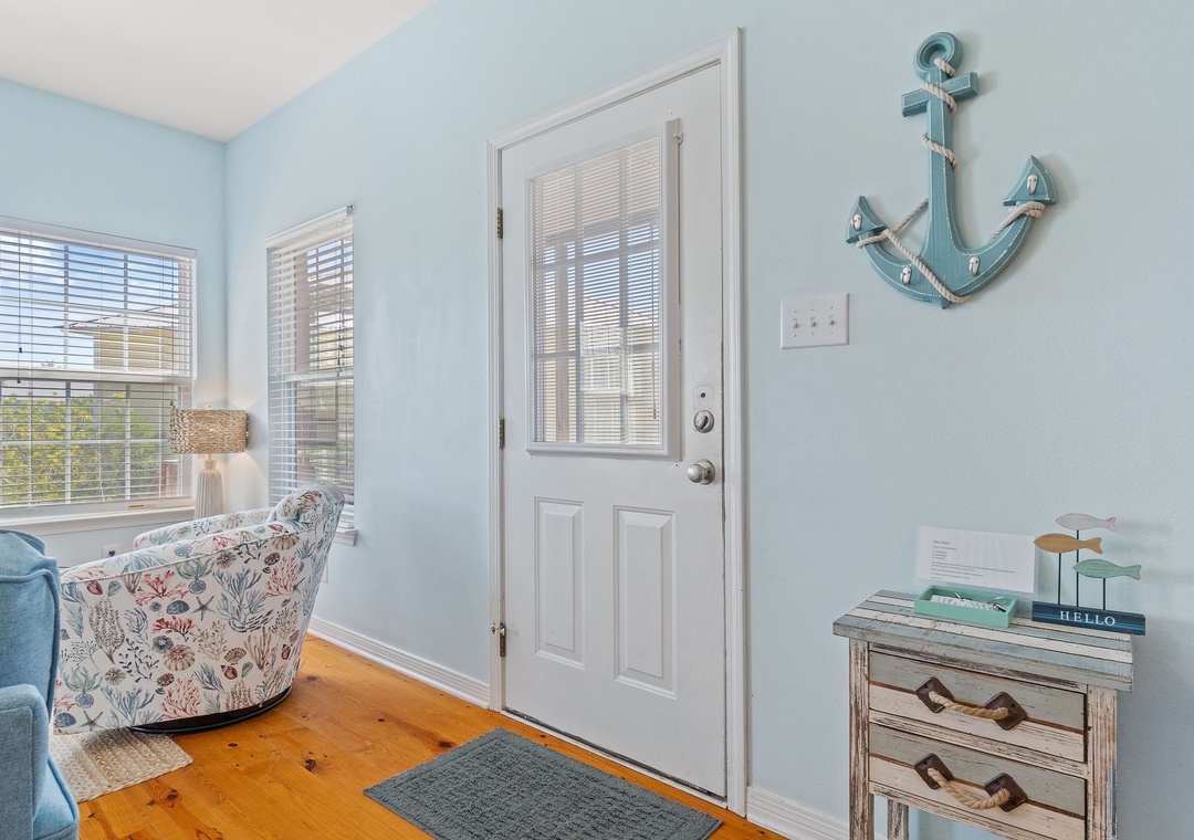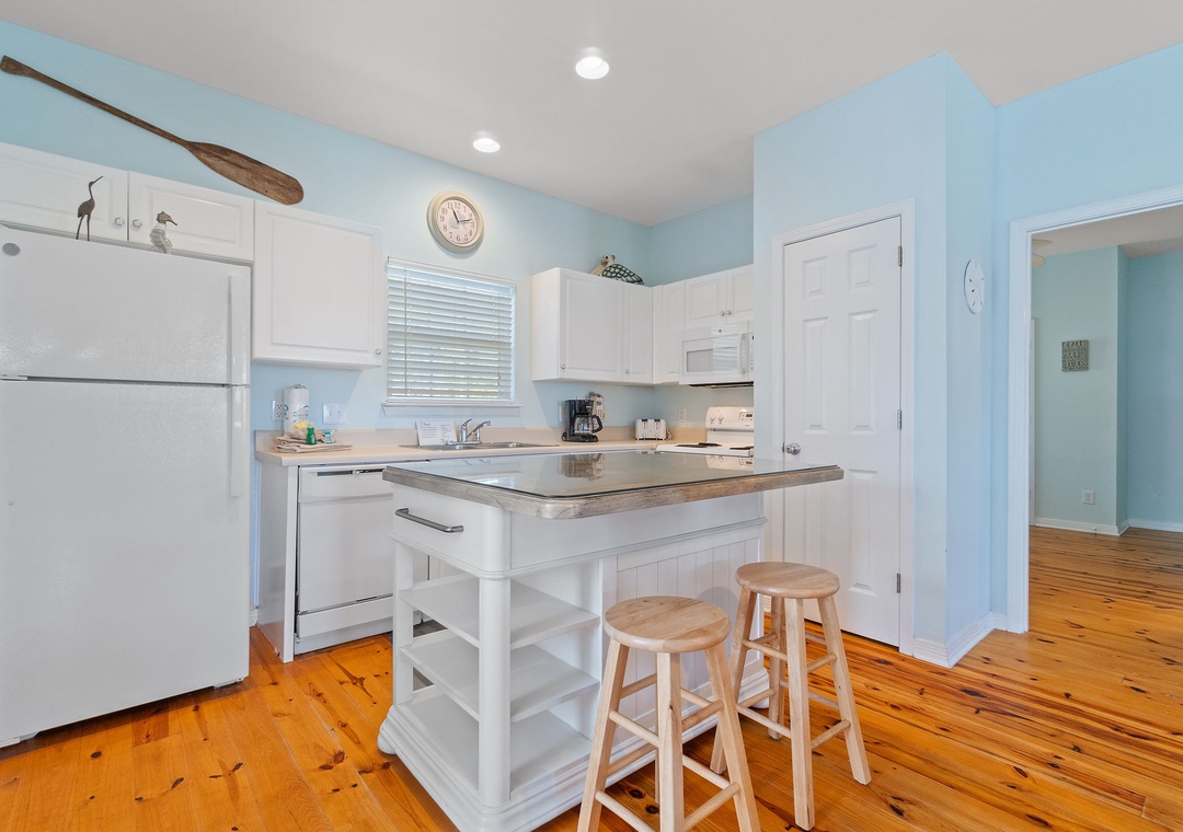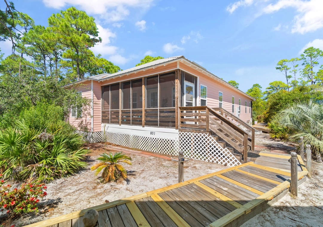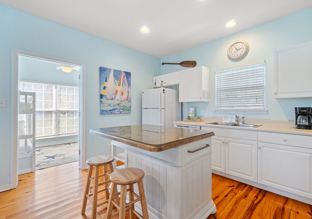 The Coral Coastal Cottage is decorated bright and cheerful, WiFi is included for your convenience. This unit offers a Queen Bed with a TV in the Master Bedroom and attached Private Bath. The first Guest Bedroom offers a Queen bed, and the second Guest Bedroom offers a two Full bunk beds with twin trundle beds! Perfect for the kids! The bedrooms are appointed with high quality mattress sets and high thread count linens, and the bathrooms are stocked with plush 100% cotton oversized towel sets. There is a full-size sleeper sofa in the living room, accommodating up to 12 guests! This unit also offers a full size washer and dryer, kitchen appliances--both large and small, cookware, and utensils. Park right in front of the cottage and no elevators to carry your things up. Just like being at home.