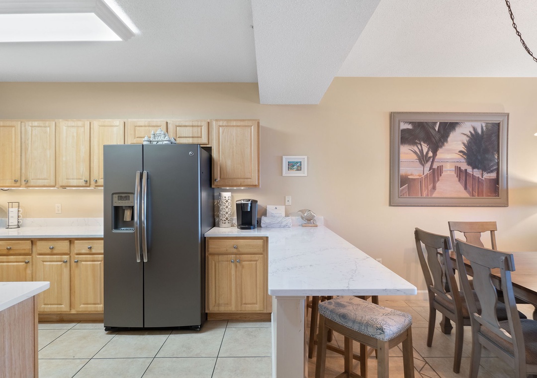 The kitchen is fully equipped to provide home-cooked meals for all your guests while enjoying the beautiful views of The Gulf of Mexico or head down to the resort’s charcoal grills to throw your catch of the day on the barbecue. All large and small appliances and utensils are available for guest use in the unit.