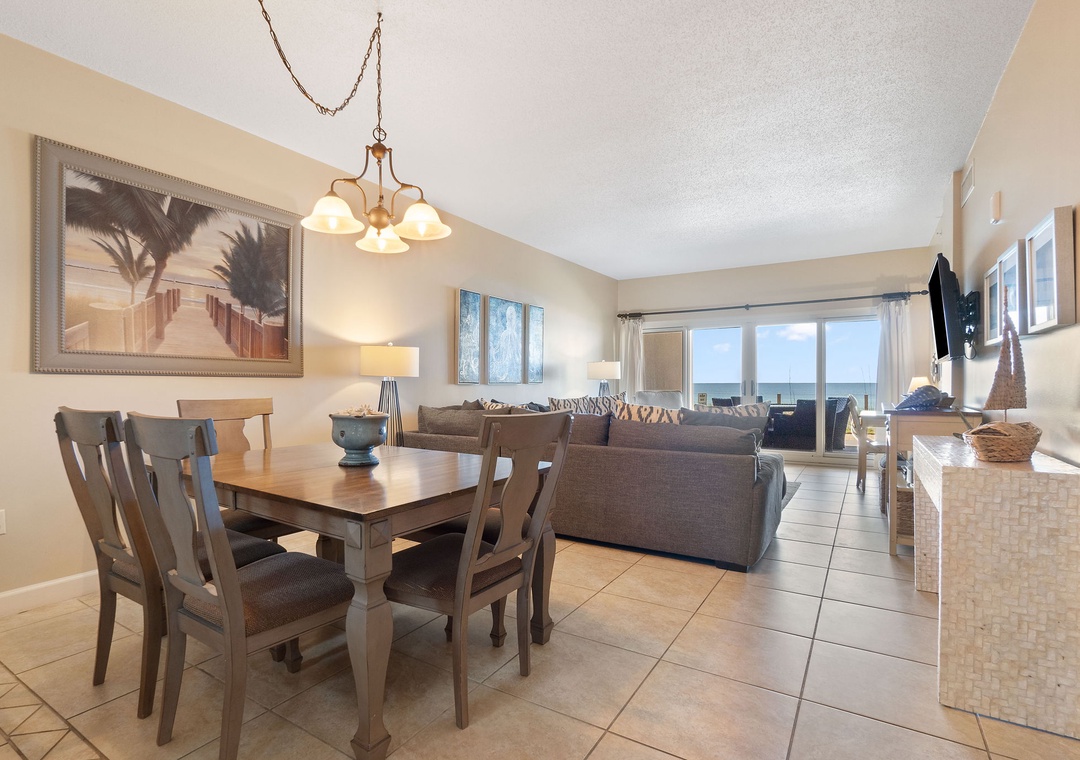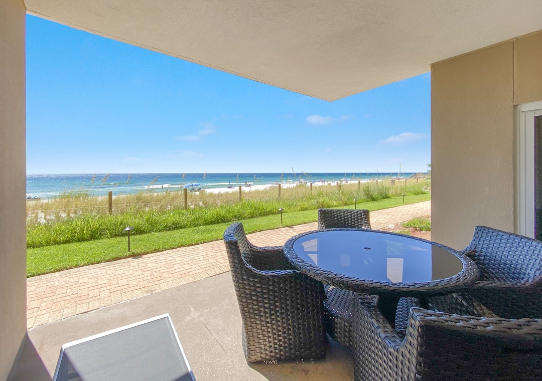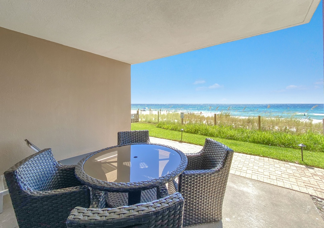 The highlight of this condo is its marvelous view. Floor-to-ceiling sliding glass doors open to the expansive, beachfront covered terrace, and with plenty of seating you can enjoy your favorite beverage and even savor a delicious meal while delighting in panoramic vistas of the sparkling Gulf Coast!