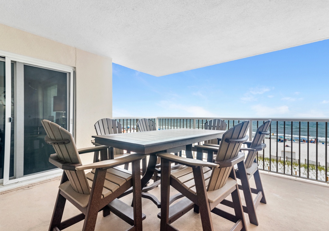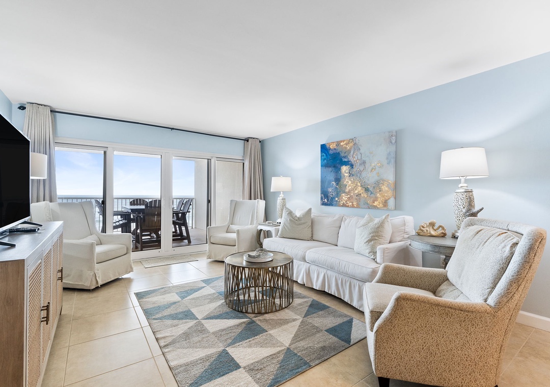 This spacious unit offers an open concept layout connecting the living area, dining area and kitchen into one comfortable space! The living room includes plush sofa seating, including an additional cushioned chair, and most importantly, a beachfront balcony overlooking the glistening Gulf! Enjoy your morning coffee or a glass of wine while lounging on your expansive balcony.