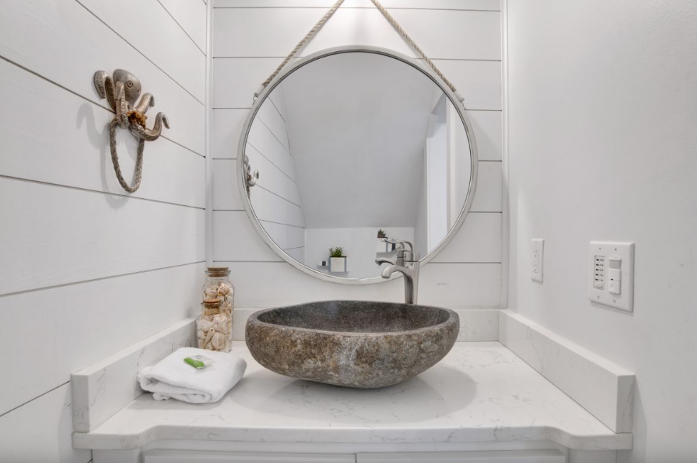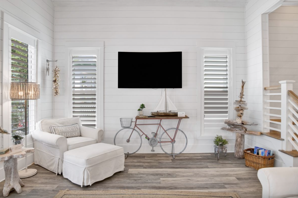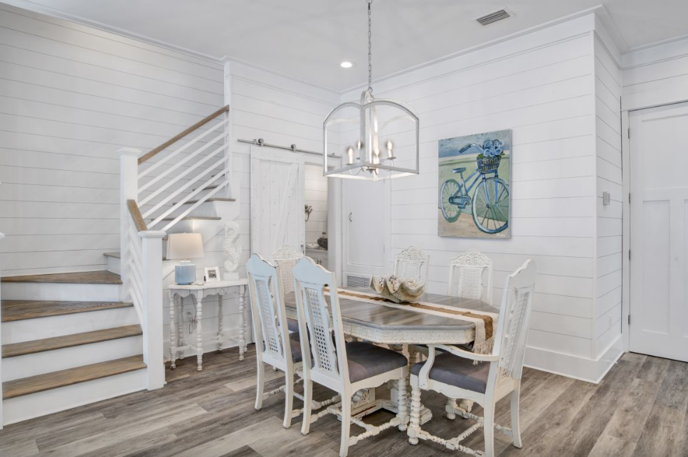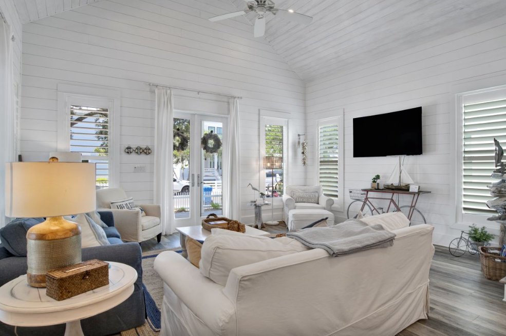 Inside, the main living area features an inviting open-concept layout highlighted by coastal-inspired décor, designer furnishings, and thoughtful details throughout. The living room offers plush seating and a wall-mounted Smart TV, creating a comfortable space for movie nights or unwinding after a day in the sun. Adjacent to the living area, the dining space comfortably seats six at a charming farm-style table, while the fully equipped kitchen boasts stainless steel appliances, elegant countertops, and a spacious island with additional seating.