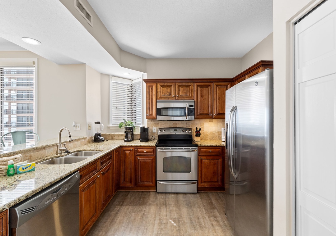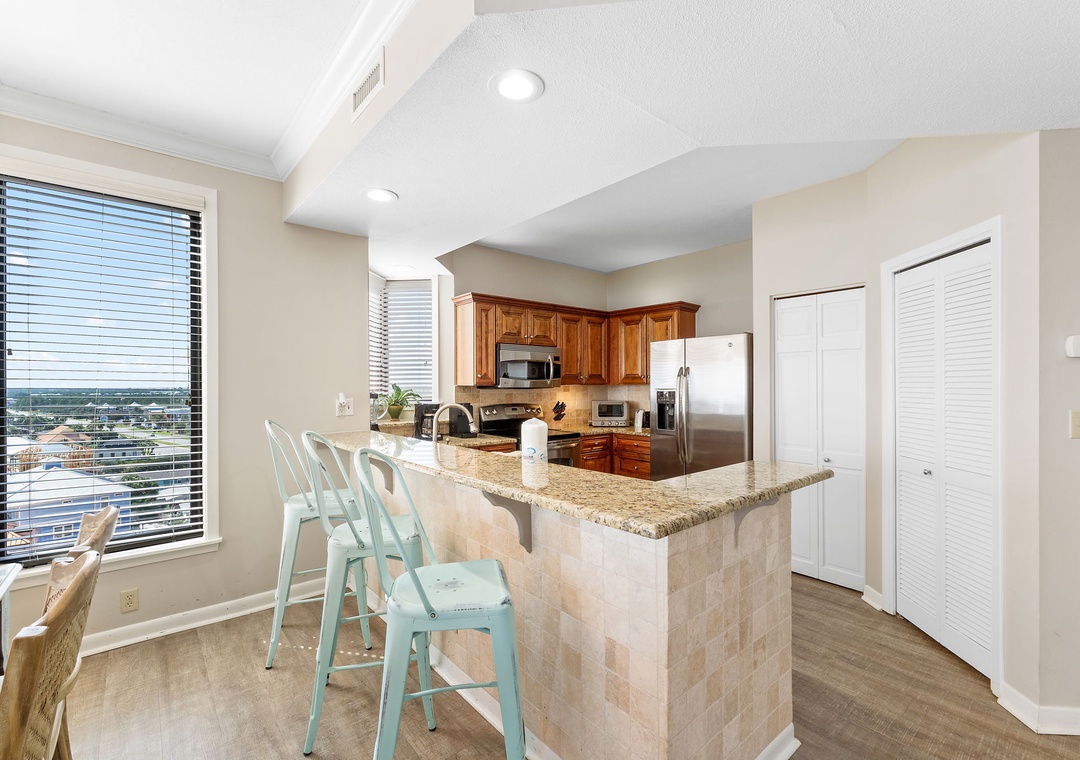 The beautiful gourmet kitchen offers everything needed to inspire your inner-chef, boasting updated stainless steel appliances including a side-by-side fridge with in-door ice and filtered water dispenser, granite countertops, custom cabinetry, custom tiled backsplash and all the small appliances, utensils and cookware needed to prepare a culinary masterpiece. You can even shake up the perfect martini or mix your favorite cocktail at the convenient wet bar! The dining area seats 6, with additional seating for 3 at the breakfast bar.