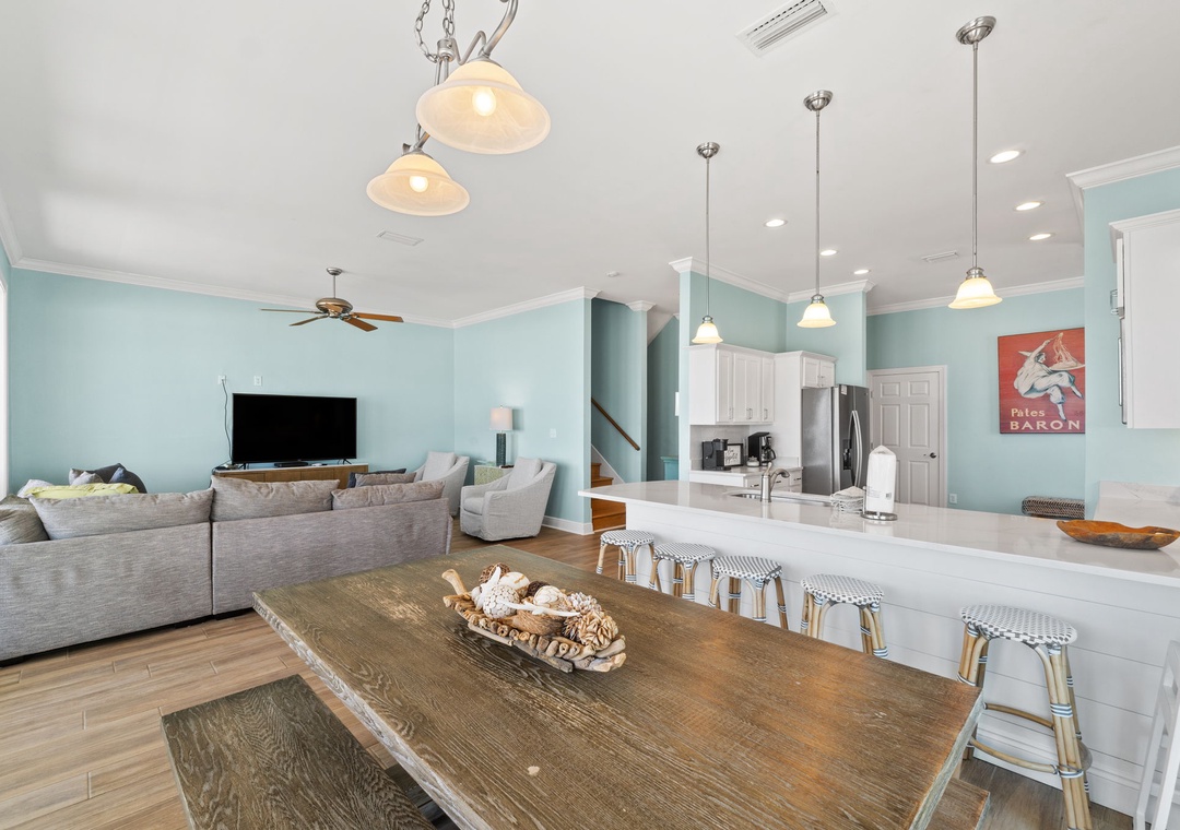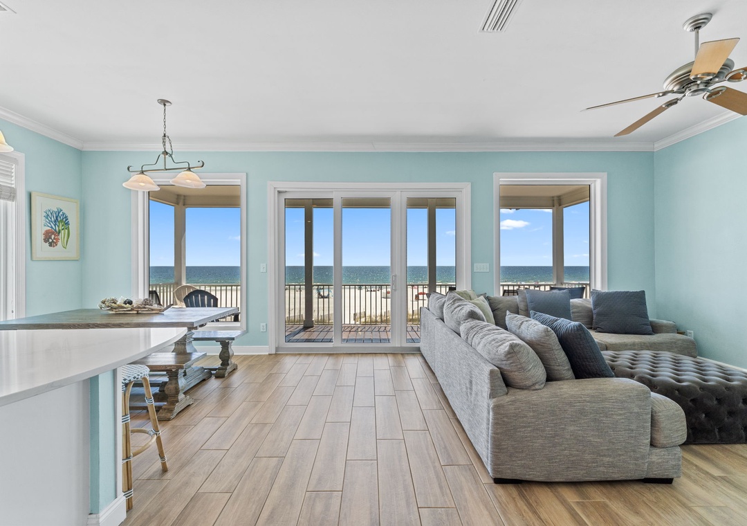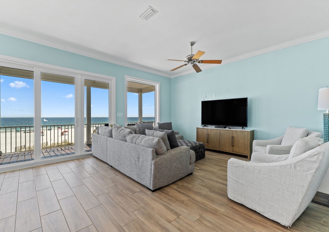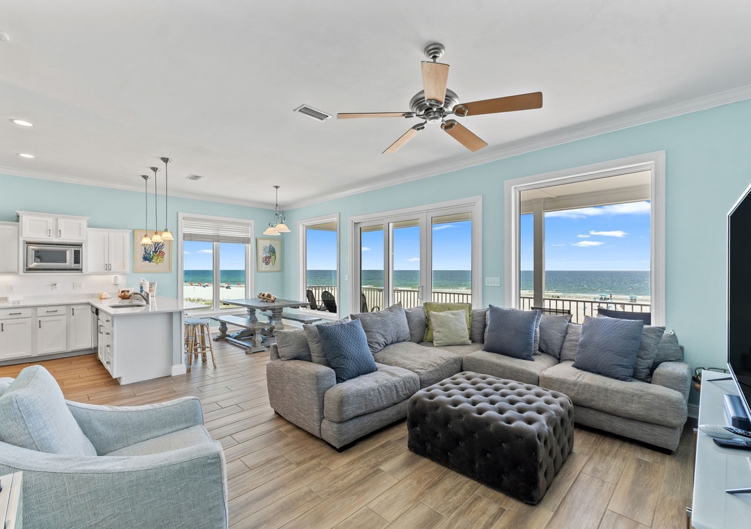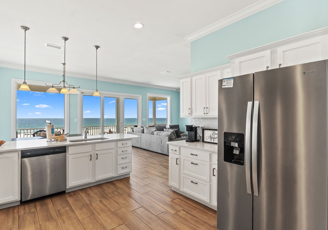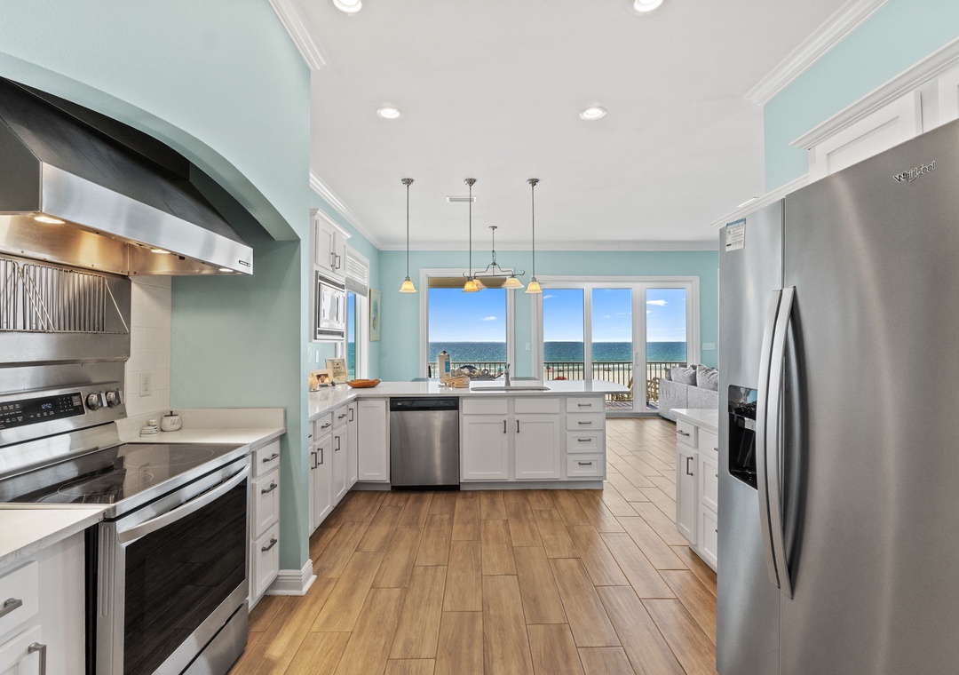 Welcome to SeaNile Beach House, a stunning tri-level Gulf-front retreat where panoramic views and coastal elegance meet. This 4-bedroom, 4-bath home offers 2,760 square feet of beautifully designed space, with floor-to-ceiling windows that frame endless beach vistas. The open-concept living area features a cozy gas fireplace and plenty of room to gather, while the fully equipped kitchen boasts stainless steel appliances, granite countertops, a wine cooler, and everything you need for effortless entertaining.