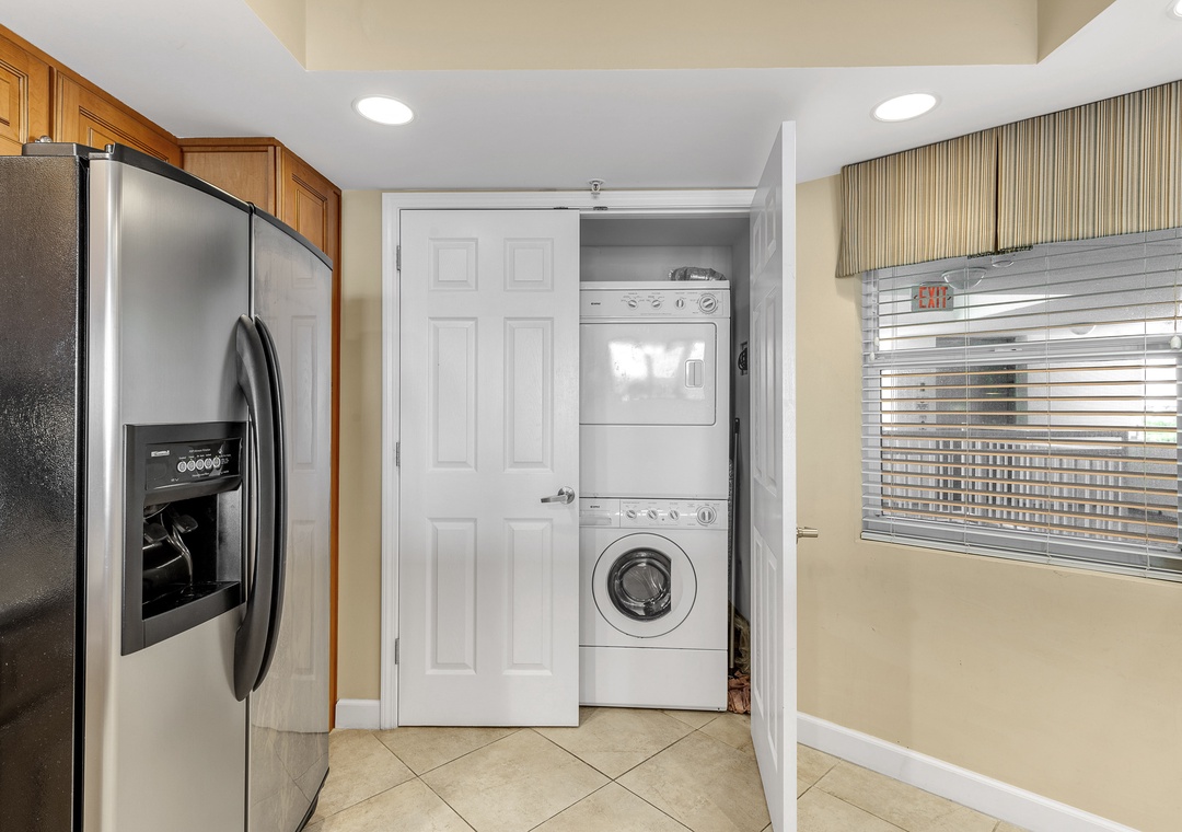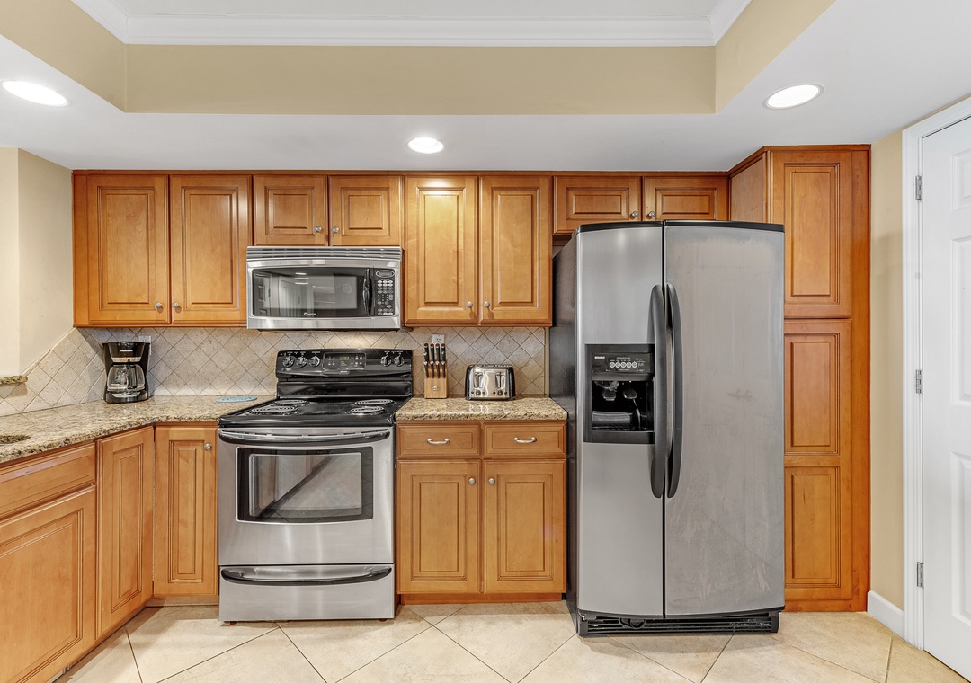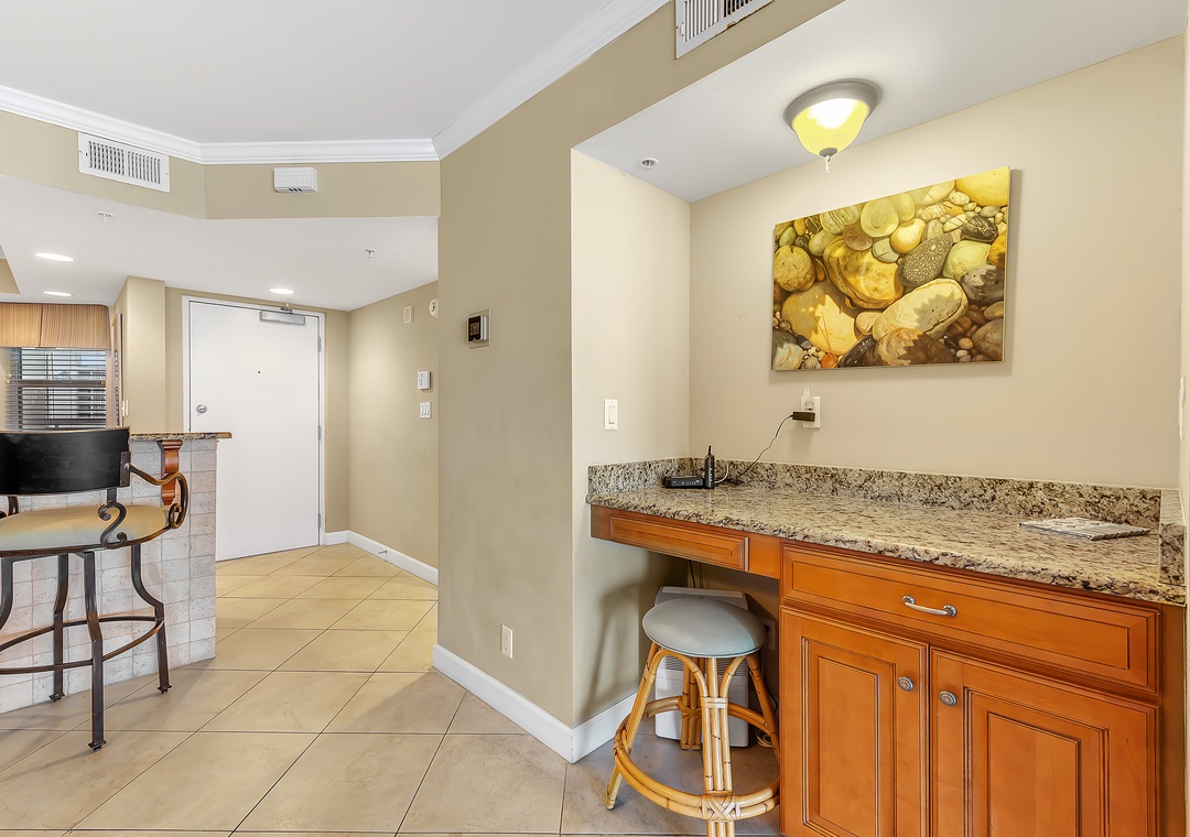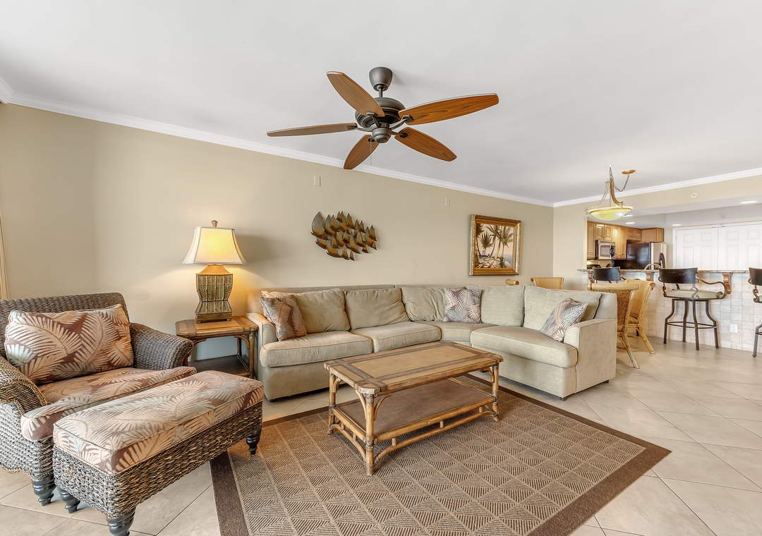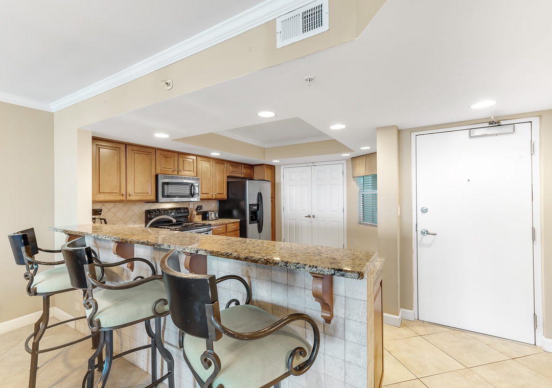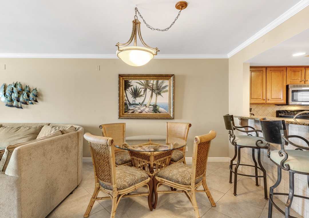 This unit provides open access to all of the spacious entertaining spaces. The living room features a plush sofa. The beautiful dining area has seating for four around the dining table and more seating that the breakfast bar. The kitchen hosts ample prep space and updated appliances.