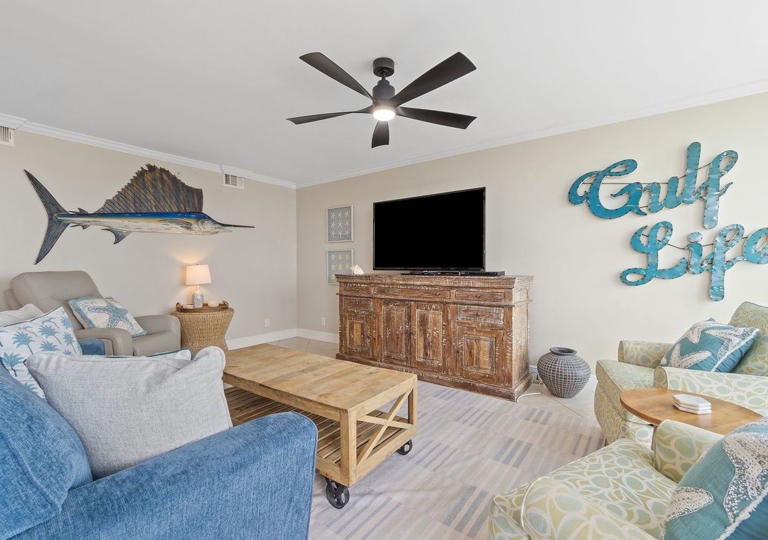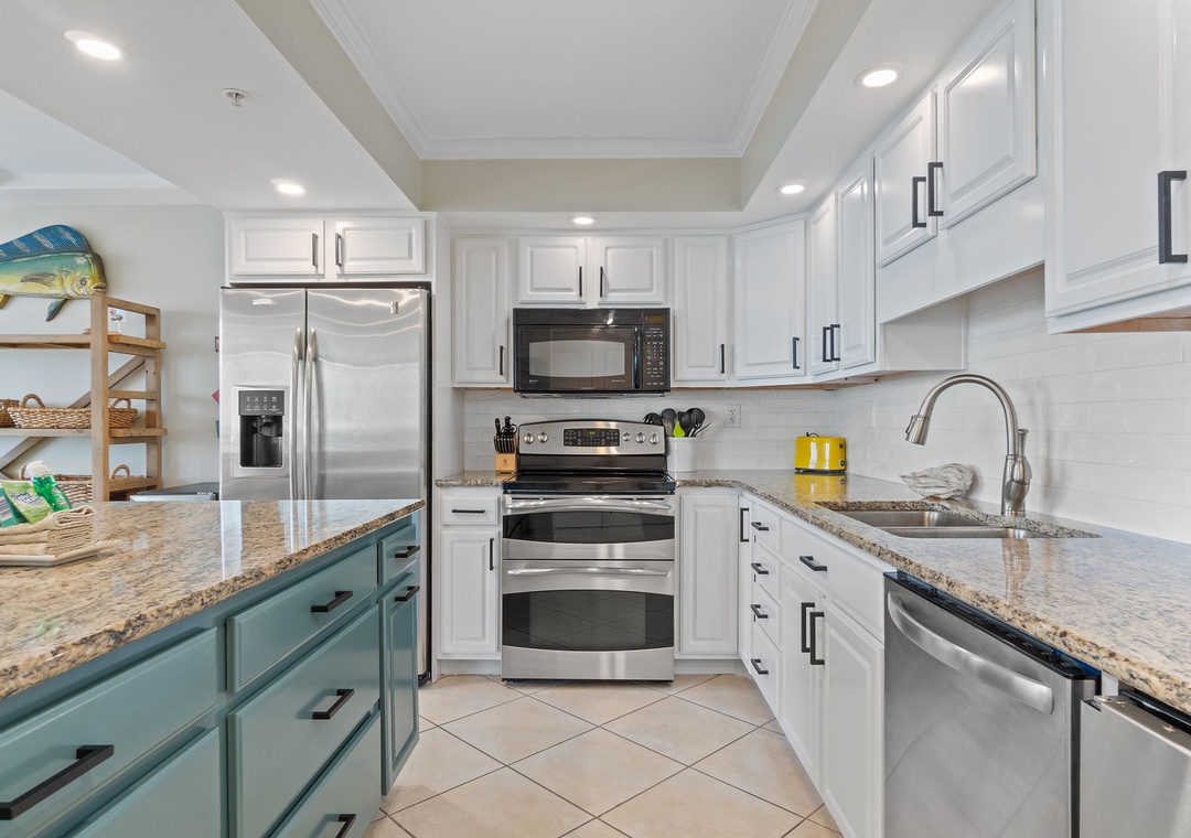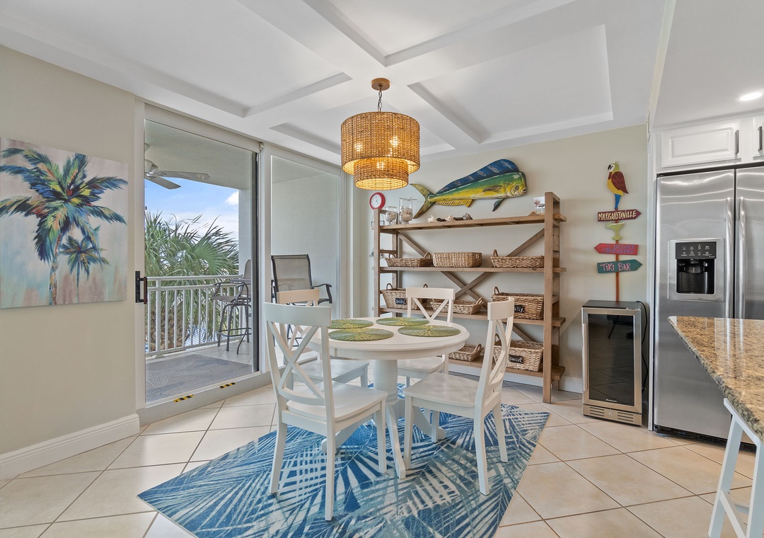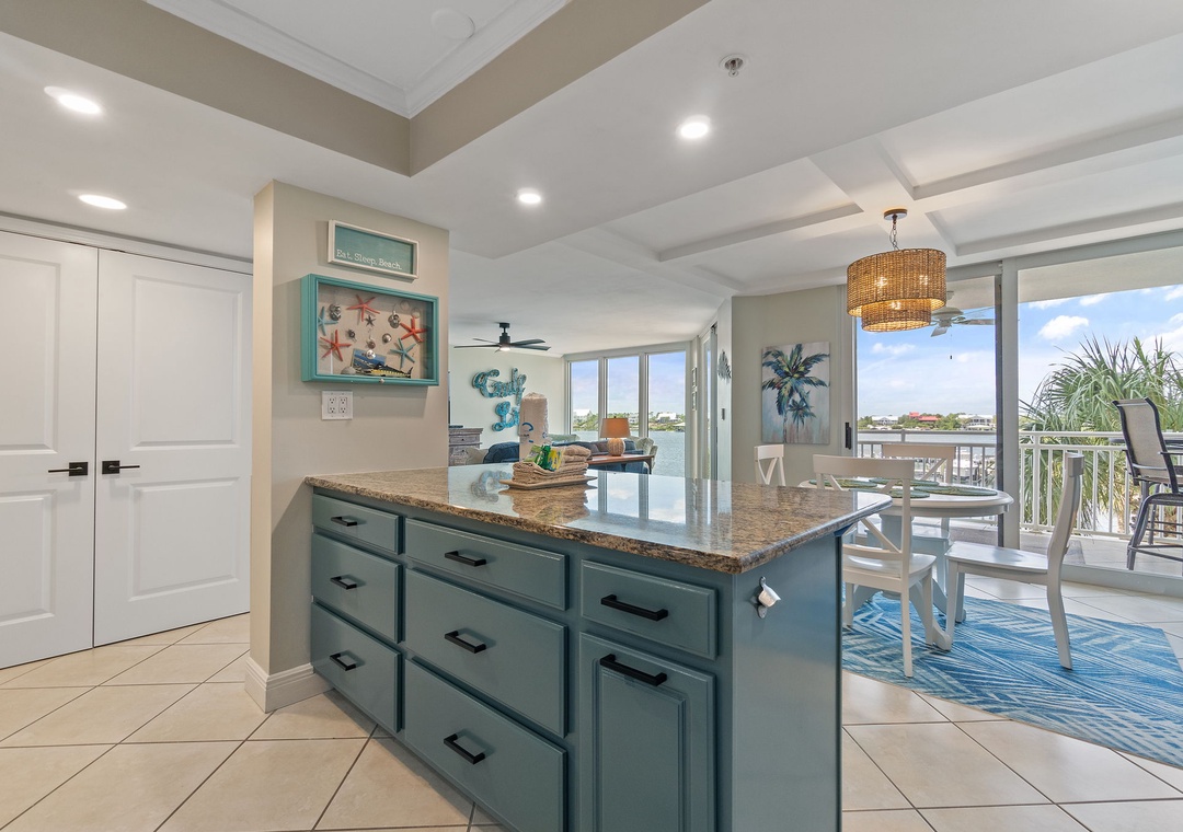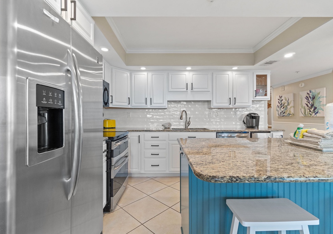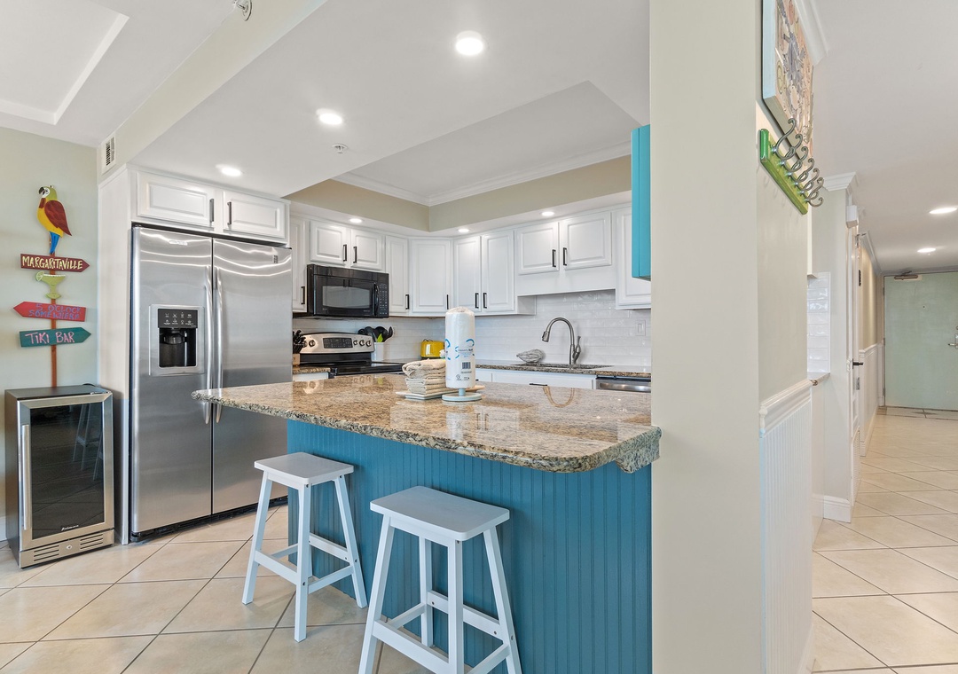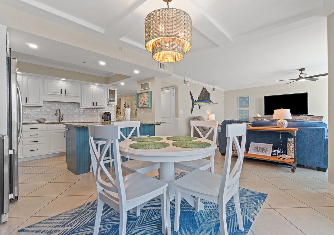 The condo’s gourmet kitchen is a chef’s dream, fully stocked with high-end appliances, cookware, and utensils. Whether preparing a quick breakfast or a gourmet dinner, you'll find everything you need to create delicious meals. The adjacent dining area comfortably seats four, making it perfect for enjoying meals with family or friends.