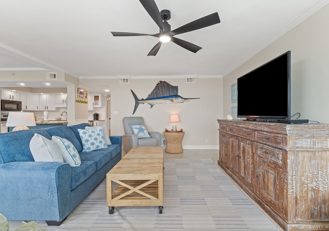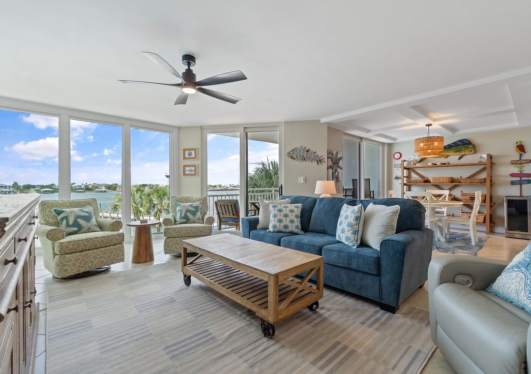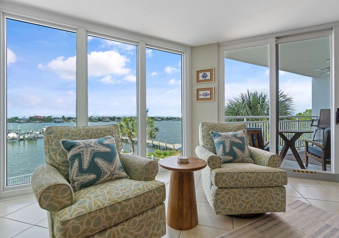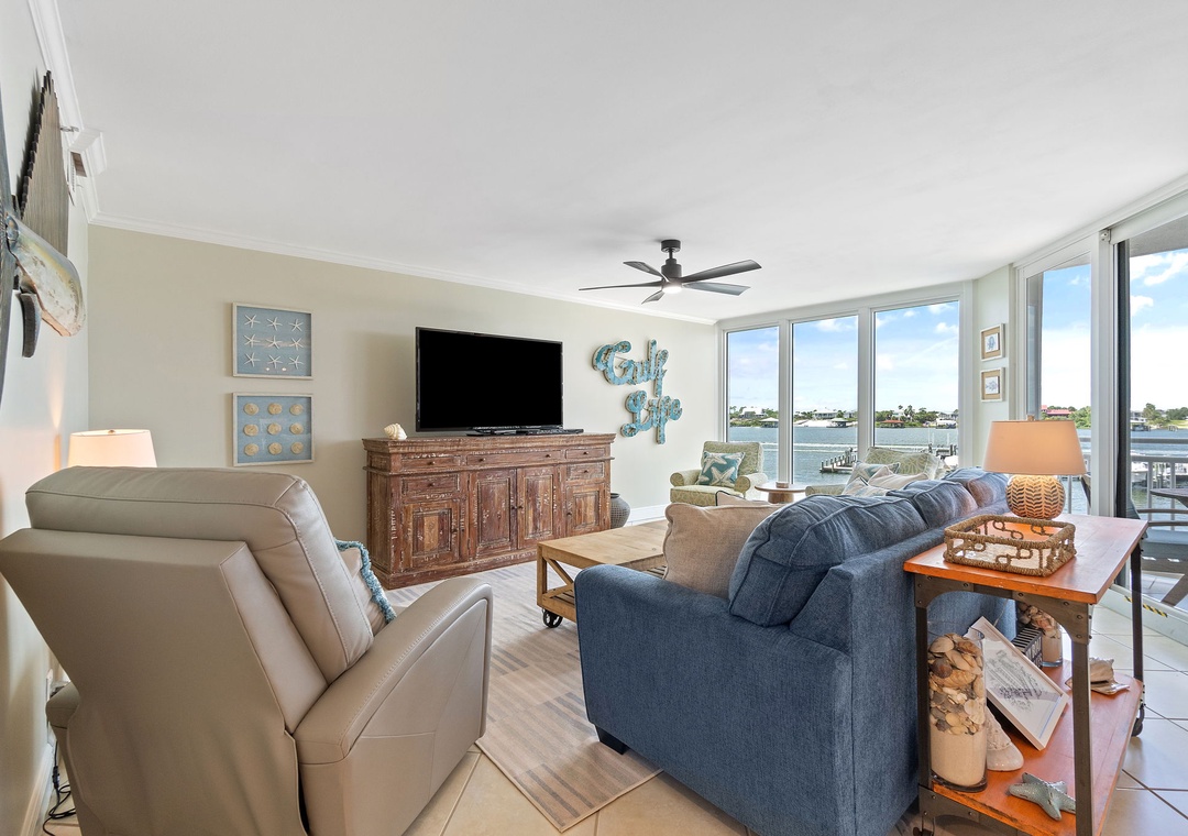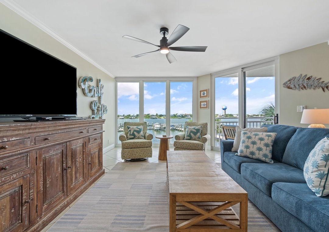 Upon entering SeaSpray Riverside 313, you'll be greeted by a spacious open-concept living area, bathed in natural light from the floor-to-ceiling windows that frame breathtaking views of the tranquil river. The living room features elegant furnishings, a cozy sofa, and a large flat-screen TV, creating an inviting space for unwinding after a day of exploring. Step out onto the private balcony to enjoy your morning coffee or an evening cocktail as you watch the sun set over the water, painting the sky in hues of orange and pink.