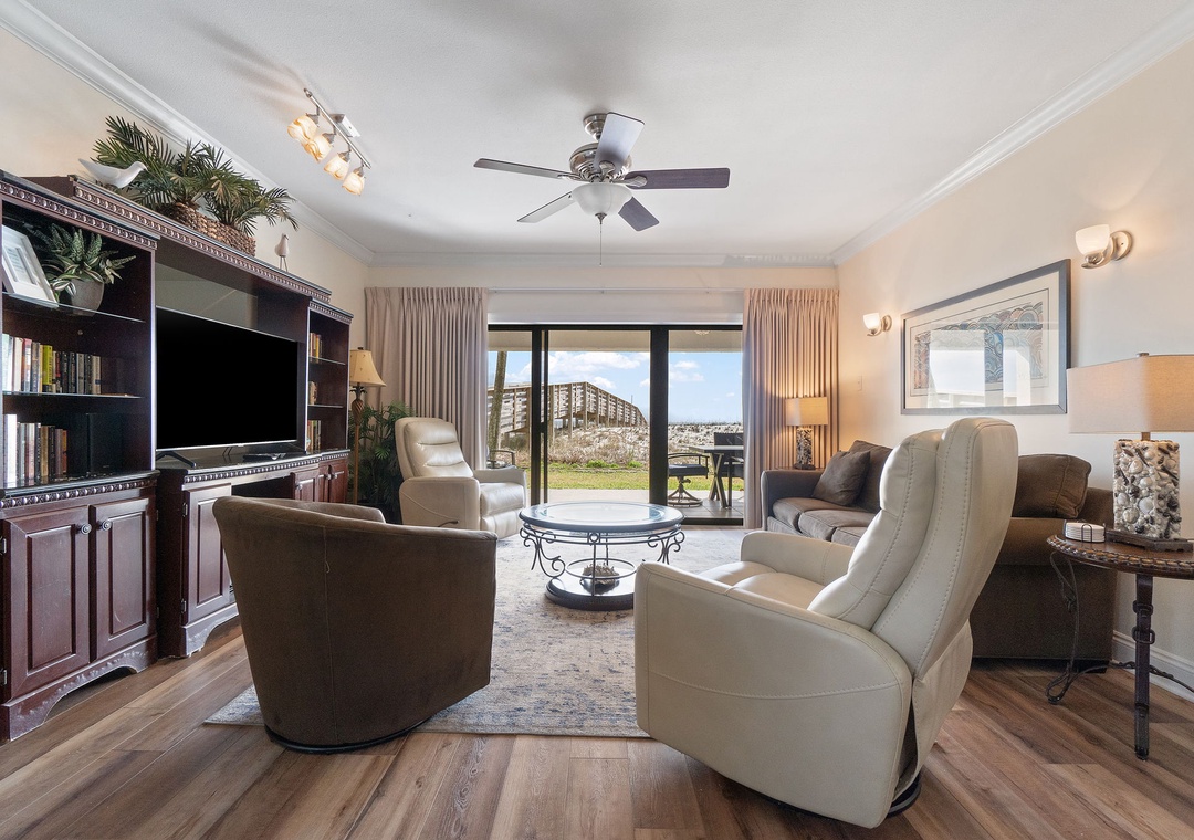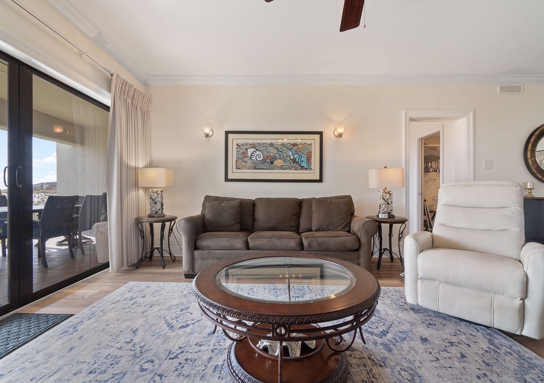Floor-to-ceiling sliding glass doors open to the expansive covered terrace, and with comfortable furniture for the whole group to enjoy their favorite beverage and even savor a delicious meal while delighting in panoramic vistas of the sparkling Gulf Coast.