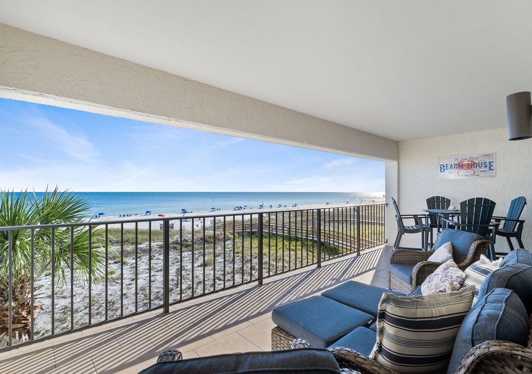 The ginormous balcony is what sold us on this unit and we were not disappointed by the size, the furnishings, or the view from the balcony. I will say in exchange for it feeling like a private extension of your living space, you give up any air movement in the evening and it can get a little warm. On the flip side, if it rains you can still enjoy your view and being outside as it is wide enough to keep you dry, even during a thunderstorm. The kitchen is the best stocked kitchen, that I’ve ever seen - seriously everything you could want from serving platters to a crockpot. The only thing missing were nice wine glasses and this is a personal issue of mine so I pack my own when driving to my destination. Other reviews mention that the furniture and decor is somewhat dated, and I agree, that is somewhat true, but the space is incredibly clean, well laid out and spacious. We have rented a lot of condos along the Panhandle over the years and this one was one of our favorites for sure.- Reviewed On: 9/27/2021