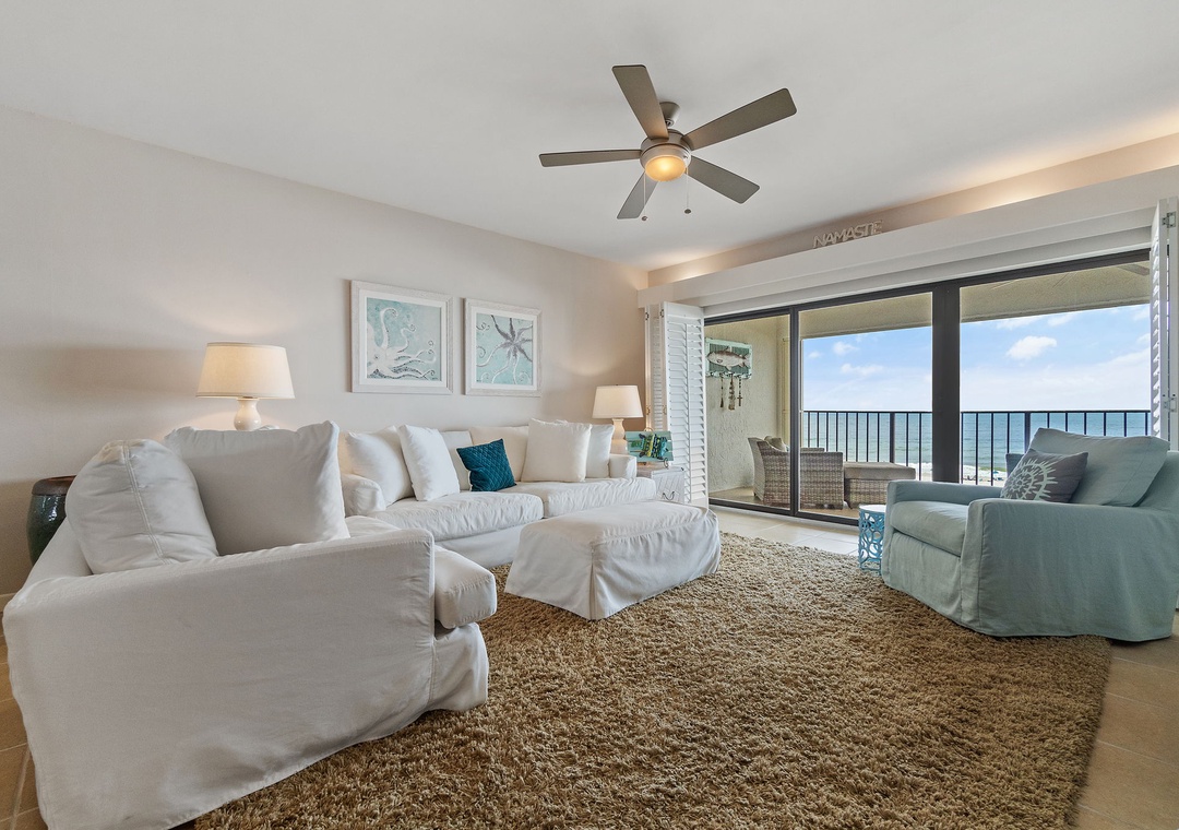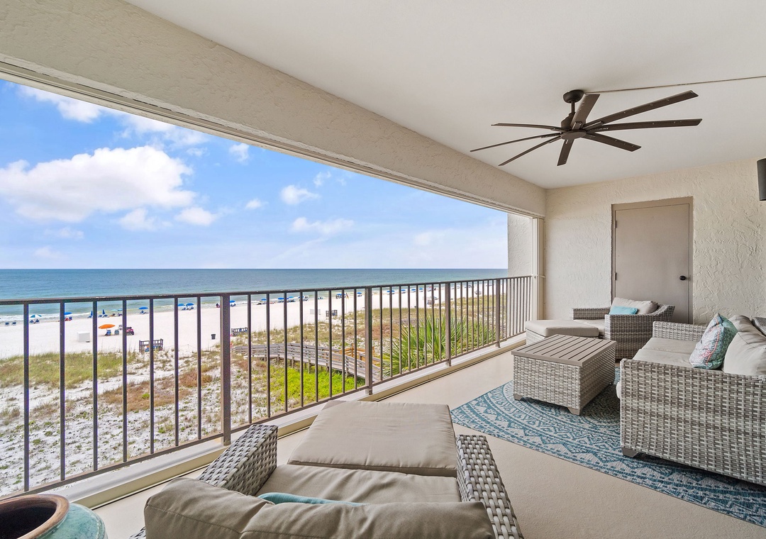 Discover the ultimate Gulf Coast getaway in this luxurious 4th floor, 2-bedroom, 2-bath condo at Shipwatch Surf and Yacht Club in Perdido Key, Florida. Located along the stunning emerald waters and pristine white sands of the Gulf, this property offers breathtaking views, tropical landscaping, and a beachfront pool just steps from the shoreline. With an average annual temperature of 75 degrees, you can enjoy the beauty of these picture-perfect beaches year-round. The open-concept living space is designed with a coastal flair, featuring stylish furnishings and floor-to-ceiling glass doors that lead to a spacious balcony overlooking the Gulf. Whether you're sipping coffee at sunrise or enjoying a sunset with a glass of wine, the panoramic views of the sand, sea, and sky are truly unforgettable.