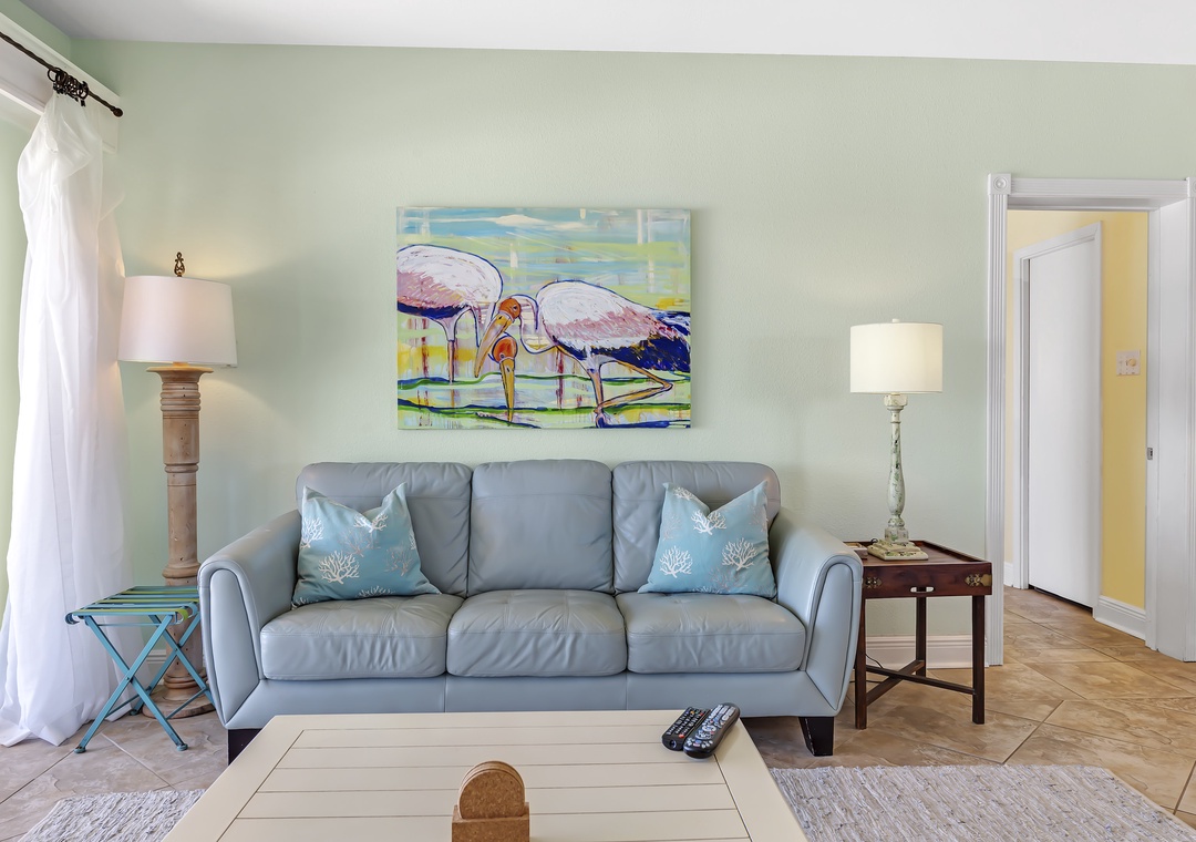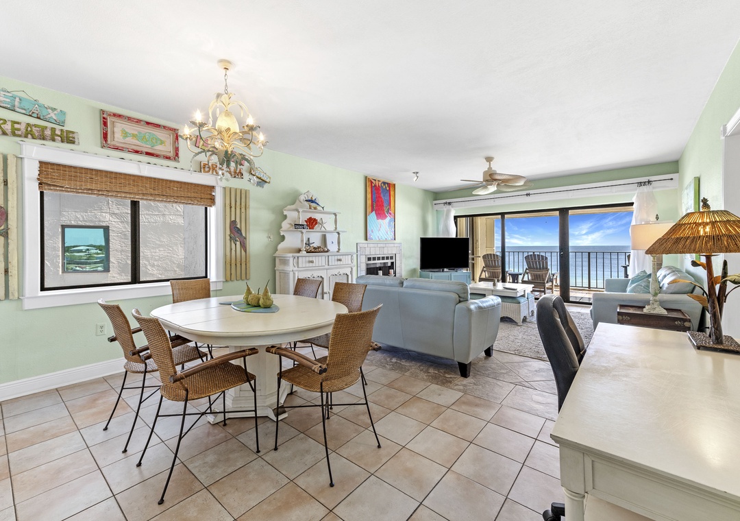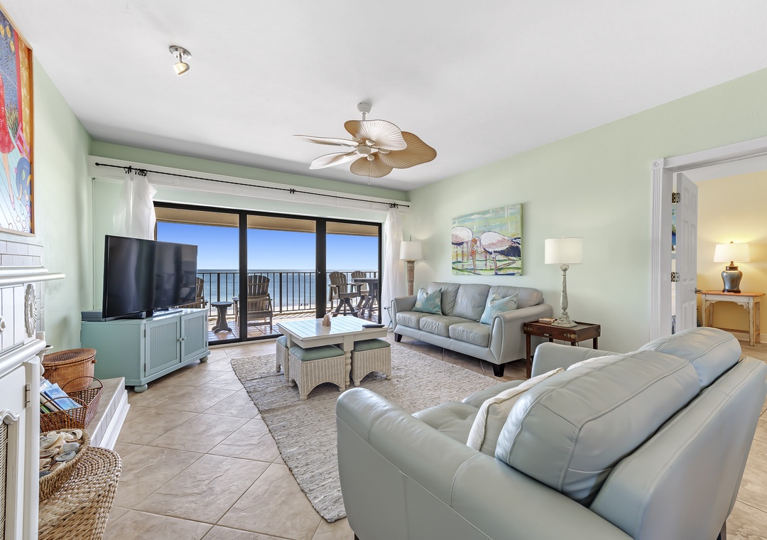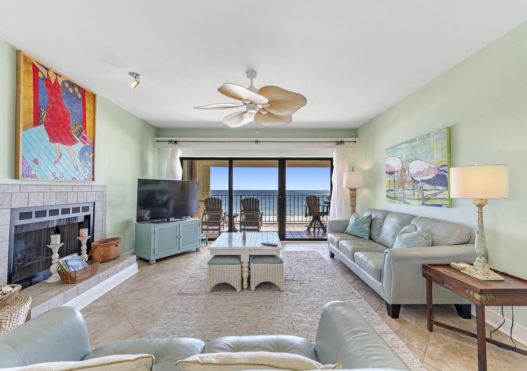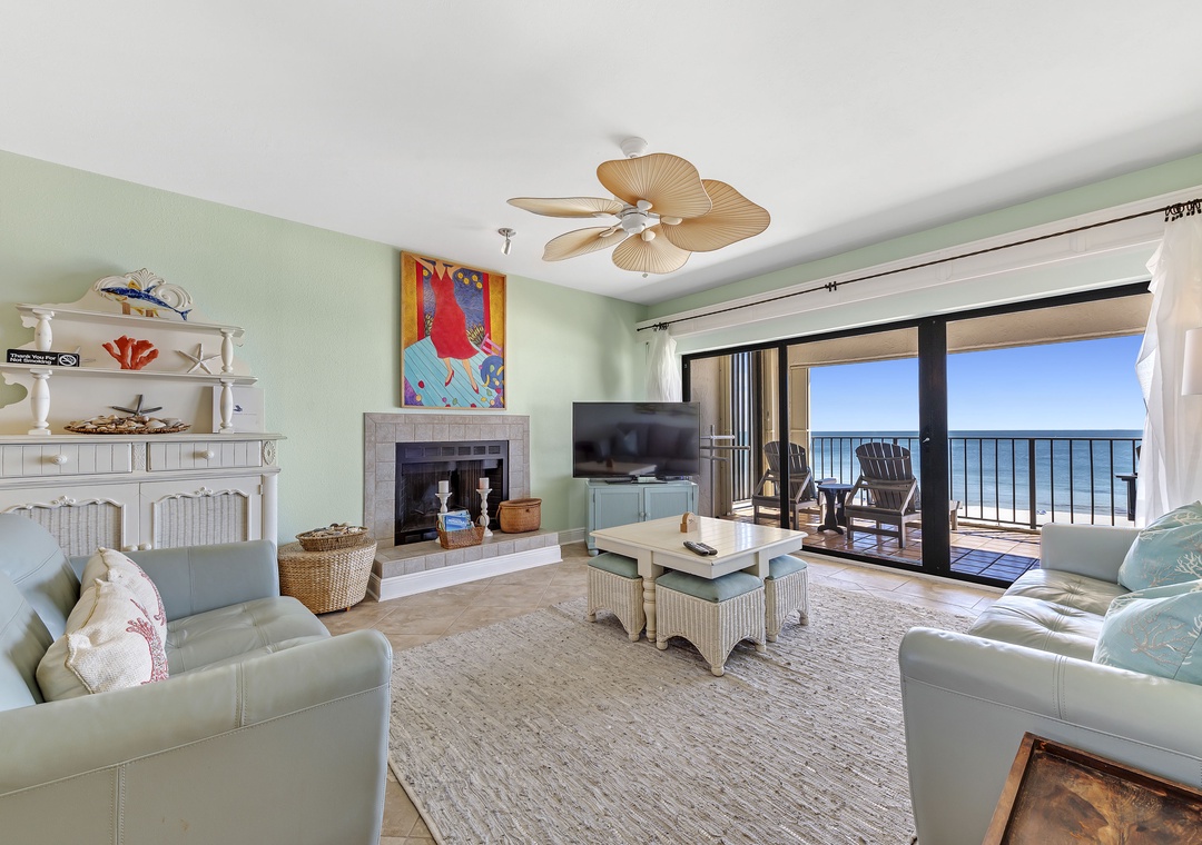 Make the most of your next vacation at this stunning 3-bedroom, 2-bath condo on the 5th floor of Shipwatch Surf and Yacht Club in Perdido Key, Florida. This spacious unit features an open-concept layout with designer furnishings, modern electronics, and a stylish beach-chic decor. Soft neutrals, pastel blues, and aquas, accented by pops of coral and red, create a fresh and inviting atmosphere. Nautical-inspired art adds a cozy coastal touch, making it the perfect setting for a beach getaway. The living area is ideal for relaxing with the family, offering a plush sofa, cushioned chairs, a fireplace, and a large flat-screen HDTV. Step through the sliding glass doors to access the beachfront balcony, where you can unwind and take in the beauty of the Gulf.