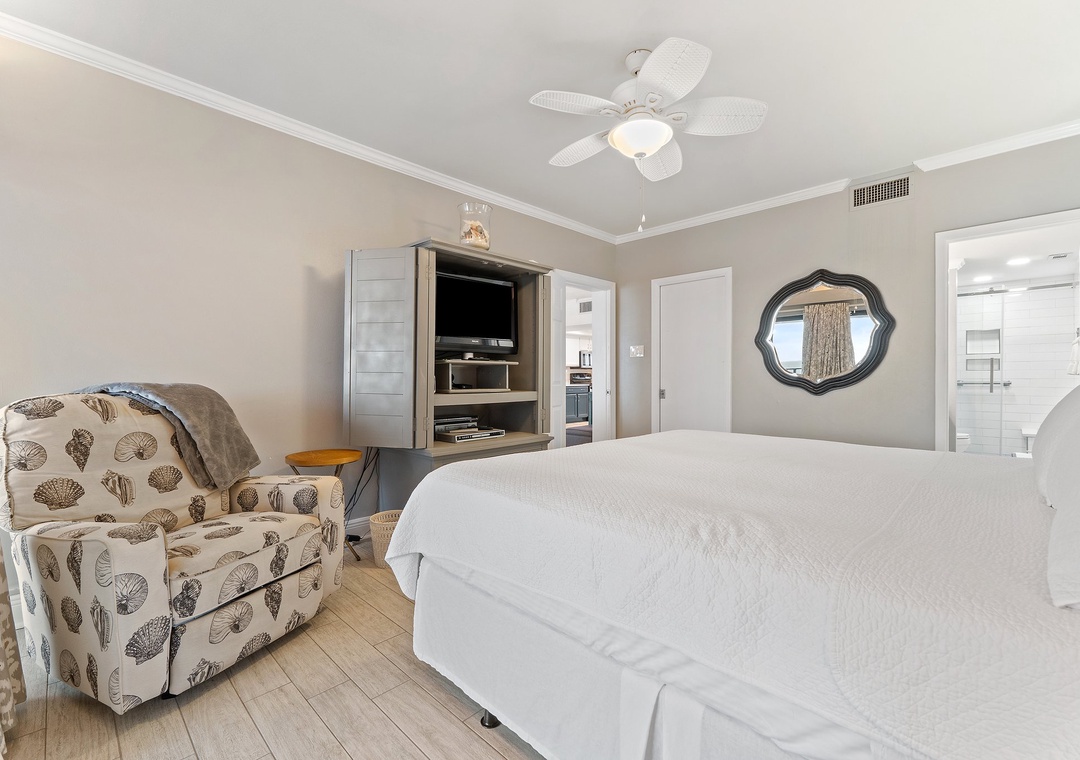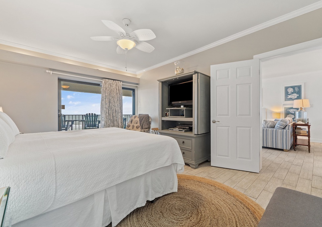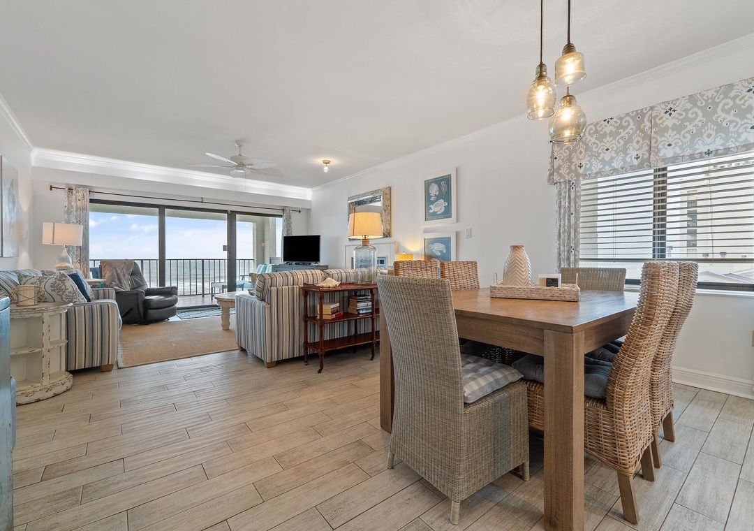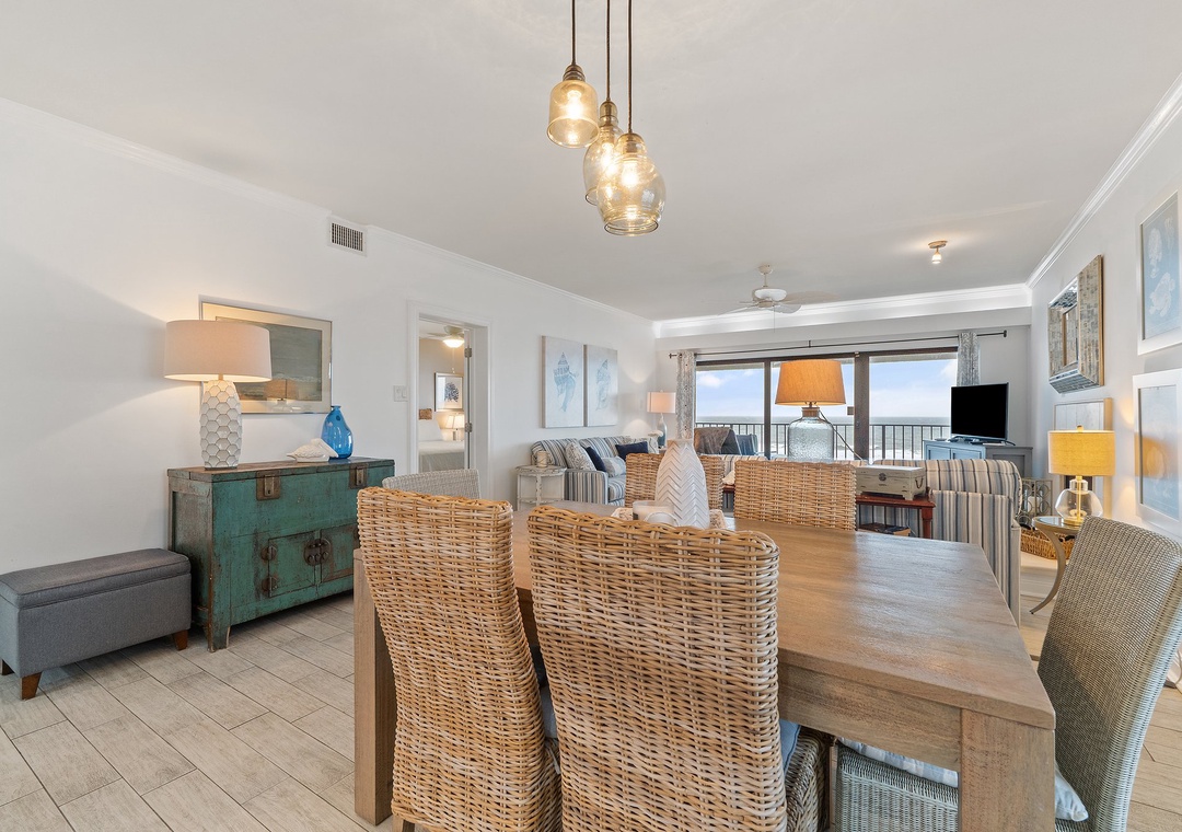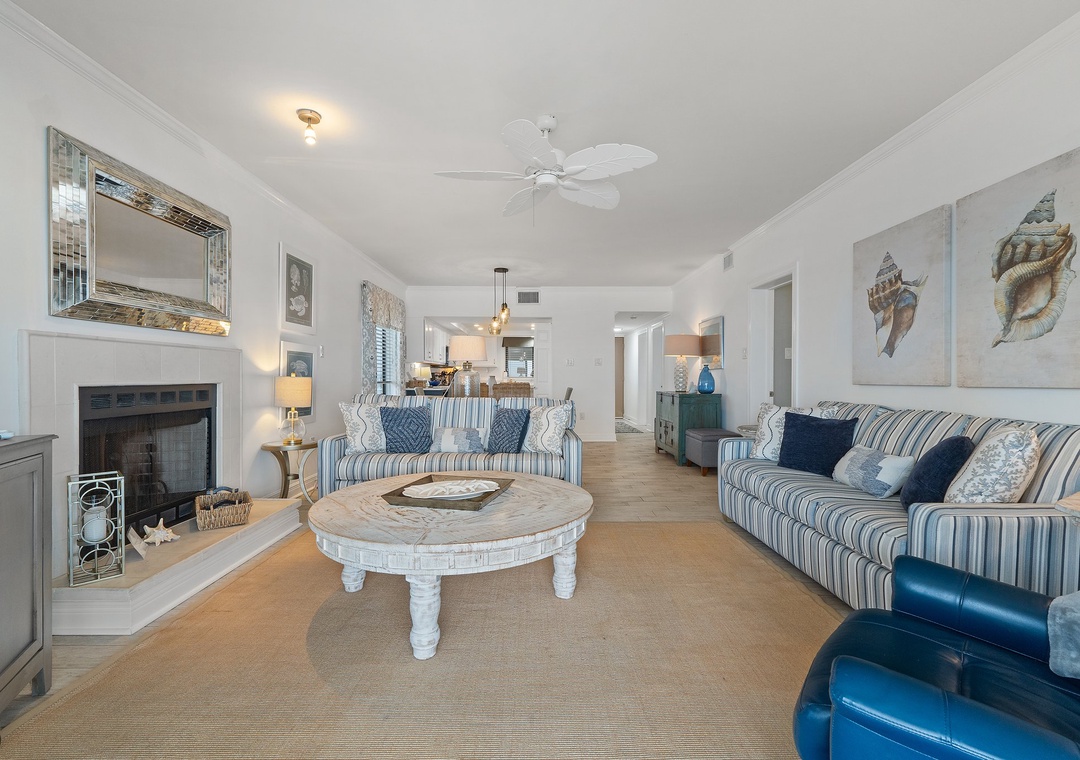 Step onto your sprawling covered terrace through the floor to ceiling glass doors and gaze out into the infinite vastness of the Gulf of Mexico, where the soft quartz sands and emerald turquoise waters of the Gulf of Mexico stretch into an endless horizon. Enjoy your morning coffee while the sun rises over the Gulf, or share a bottle of wine with friends while the moon's reflection glistens over the water, and the hypnotic sounds of the waves relax your mind and soothe your soul! This charming unit features a spacious open-concept layout, comfortable furnishings and appealing decor throughout. Lounge with the family for movie night in the living area, complete with a plush sofa and two cushioned chairs, a fireplace, and flat screen television! Snuggle up with a good book by the fire, or binge watch your favorite show all in one cozy space.