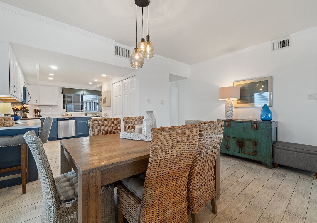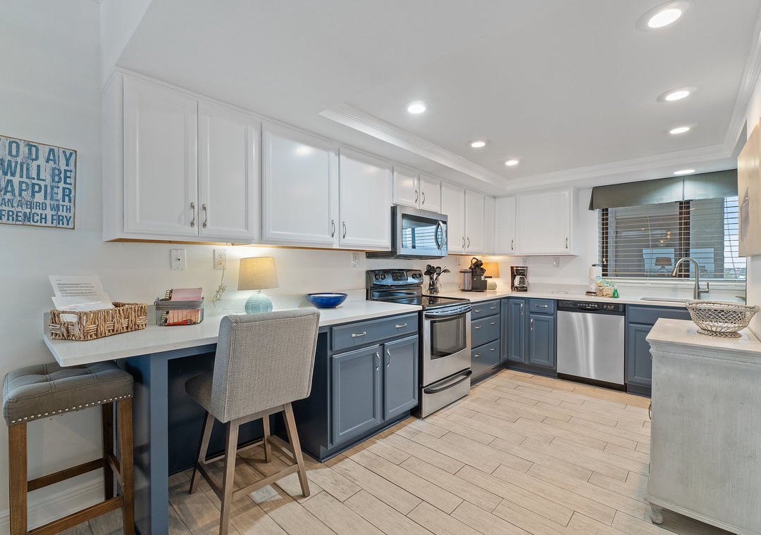 The gourmet kitchen features custom cabinetry, stainless steel appliances, plenty of counter space, plus all the cookware, dishware, utensils and small appliances needed to prepare a culinary masterpiece. Eat breakfast at the bar right off the kitchen and enjoy your supper while watching the sky change from tranquil blue to fiery pink from your gorgeous wooden dining room table with enough room to seat 6!