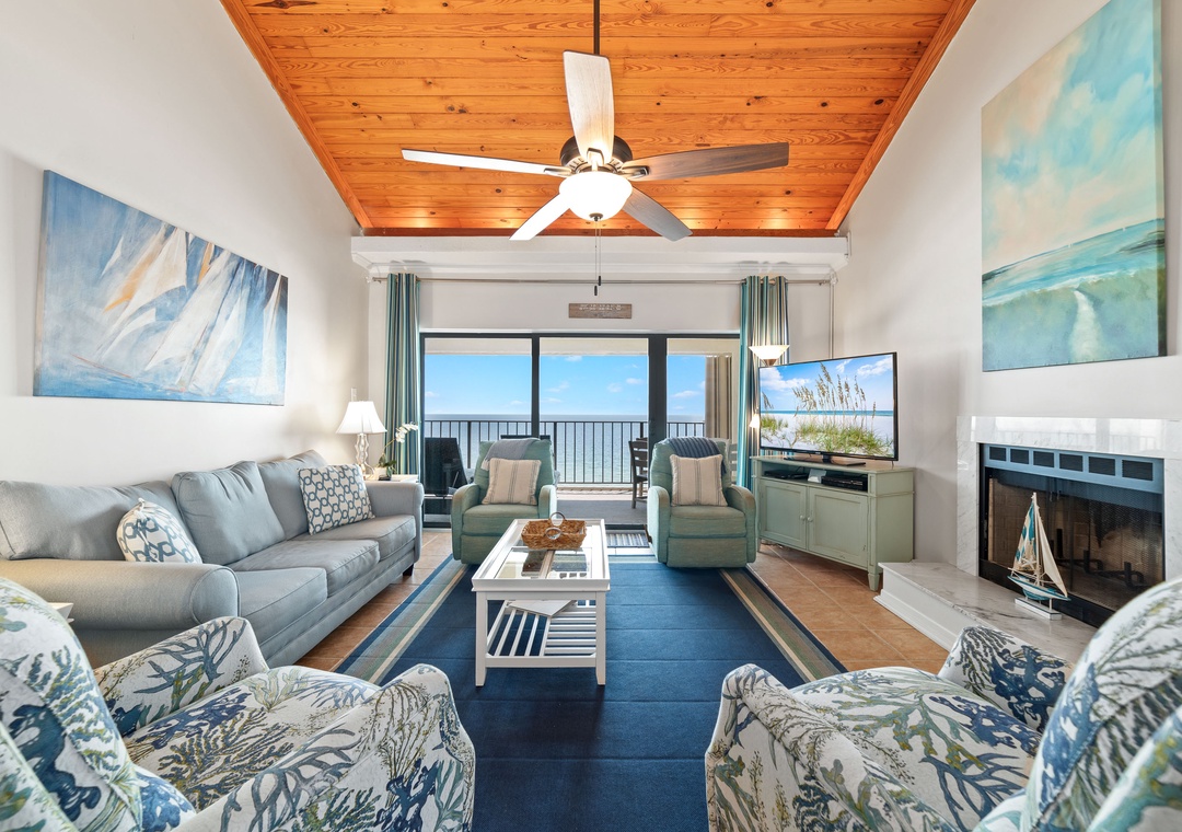 Adorned in a nautical cottage decor, with sea-inspired hues of blue and aqua paired with relaxing neutrals and rustic wood finishes, this Gulf front retreat will transport you into a state of peaceful relaxation. The living room offers a beautiful vaulted ceiling with wood detail, plus a wood-burning fireplace, creating the ultimate space for cozying up with friends and loved ones.
