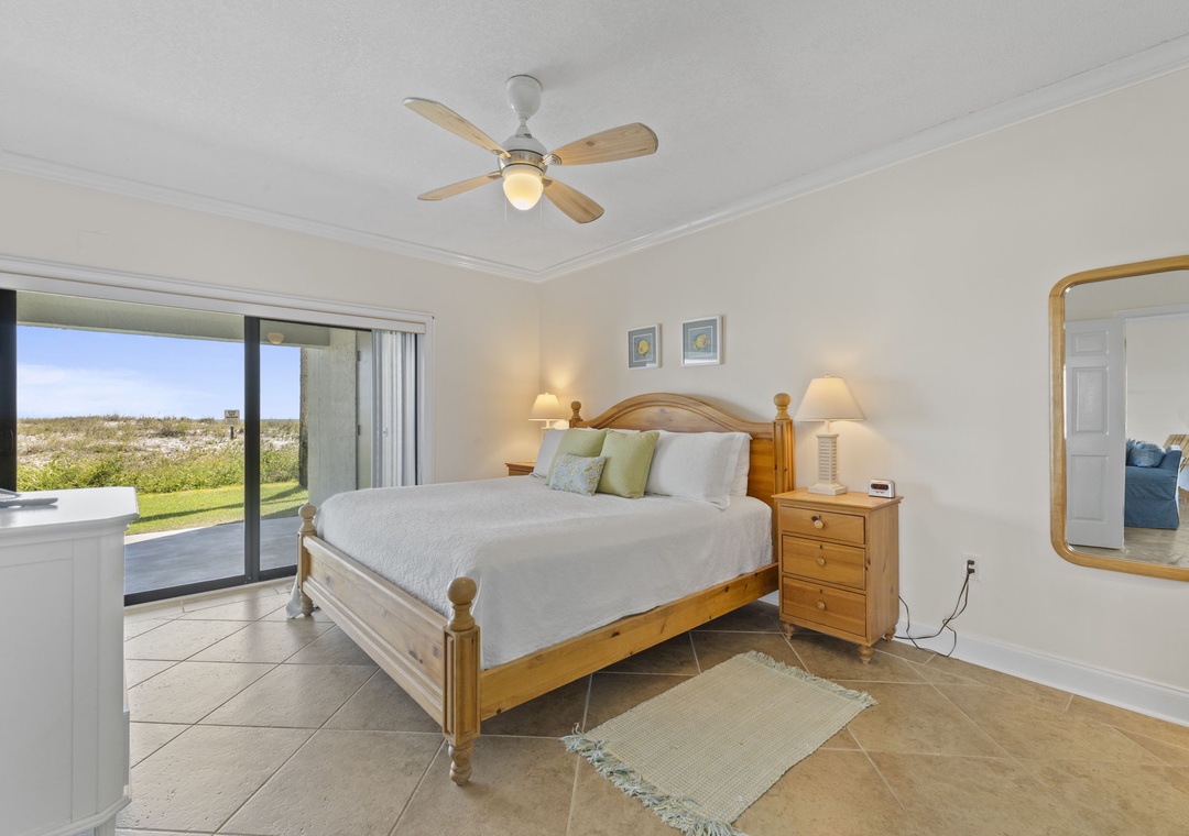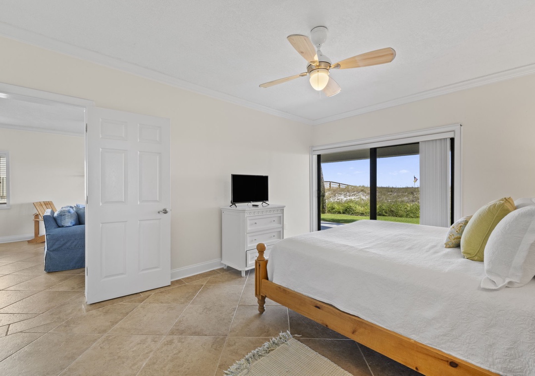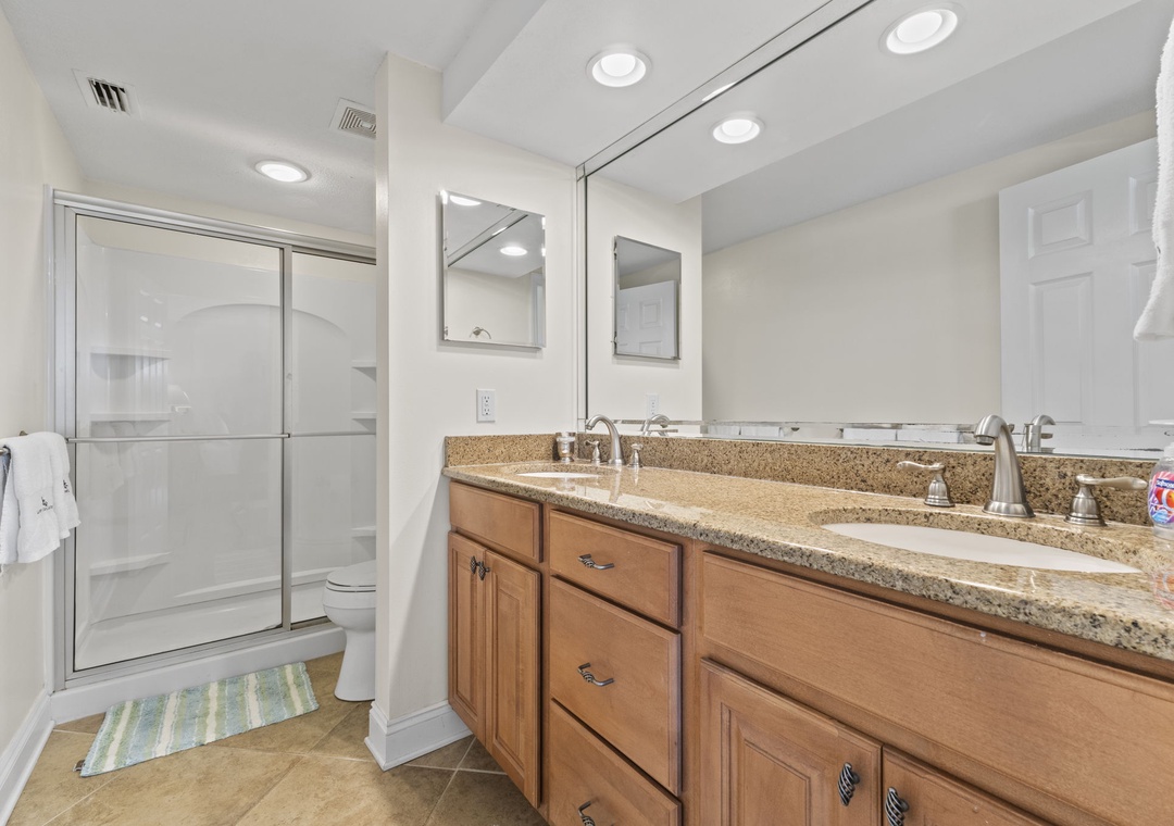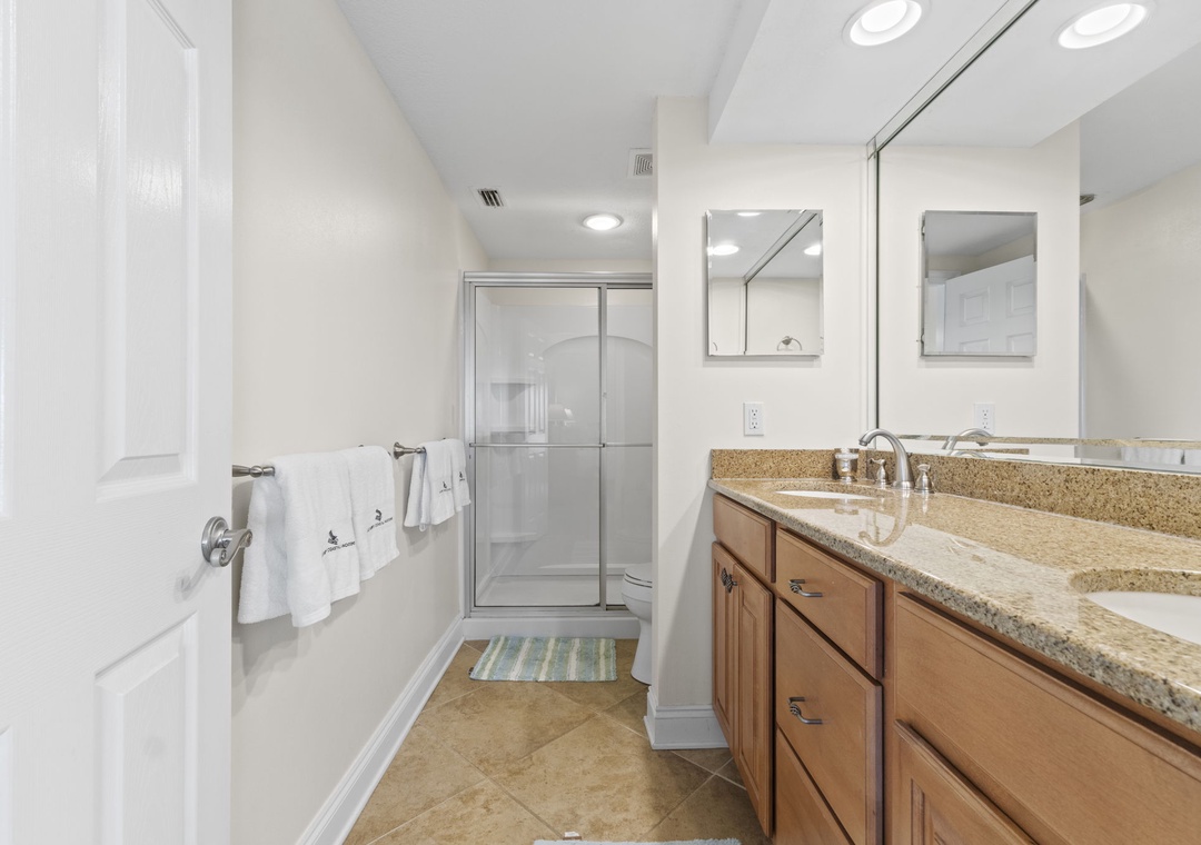The master suite is your private sanctuary, featuring a king bed, flat-screen TV, and direct beachfront patio access. The spa-inspired master bath offers dual granite sinks, a walk-in shower, and fluffy 100% cotton oversized towels with deluxe bath amenities—the perfect way to unwind after a day of sun and sand.