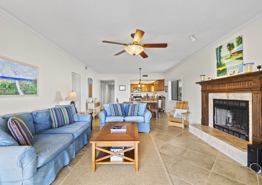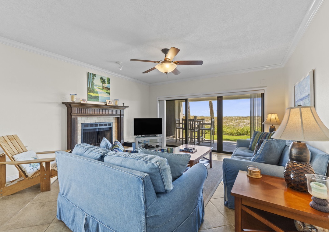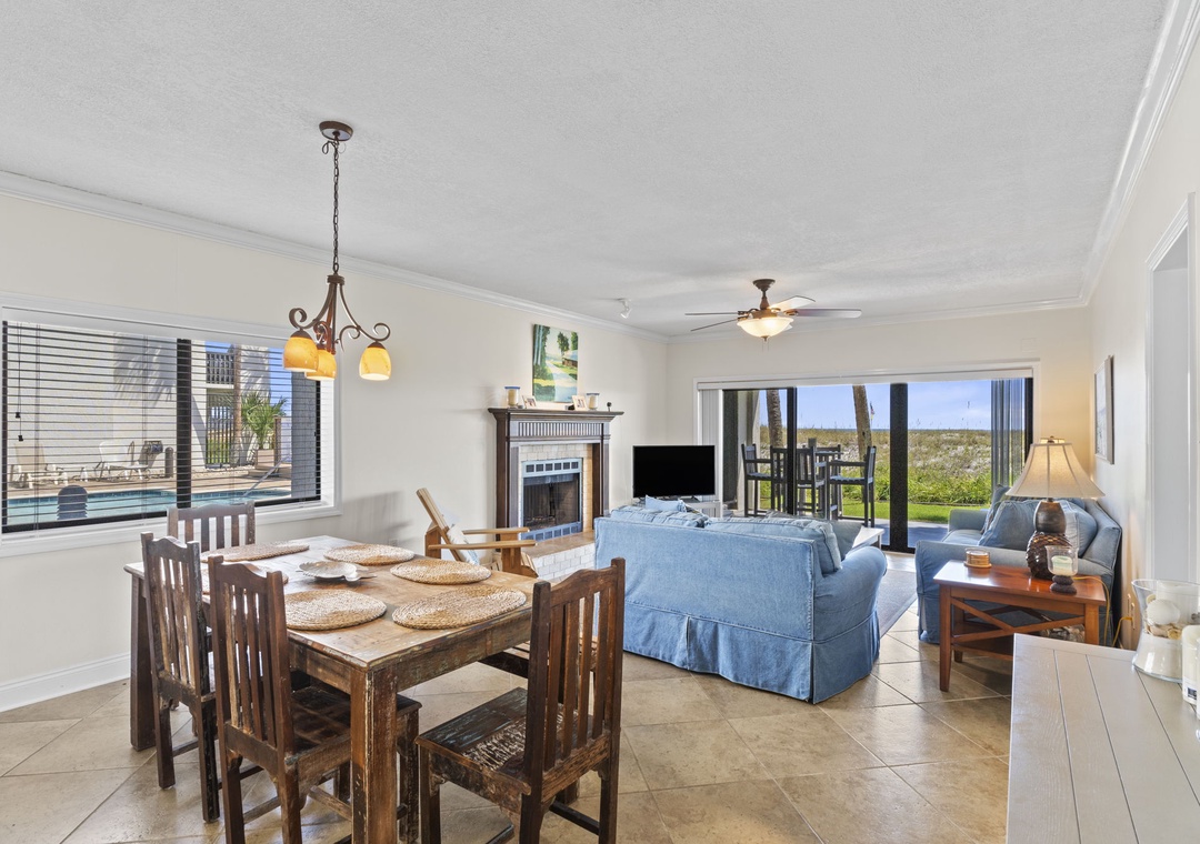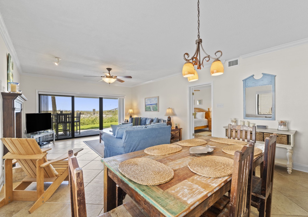 Inside, you’ll find a fresh “modern coastal” design—a stylish blend of crisp whites and serene blues accented by rustic wood tones and nautical touches. The living area offers a large flat-screen TV, an oversized plush sofa, and a cozy loveseat, ideal for movie nights or post-beach lounging. The dining area seats six comfortably, perfect for family meals or casual gatherings.