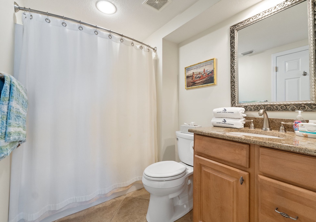 The second bedroom includes a queen bed and a private bath with a tub/shower combo and convenient hallway access. The third bedroom offers two twin beds, ideal for kids or additional guests.