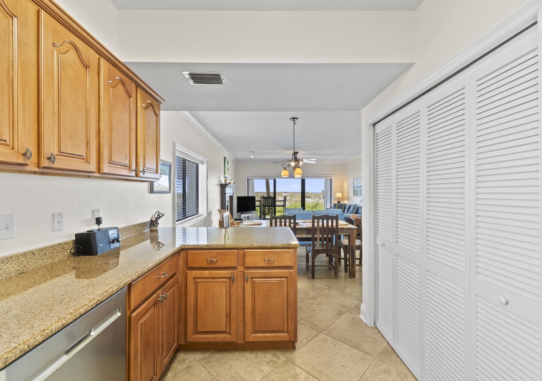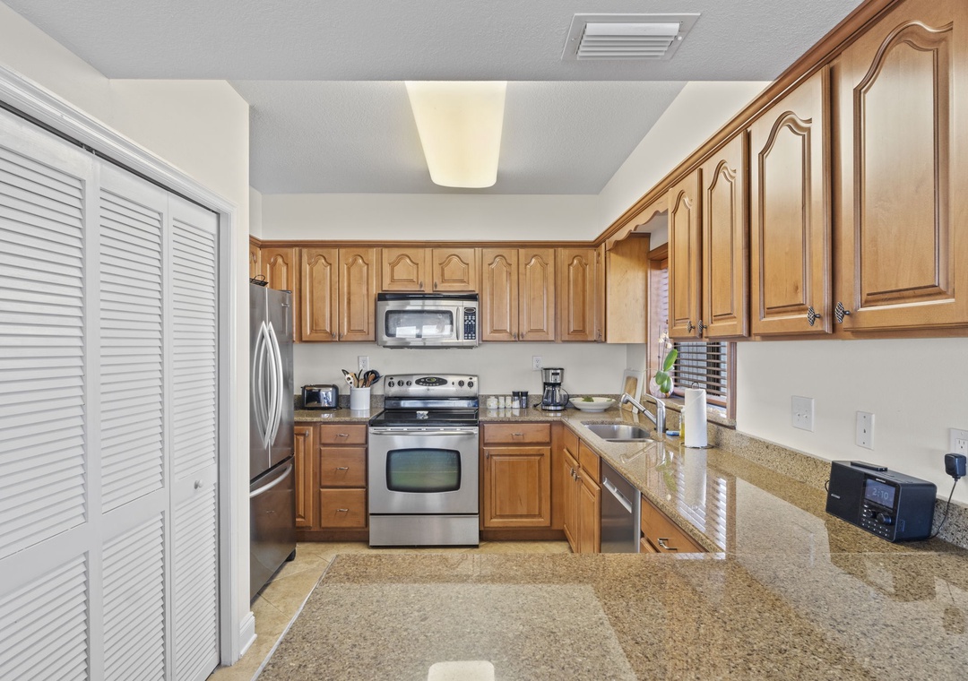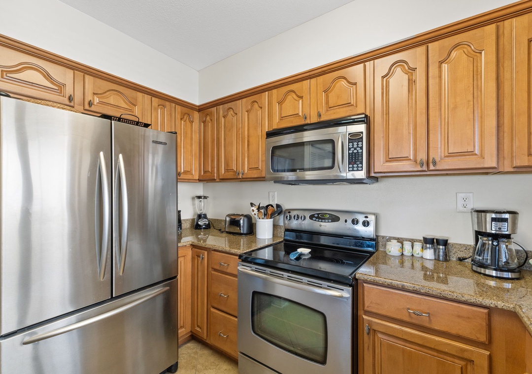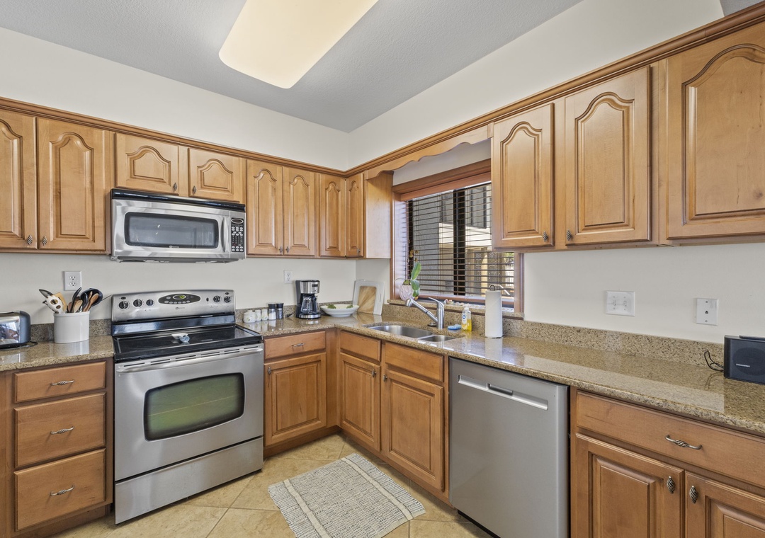 The fully equipped kitchen features stainless steel appliances, a crockpot, and all the small appliances, utensils, and cookware you’ll need to prepare your favorite dishes with ease.