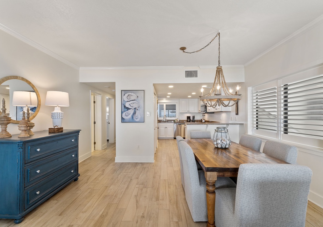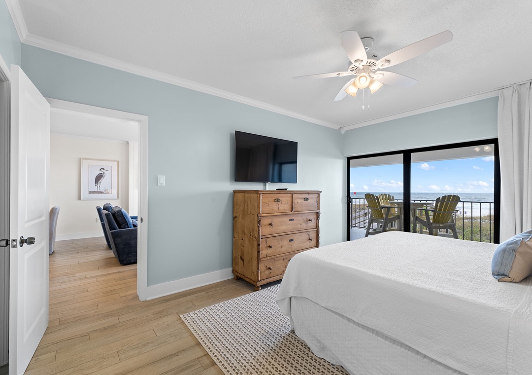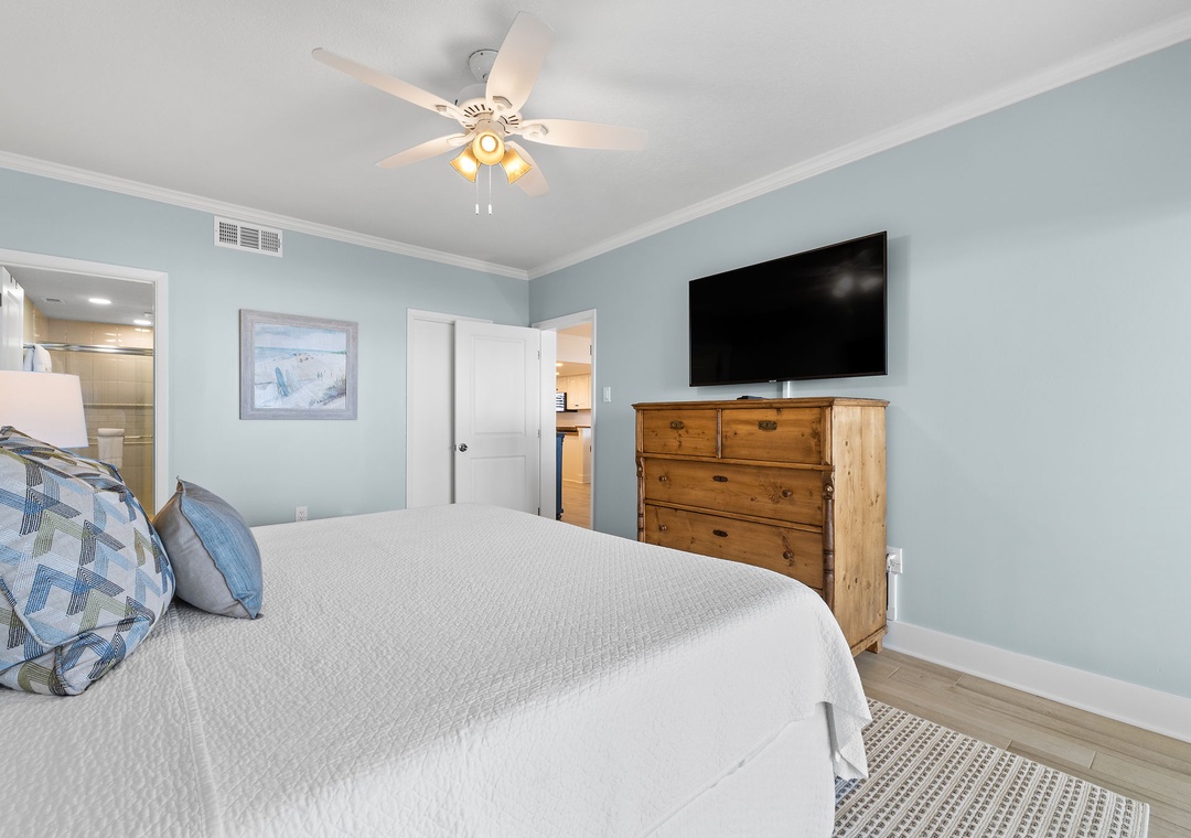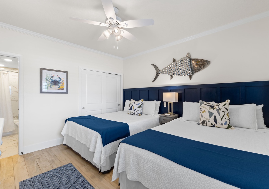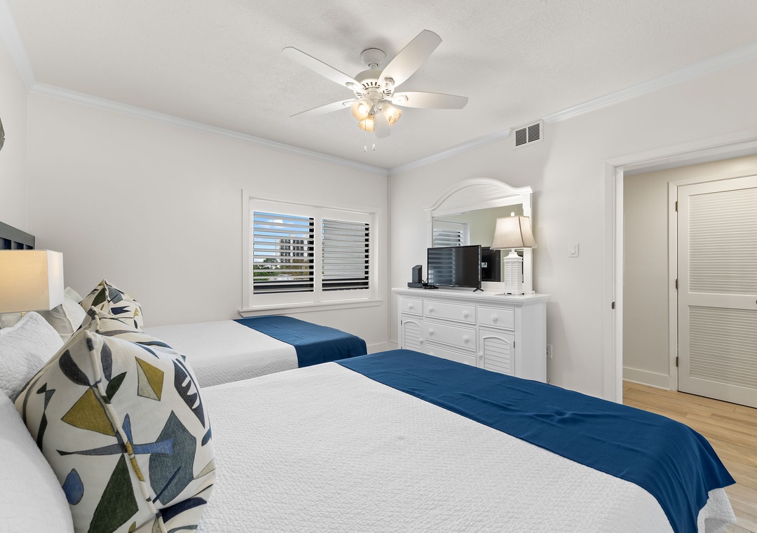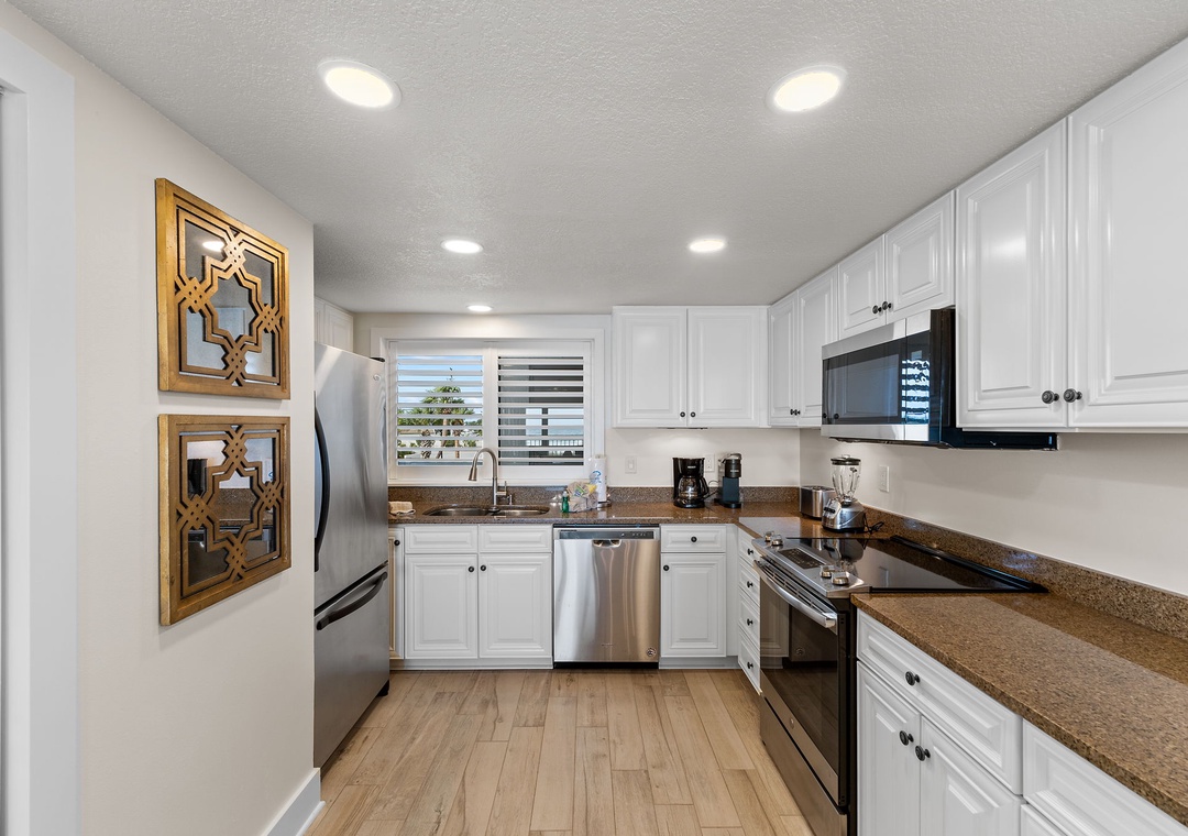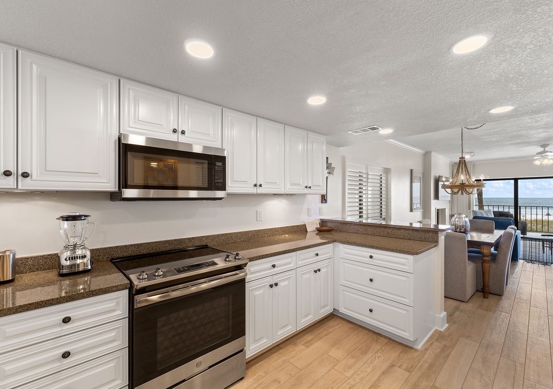 The condo’s updated gourmet kitchen is a chef's dream, equipped with stainless steel appliances, granite countertops, a glass cooktop, and every essential for preparing meals. Both bedrooms are designed for maximum comfort, with plush memory foam beds, high-quality linens, and room-darkening curtains to ensure restful sleep. The master bedroom offers a king bed, flat-screen TV, and direct access to the balcony, letting you wake up to the sound of the waves. The guest bedroom includes two queen beds and its own flat-screen TV, providing a cozy space for everyone. This condo comfortably sleeps up to six guests. Book your stay today at Shipwatch Surf and Yacht Club and create unforgettable memories on the Gulf Coast!