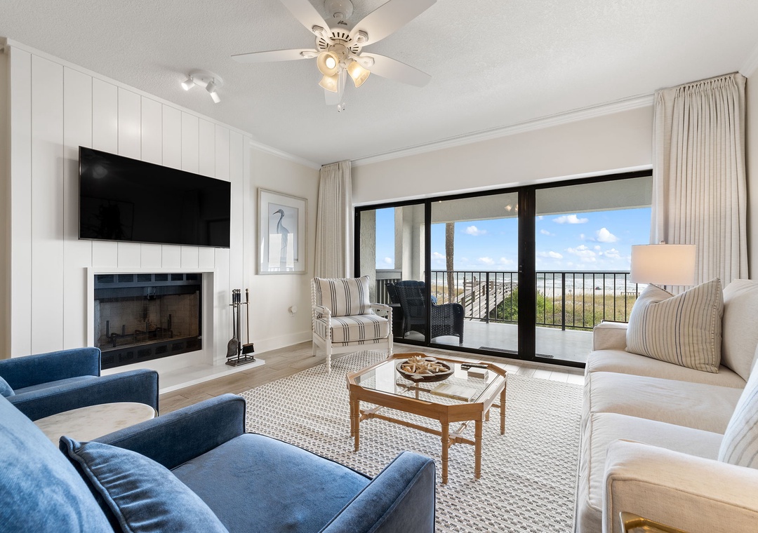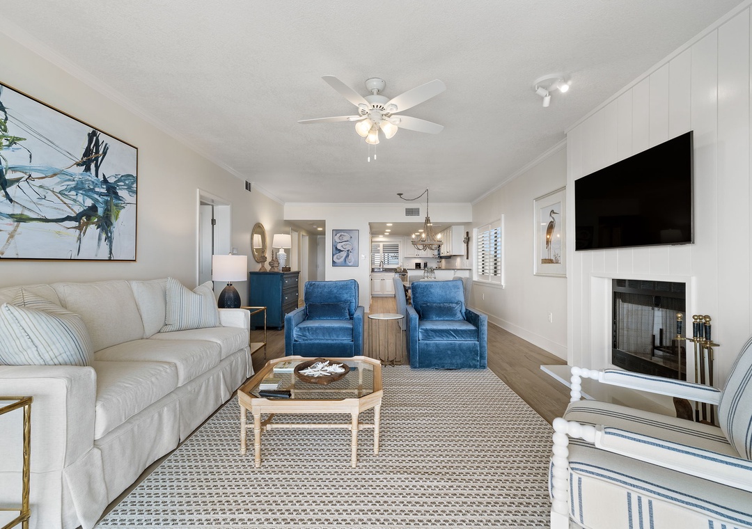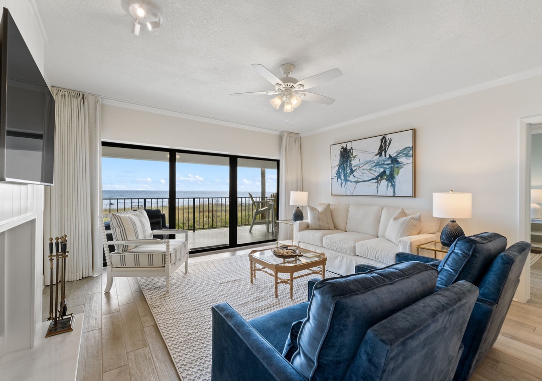 Enjoy a luxurious escape to the Gulf Coast in our beautiful 2nd-floor, 2-bedroom, 2-bath condo at Shipwatch Surf and Yacht Club in Perdido Key, Florida! This fully updated beachfront retreat combines nautical flair with modern style in an open-concept spacious and inviting layout. Designer furnishings, beach-inspired décor, and ample natural light make this the perfect spot to unwind. The living room features a plush new sofa, and two elegant blue velvet chairs, paired with a chic striped occasional chair, creating a warm atmosphere for family movie nights or casual evenings. Step through the large sliding glass doors to your private beachfront balcony and take in the endless Gulf views.