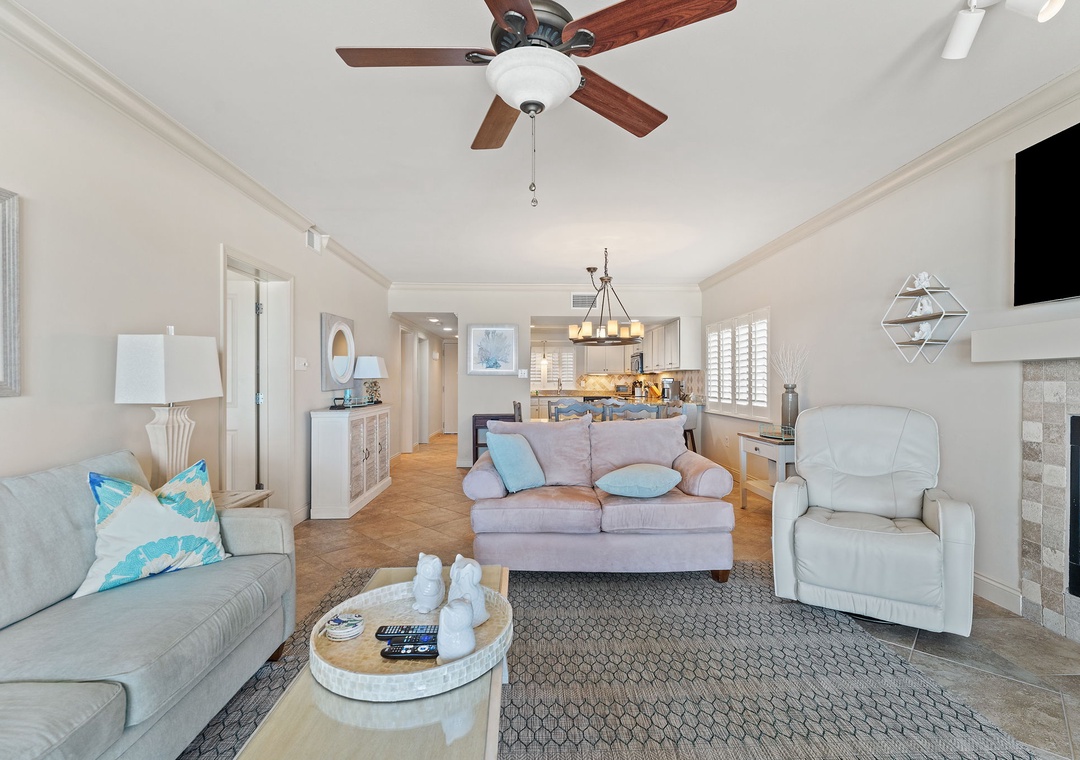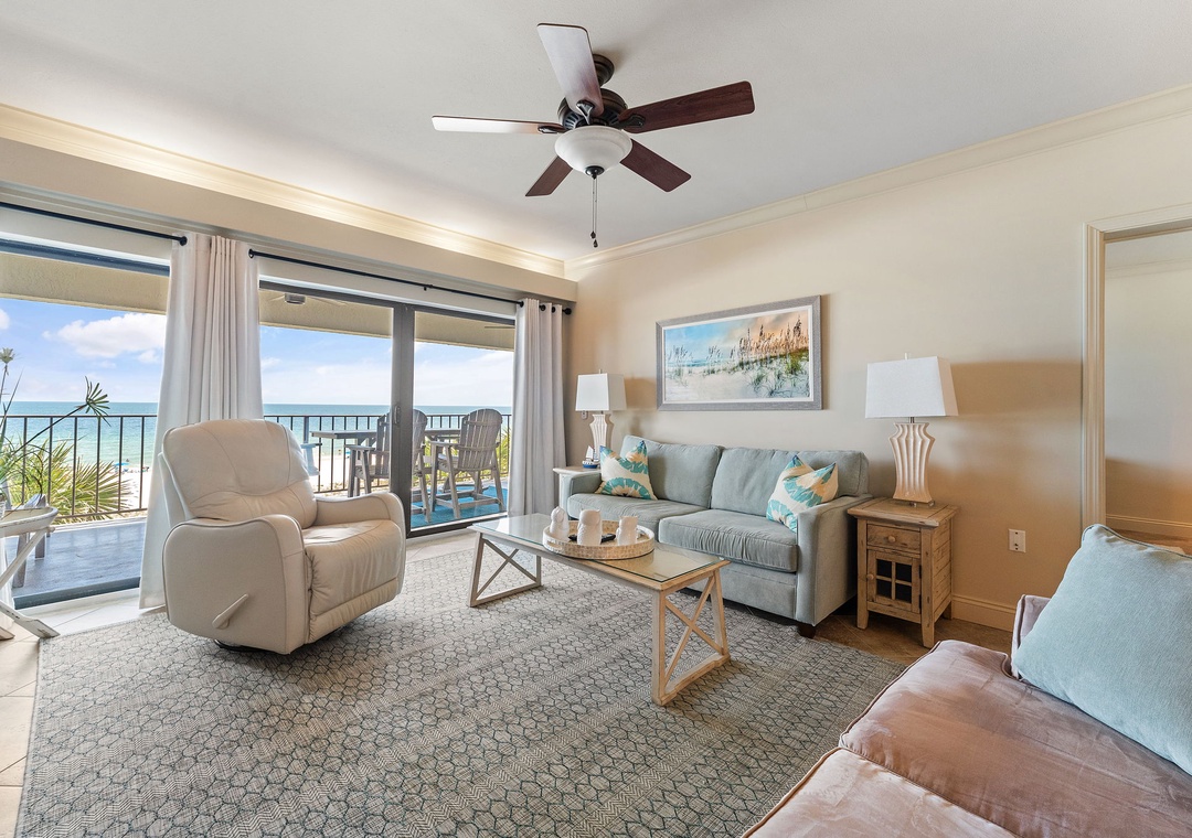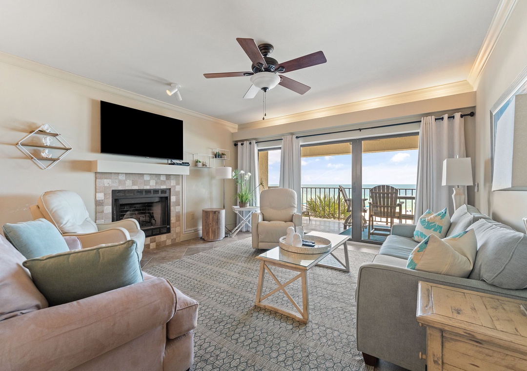 This spacious and luxurious beachfront abode boasts an open concept layout, designer furnishings and a beach chic aesthetic, creating the perfect blend of nautical flair and modern tastefulness. The living room is the perfect place to unwind for a cozy movie night with the family, offering plush furnishings, a large flat screen and beachfront balcony access! The most notable feature of the living area is the expansive sliding glass door that opens up to the spacious beachfront balcony! Miles upon miles of soft sugar white sands, emerald turquoise waters and blue sky can be appreciated from every angle, and with ample seating you can take your morning coffee with milk, sugar and a sunrise view of the Gulf of Mexico! As the day comes to a close and the sun begins to sink below the horizon, with the enchanting colors of a picture-perfect sunset lighting up the sky you can savor a glass of wine and delight in the splendor of it all, from the comfort of your private Gulf front balcony.