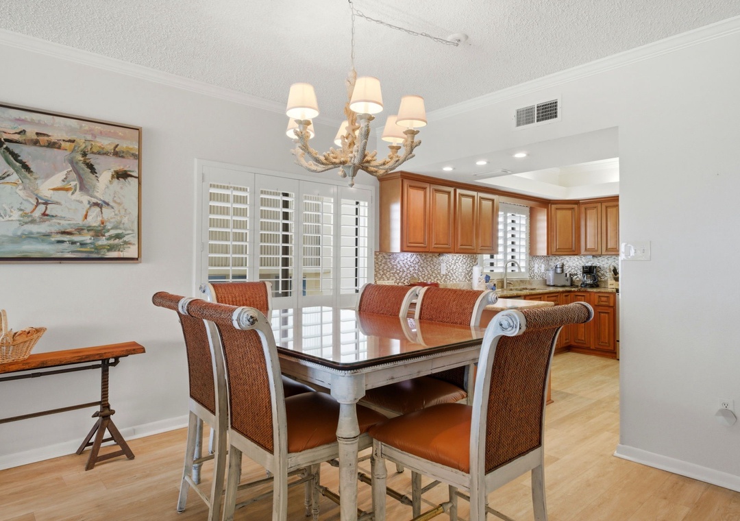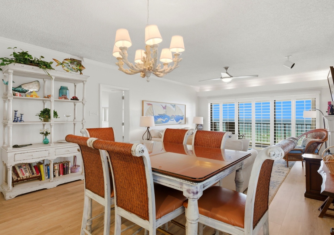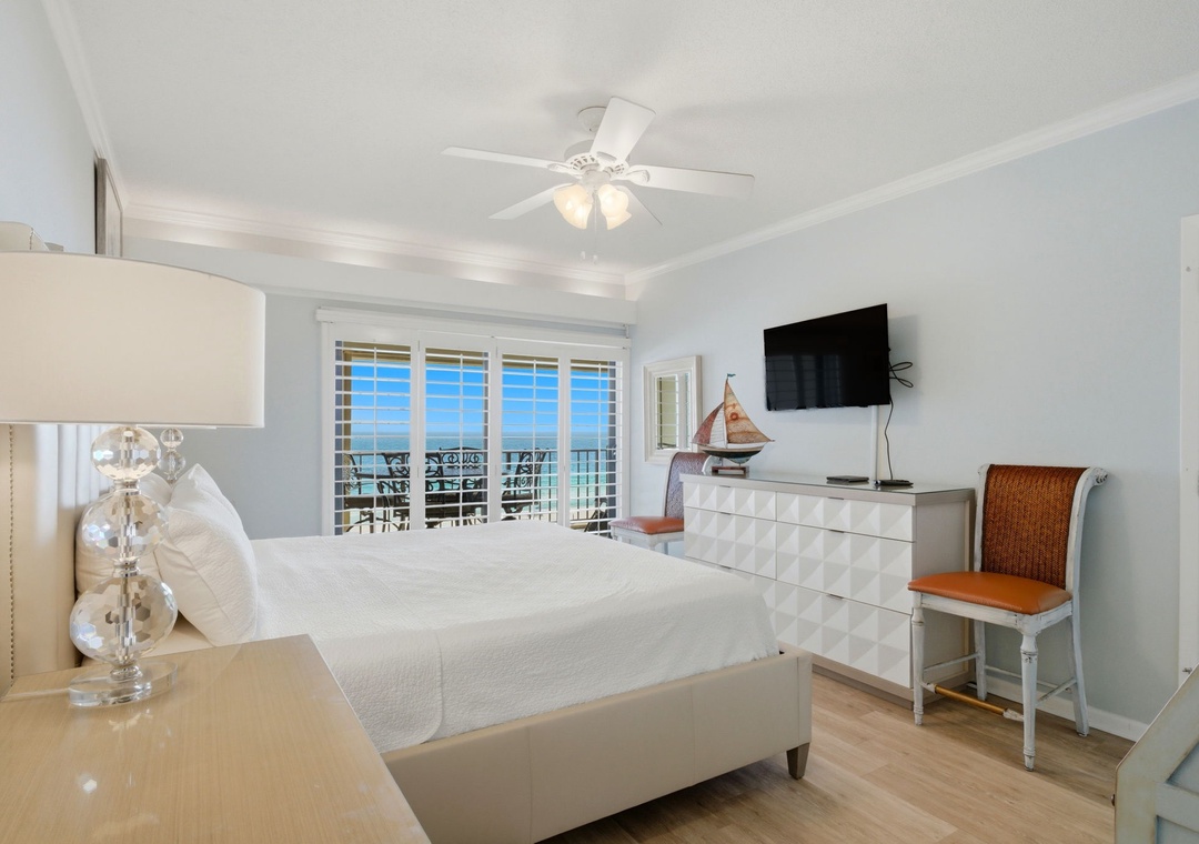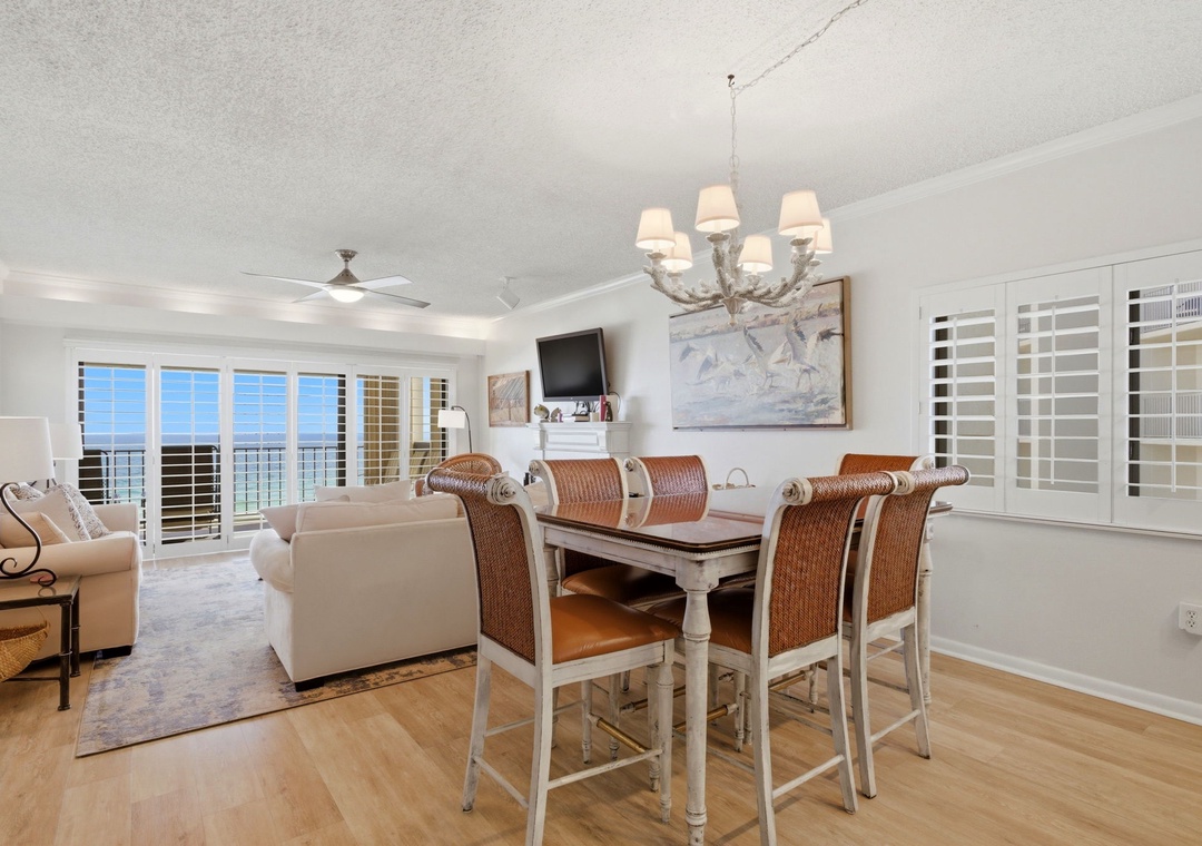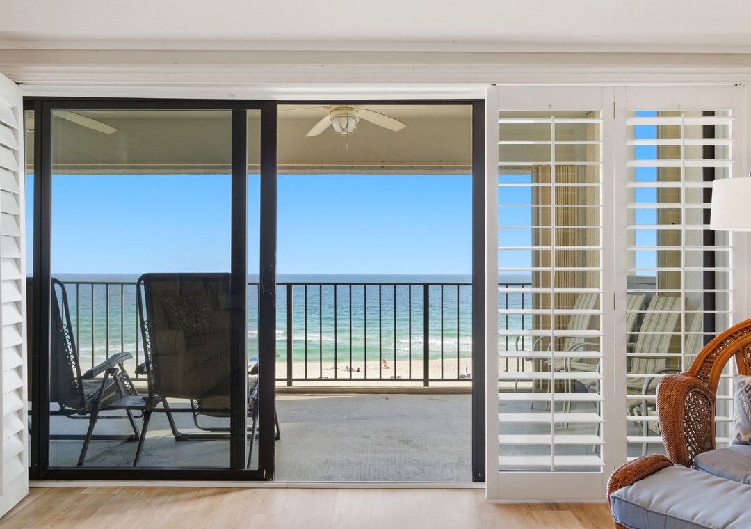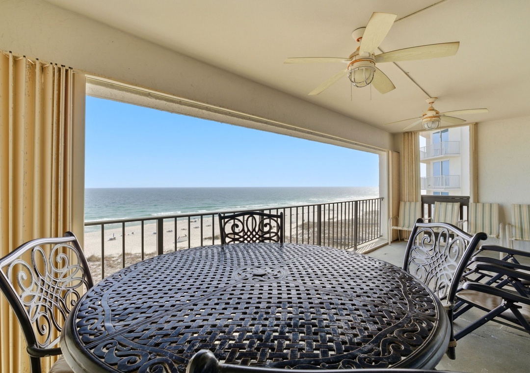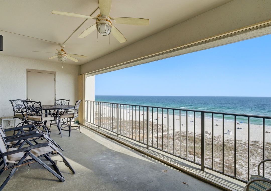 The sliding glass doors open to your covered terrace overlooking the beach, where you can sit and enjoy the beauty and splendor of the Gulf of Mexico without leaving the comfort of your beachfront abode. With plenty of seating you can even enjoy a delicious dinner alfresco while the moon and stars reflect over the water and the waves crash gently against the shore, creating a breathtaking backdrop for a vacation you'll never forget!