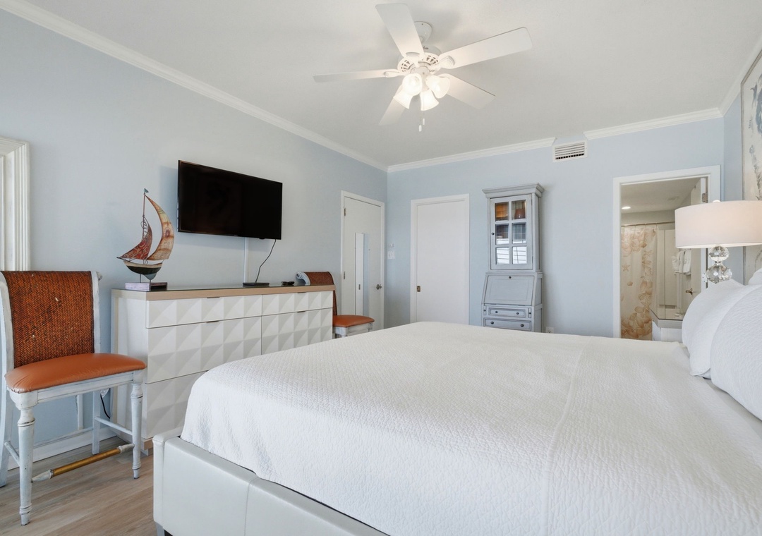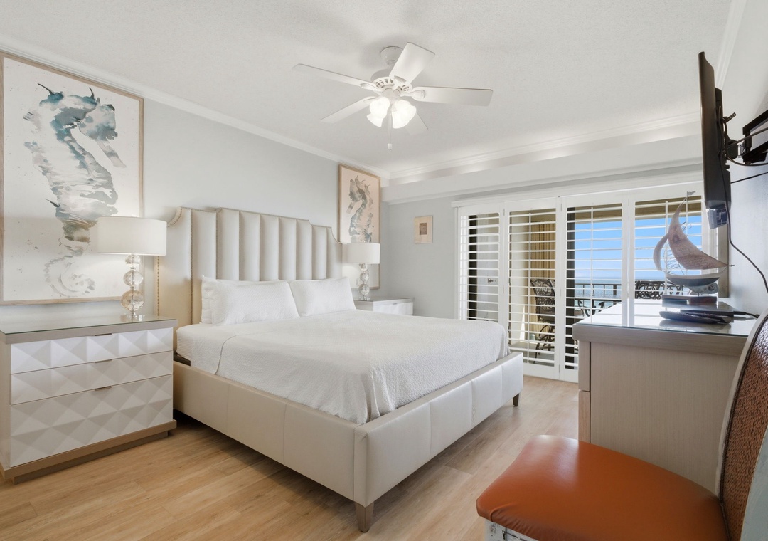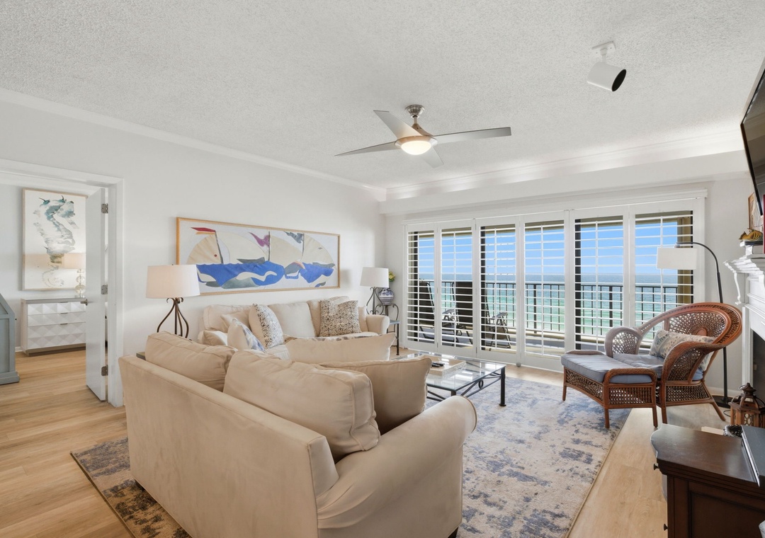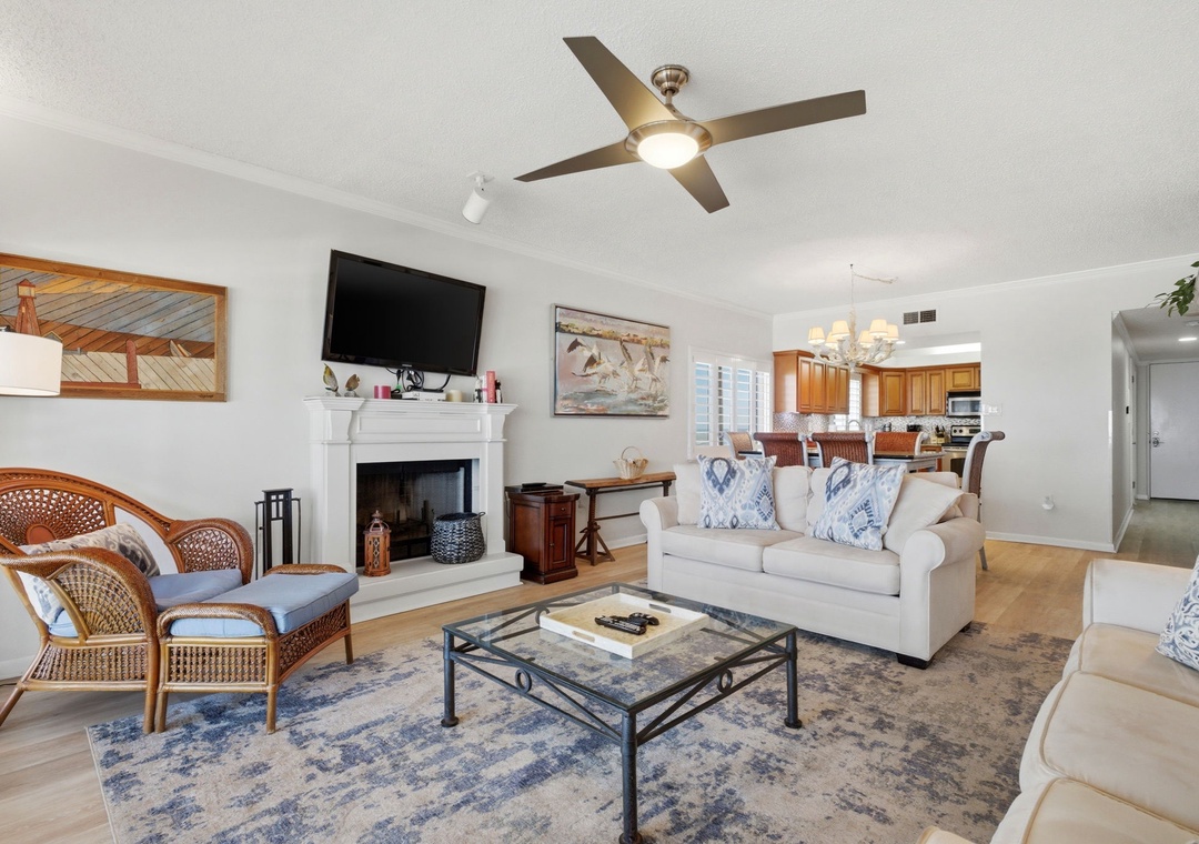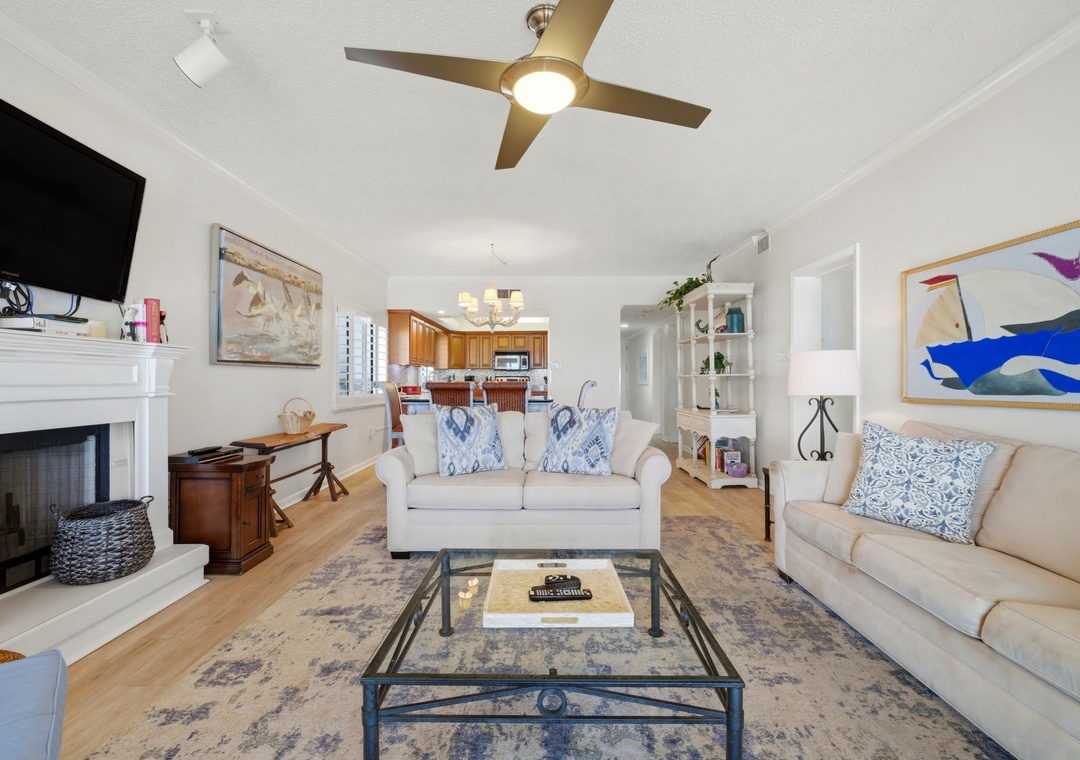 This charming 3 bedroom unit features a spacious open-concept layout, comfortable furnishings and appealing decor throughout. Lounge with the family for movie night in the living area, complete with a plush sofa and two cushioned chairs, a fireplace, wall-mounted flat screen and beachfront balcony access! Snuggle up with a good book by the fire, or binge watch your favorite show all in one cozy space.