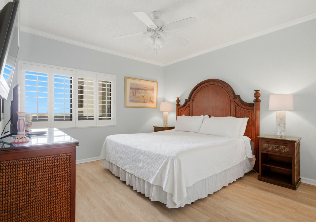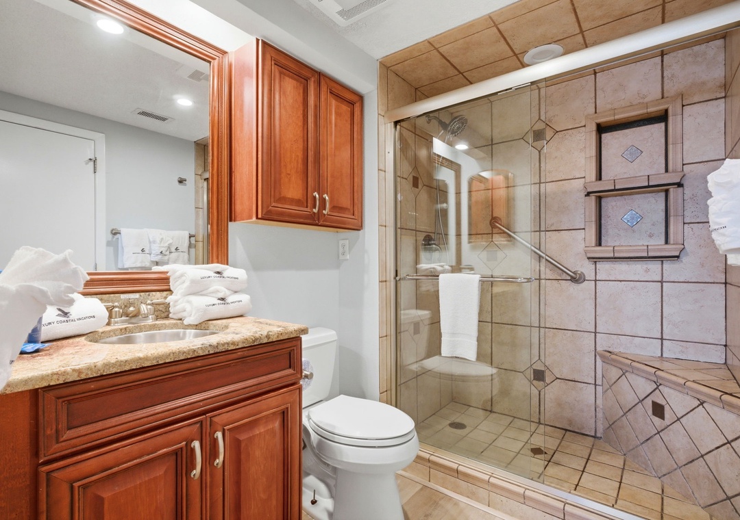 Retire to one of three spacious bedrooms and catch some serious zzz's during your much deserved getaway. With each featuring comfortable mattress sets and high thread count linens, you're sure to indulge in some quality rest and relaxation! The master offers beachfront balcony access, so you can wake up and look out over the magnificent turquoise waters and soft white quartz sands with only a few steps from your comfy king bed! The master bath is well appointed, affording a large walk-in glass and tile shower, double vanity sinks and plush oversized 100% cotton bath towel sets, perfect for pampering after a long day on the beach.