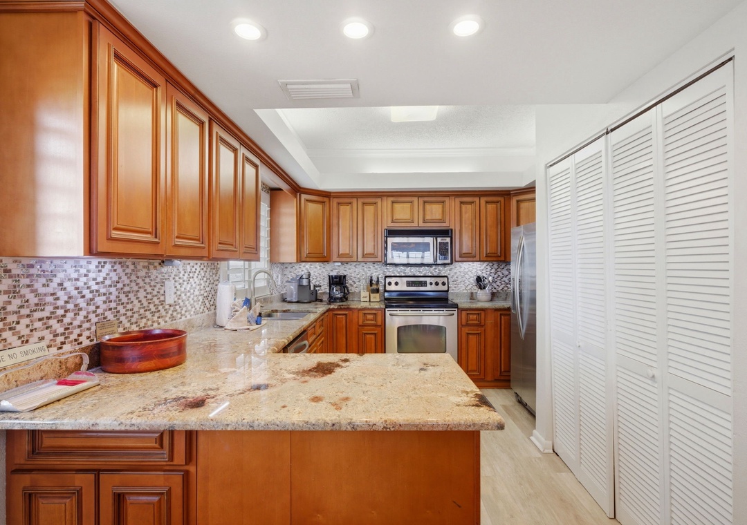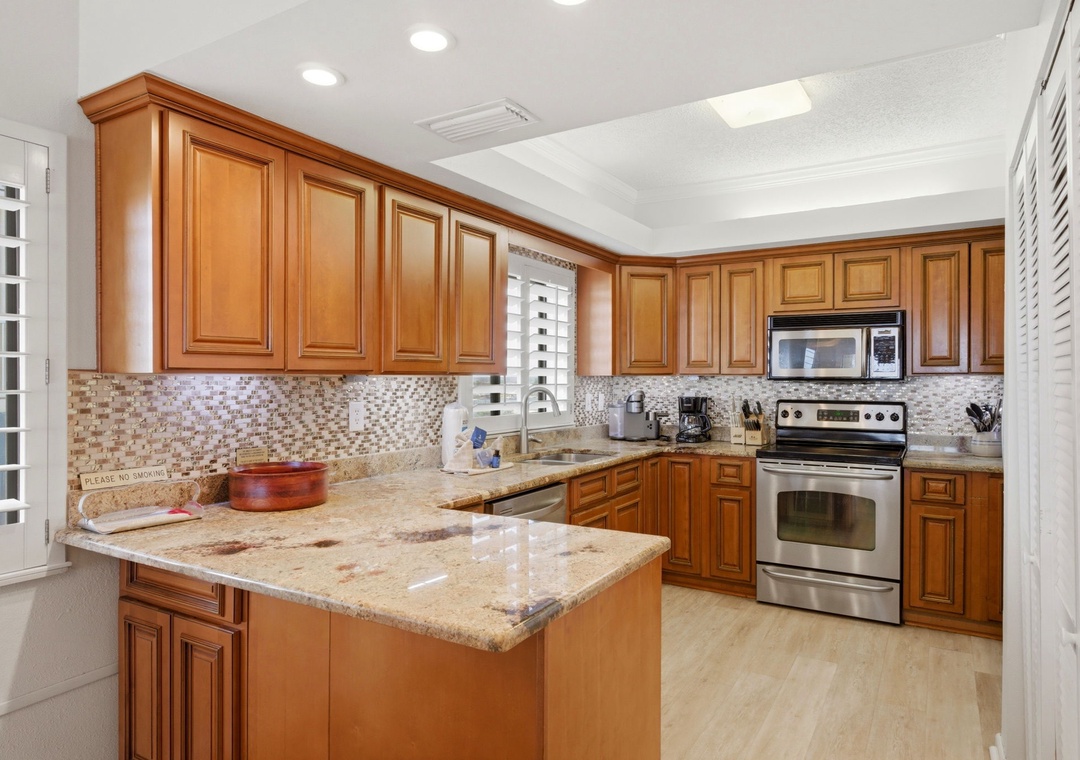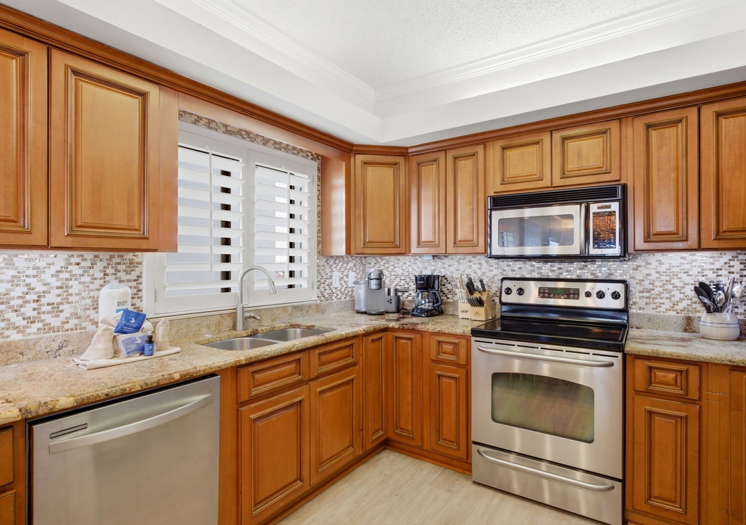 The updated kitchen offers everything needed to inspire your inner-chef, including updated appliances, custom cabinetry with glass accents, and all the small appliances, utensils and cookware needed to prepare a culinary masterpiece!