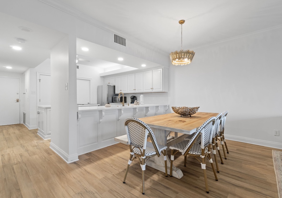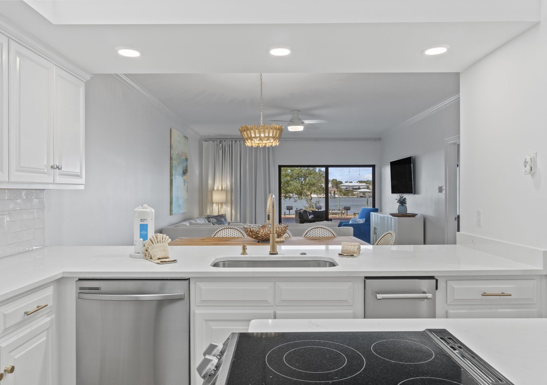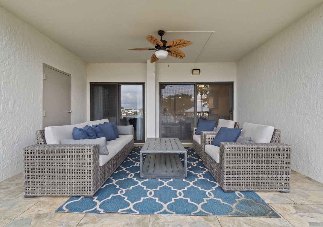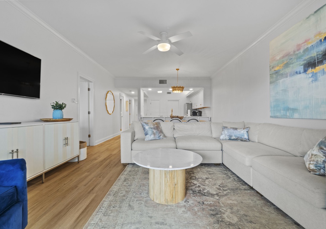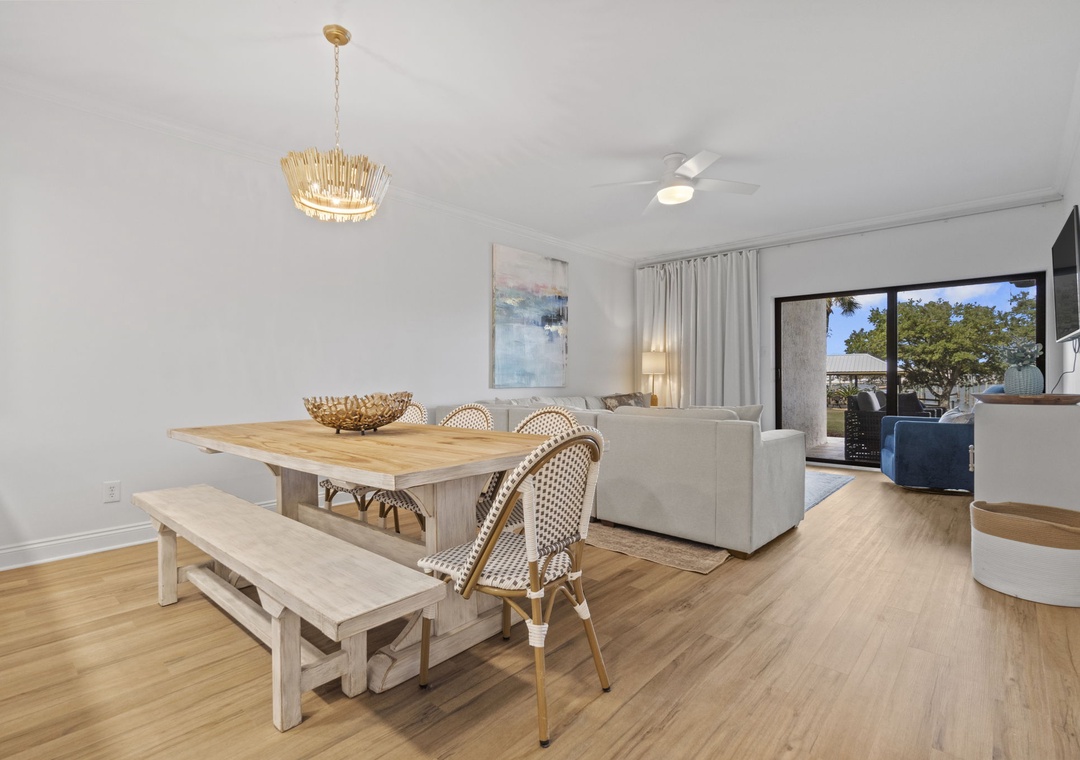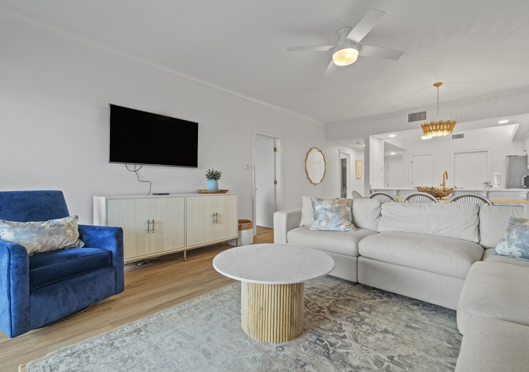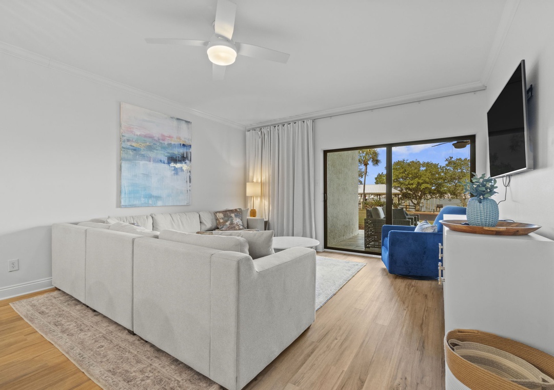 Welcome to Shipwatch Riverside E104, your serene escape overlooking the deep waters of Ole River! This spacious 2-bedroom, 2-bathroom condo offers luxurious living with a sophisticated beach-inspired design. The open floor plan features a comfortable living area with plush seating, a large TV, and floor-to-ceiling sliding glass doors that lead to an expansive covered patio. Here, you’ll find ample outdoor seating perfect for enjoying the stunning views of Ole River and Ono Island, creating a picturesque backdrop for your morning coffee or evening relaxation. Best of all, the sugar-white sands of the uncrowded beach are just a short walk away, offering the best of both riverfront and beachfront experiences.