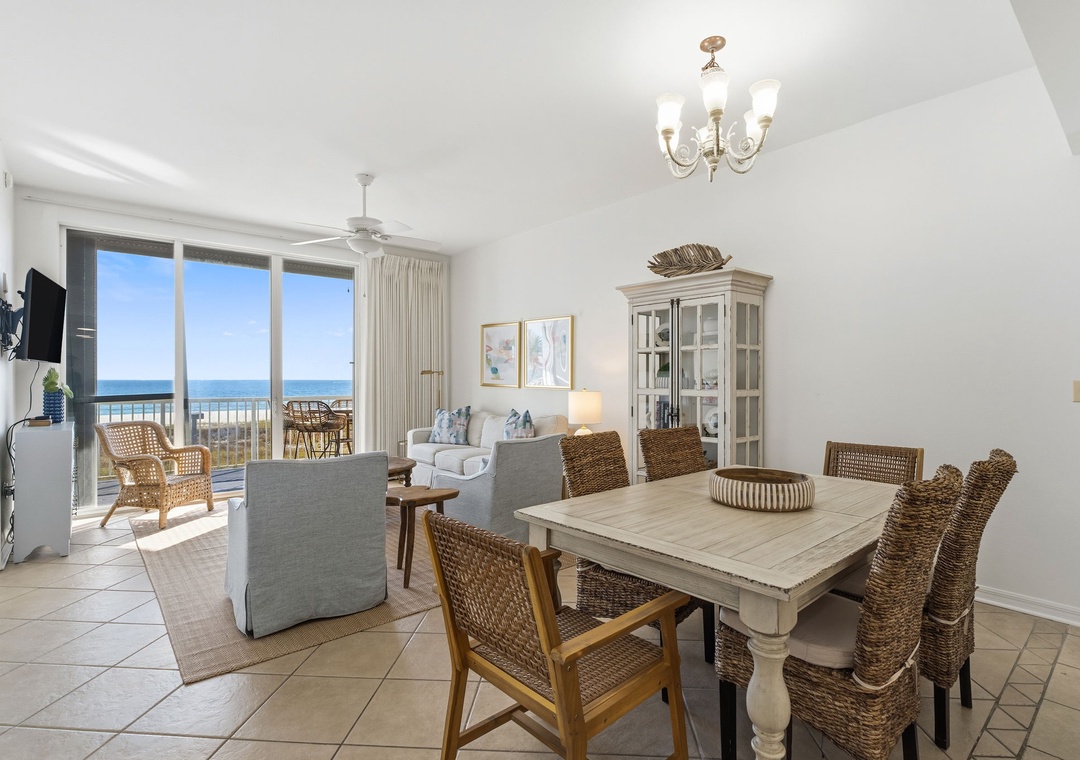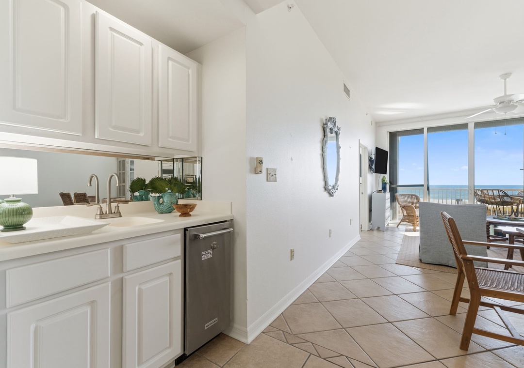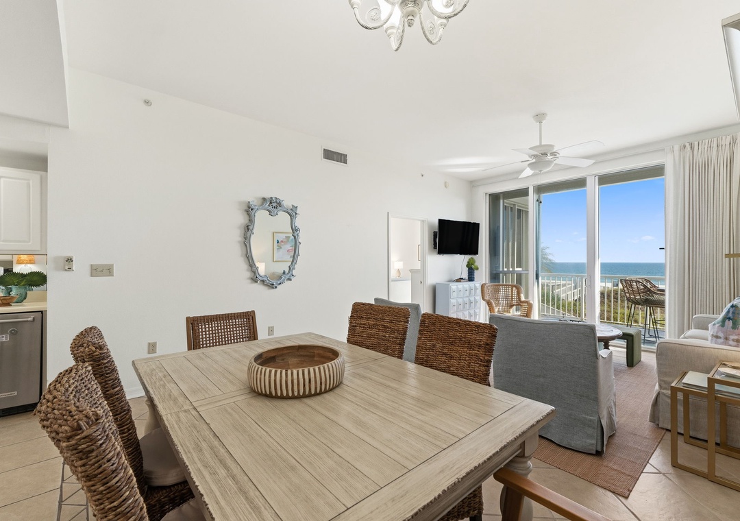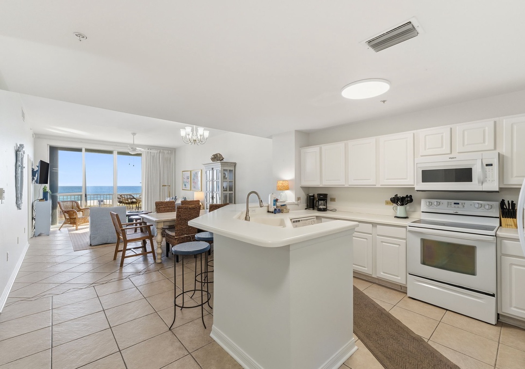 Step into luxury with a spacious open floor plan adorned with elegant furnishings that blend sophistication and comfort. Floor-to-ceiling sliding glass doors lead to an expansive beachfront terrace with ample seating, where you can sip your morning coffee or dine al fresco while soaking in breathtaking Gulf views. Inside, the fully equipped kitchen has all the essentials for crafting delicious meals. A wet bar with a stand alone ice maker adds a touch of indulgence, while the dining area provides a picturesque setting for enjoying meals with loved ones.