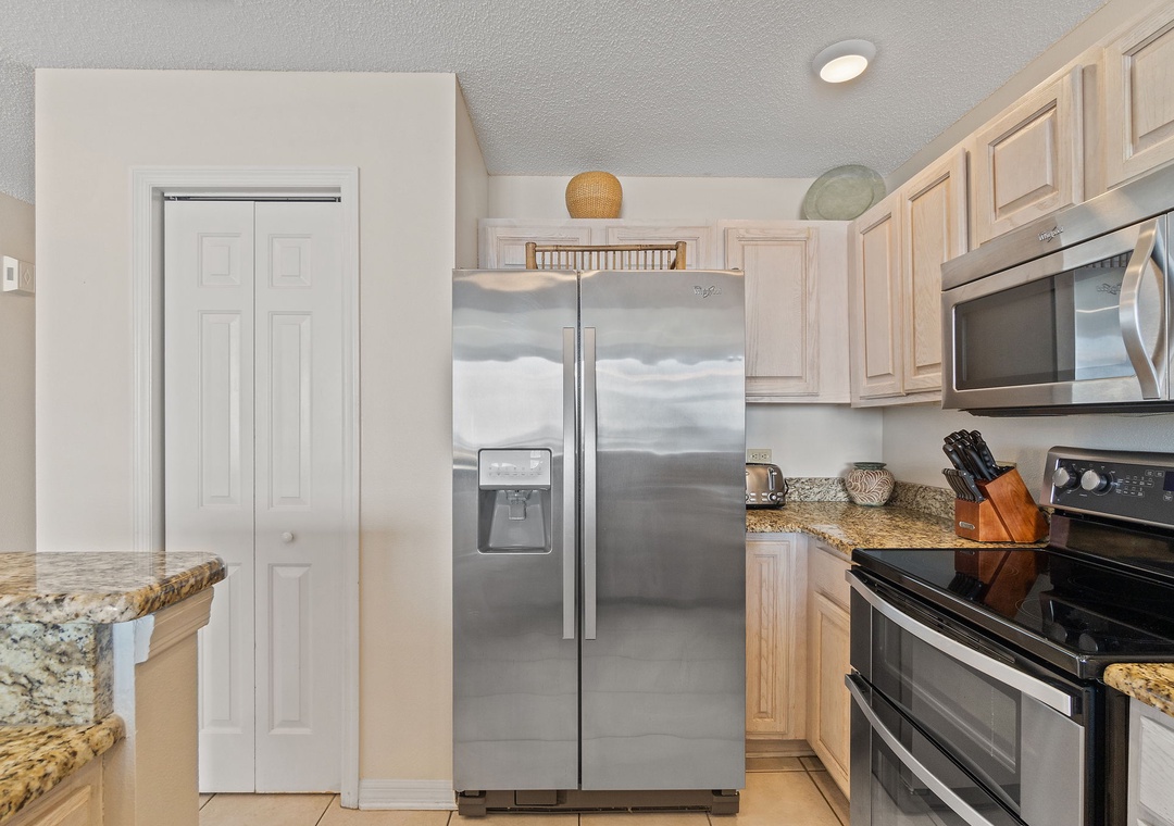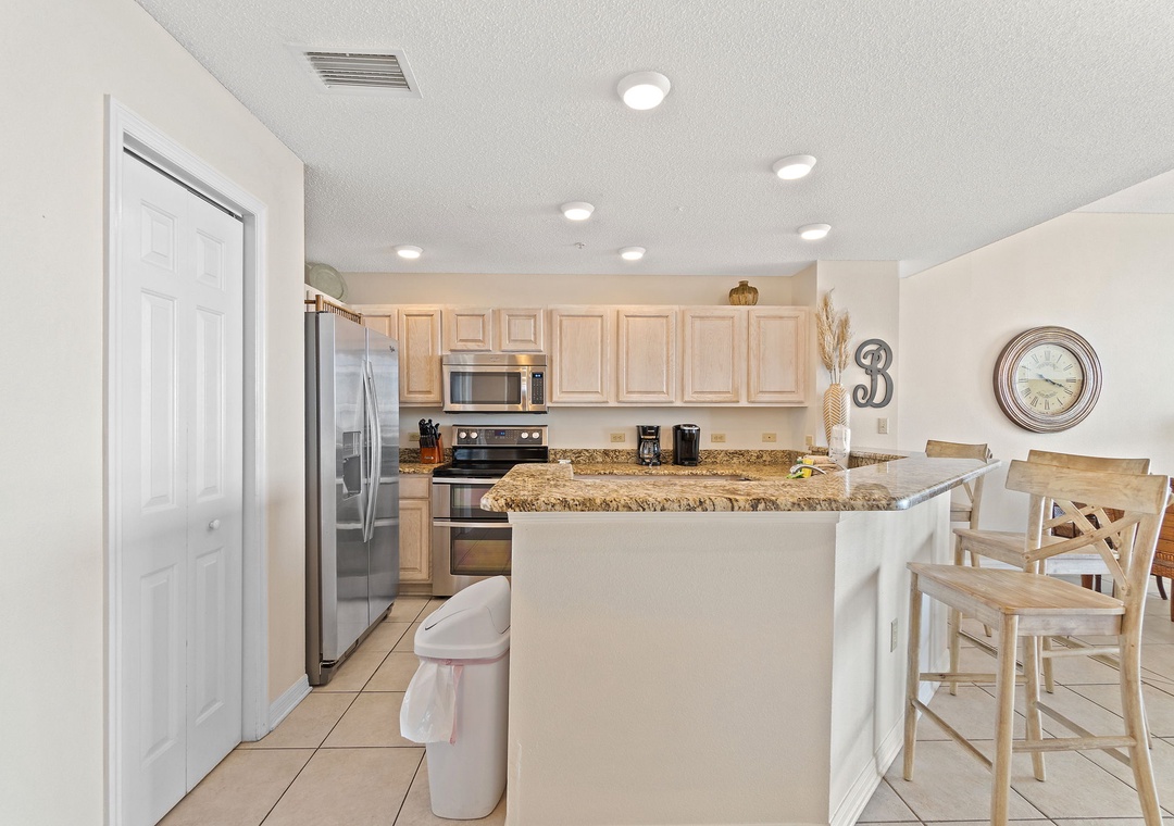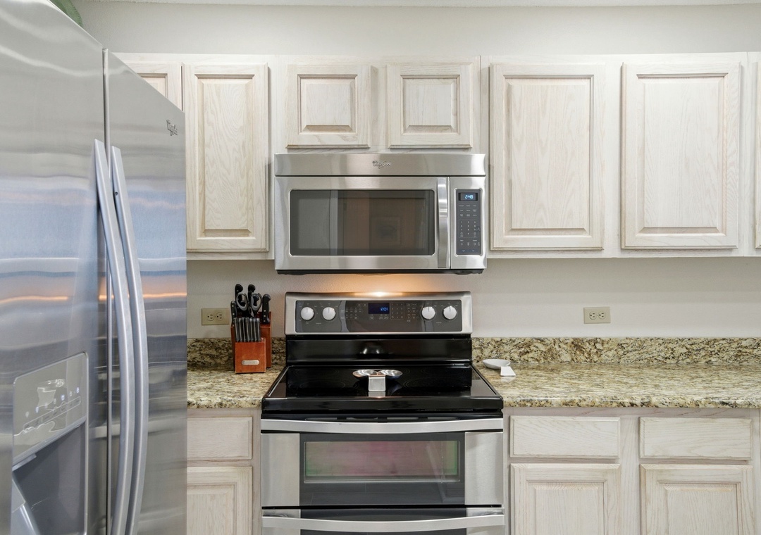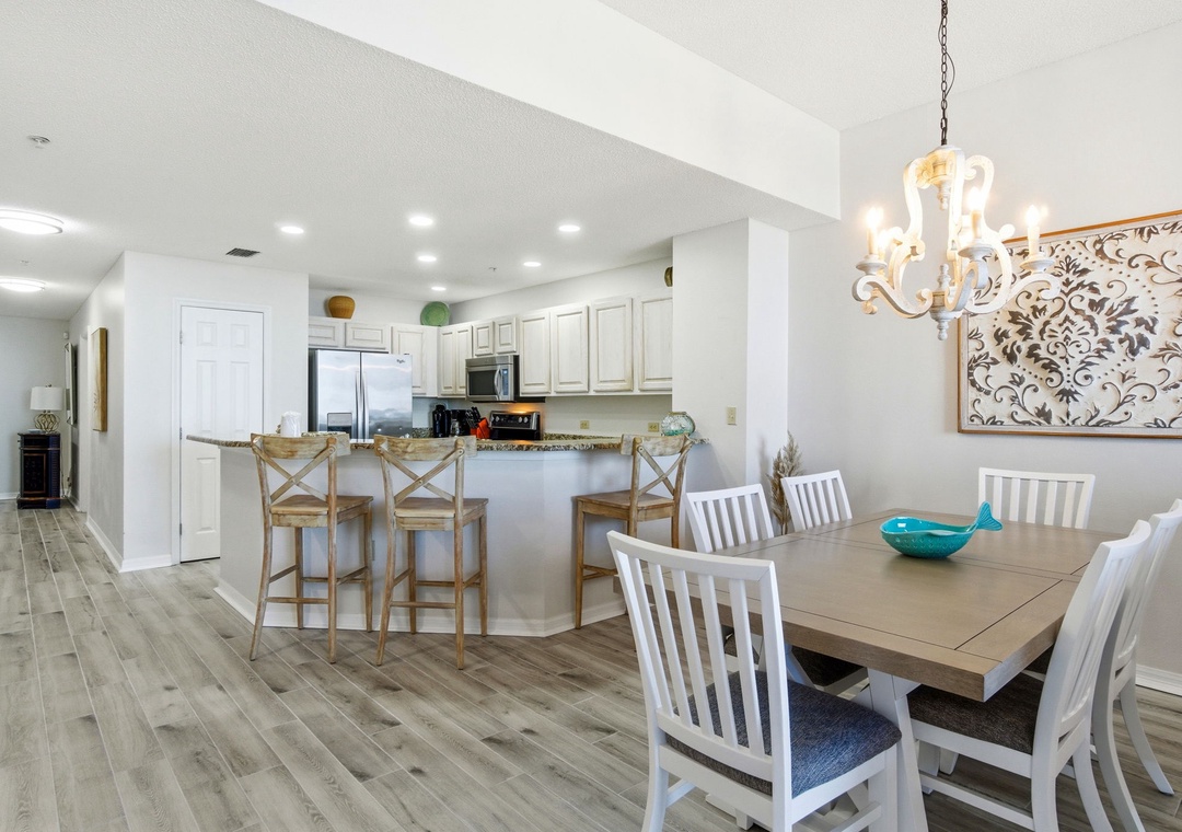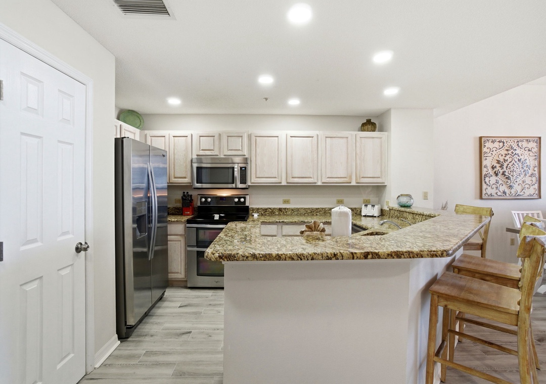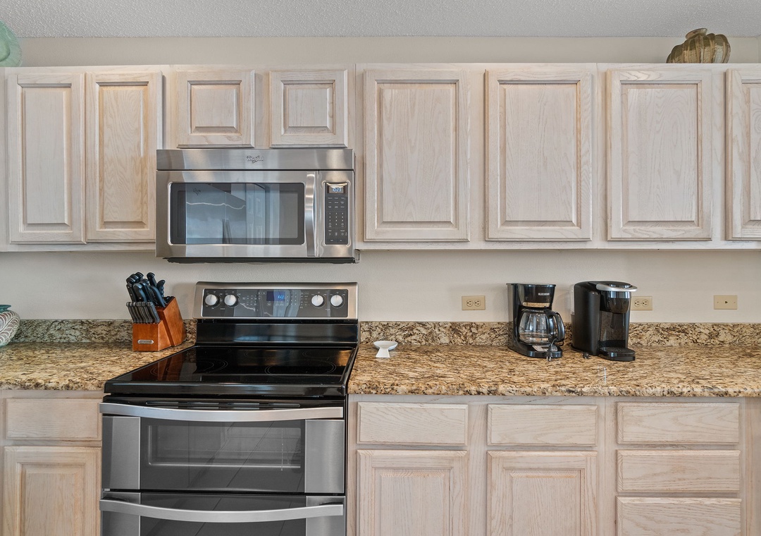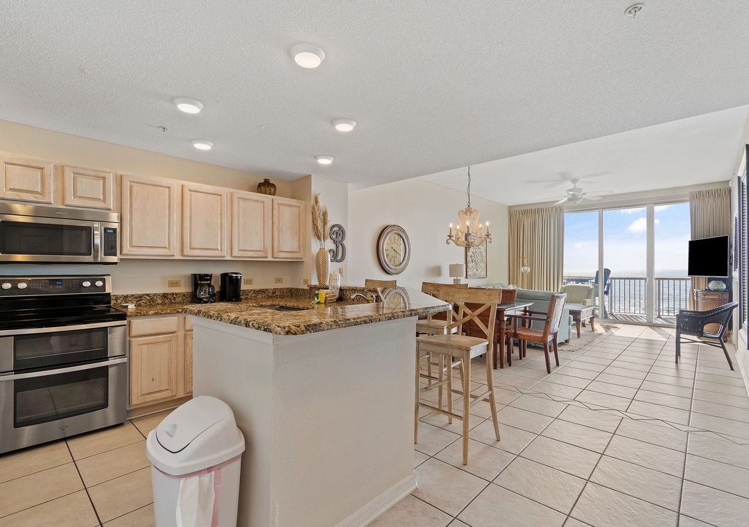 The gourmet kitchen offers everything needed to inspire your inner-chef, featuring top of the line stainless appliances, custom cabinetry and granite countertops, plus all the small appliances, utensils and cookware needed to prepare a culinary masterpiece! The dining area offers seating for 6, with additional seating for 3 at the breakfast bar.