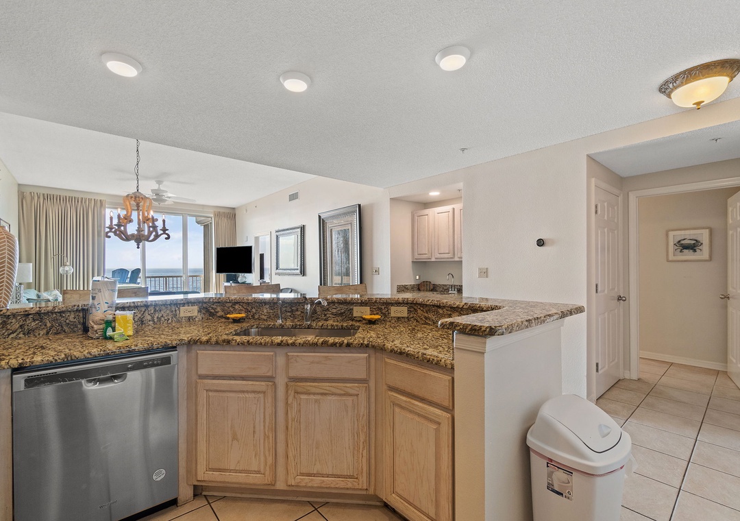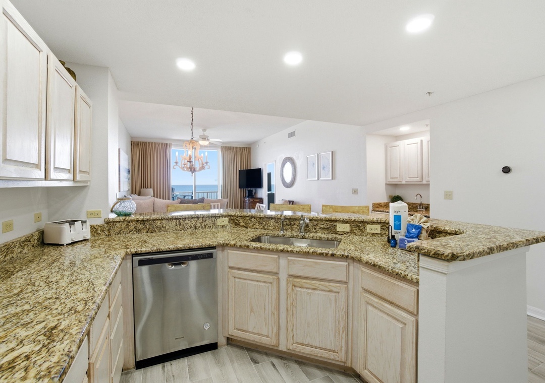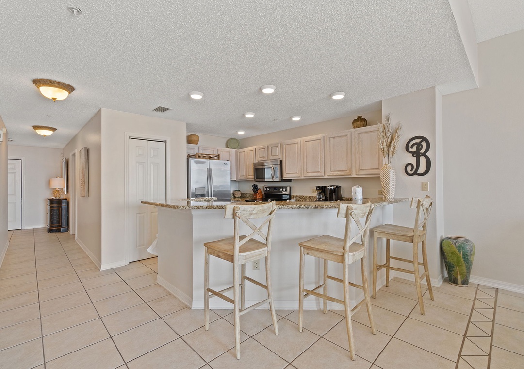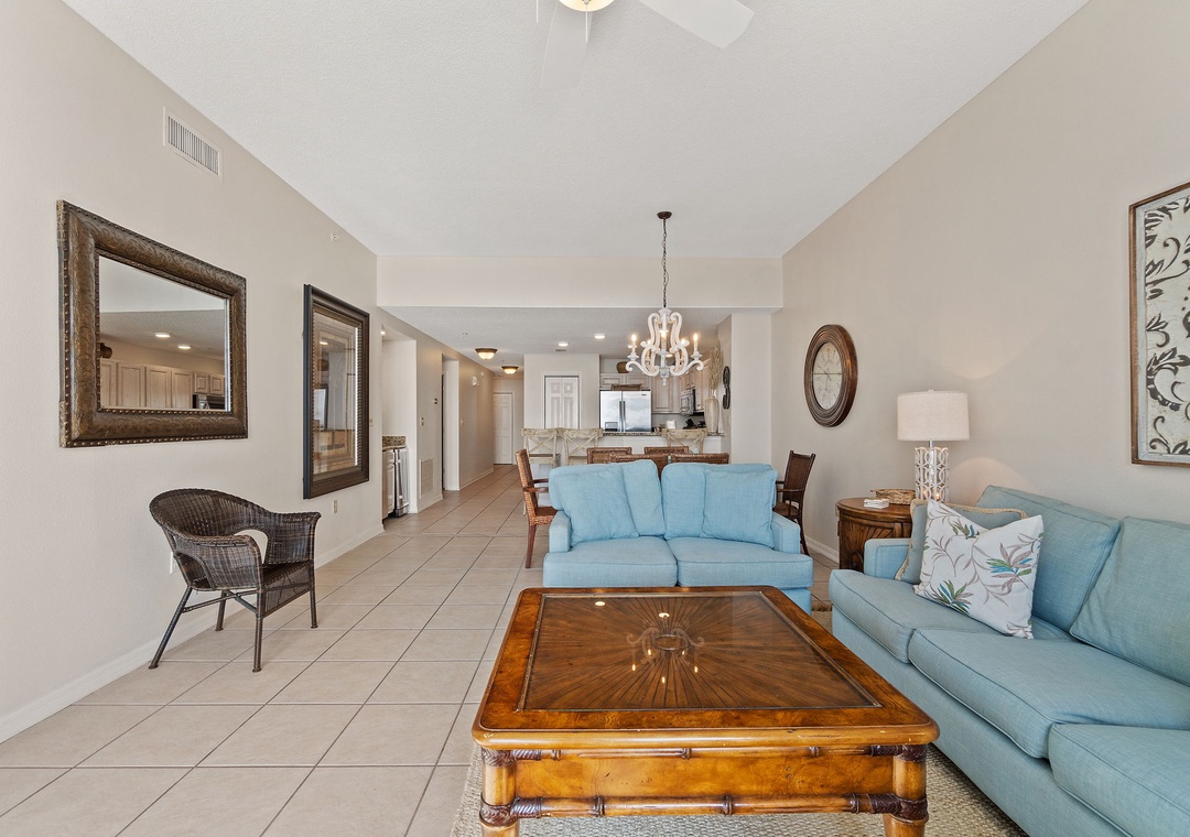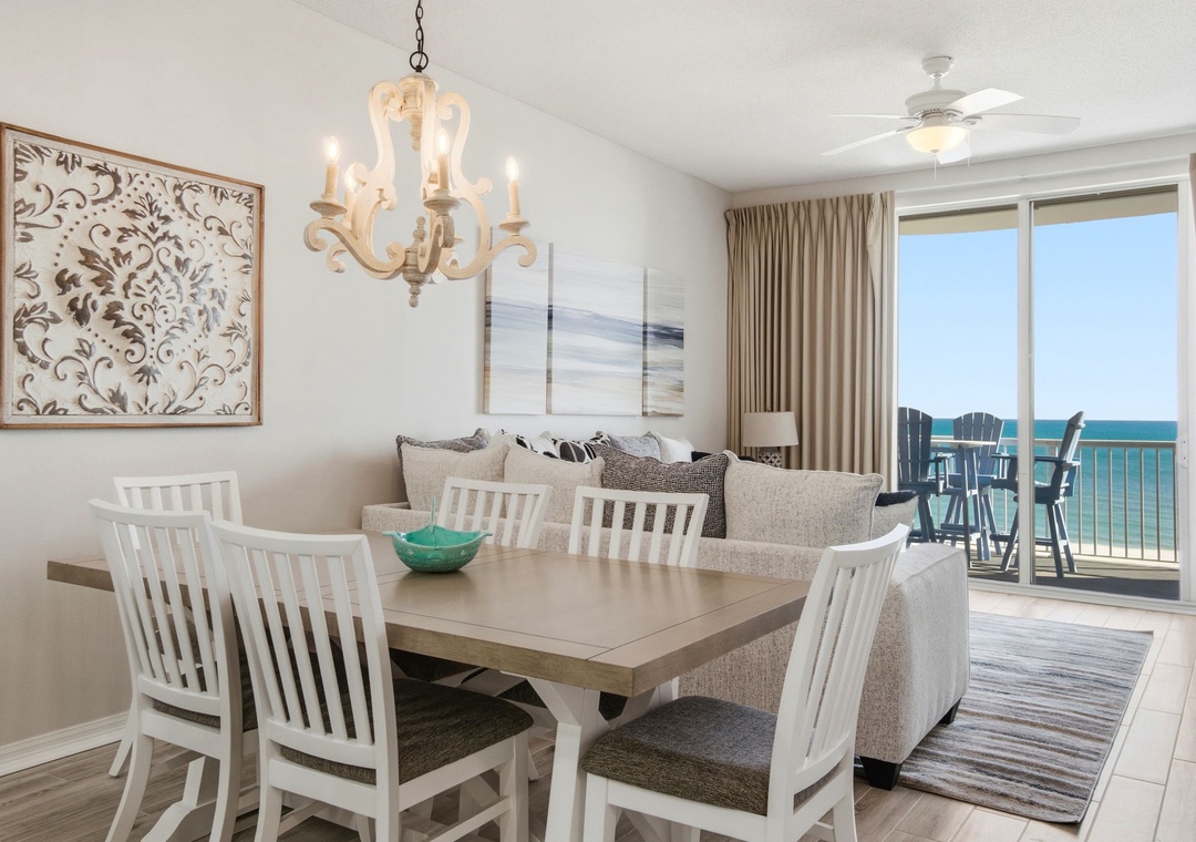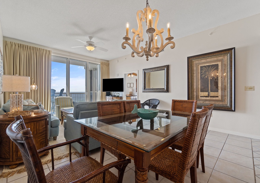 This fabulous 3-bedroom unit features a spacious open-concept layout, updated furnishings and beautiful décor throughout! Lounge with the family for movie night in the living area, complete with comfortable furnishings, a large flat screen TV, and beachfront balcony access! The sliding glass doors open to your covered terrace, where you can sit and enjoy the beauty and splendor of the Gulf of Mexico without leaving the comfort of your beachfront abode. With plenty of seating you can even enjoy a delicious dinner alfresco while the moon and stars reflect over the water and the waves crash gently against the shore, creating a breathtaking backdrop for an evening you’ll never forget!