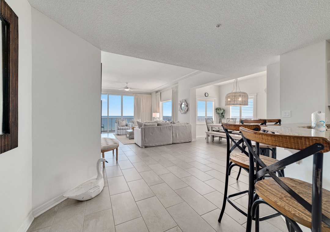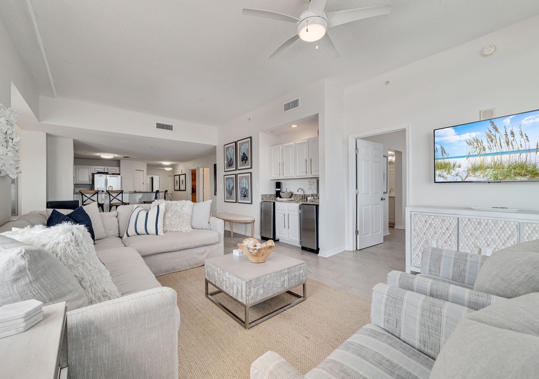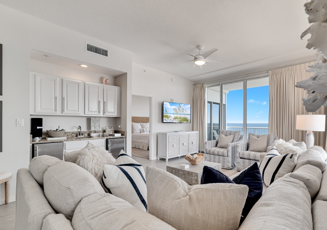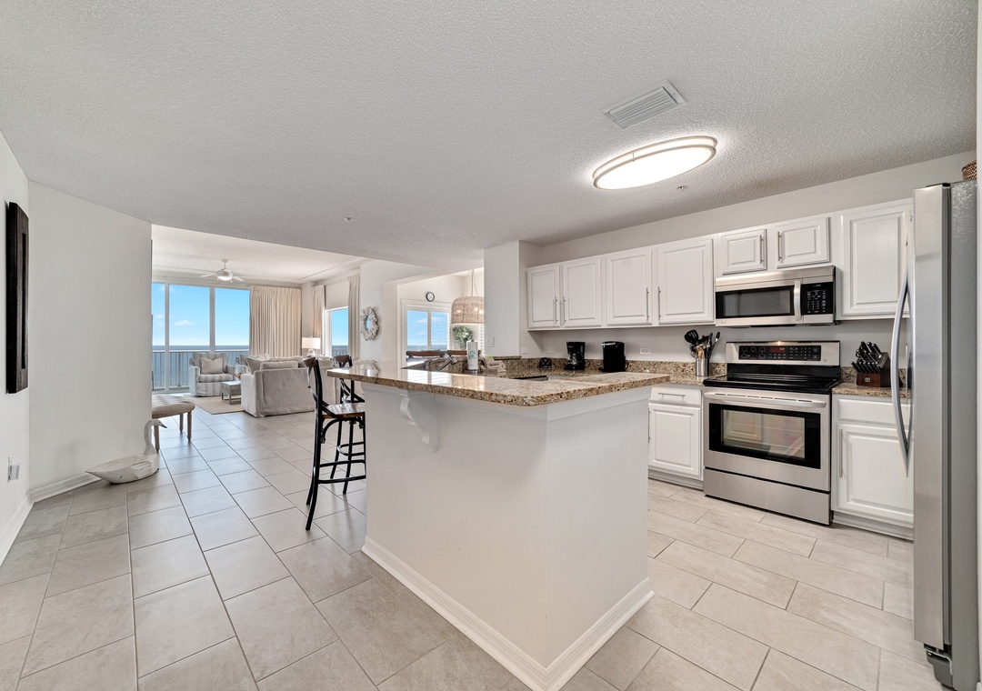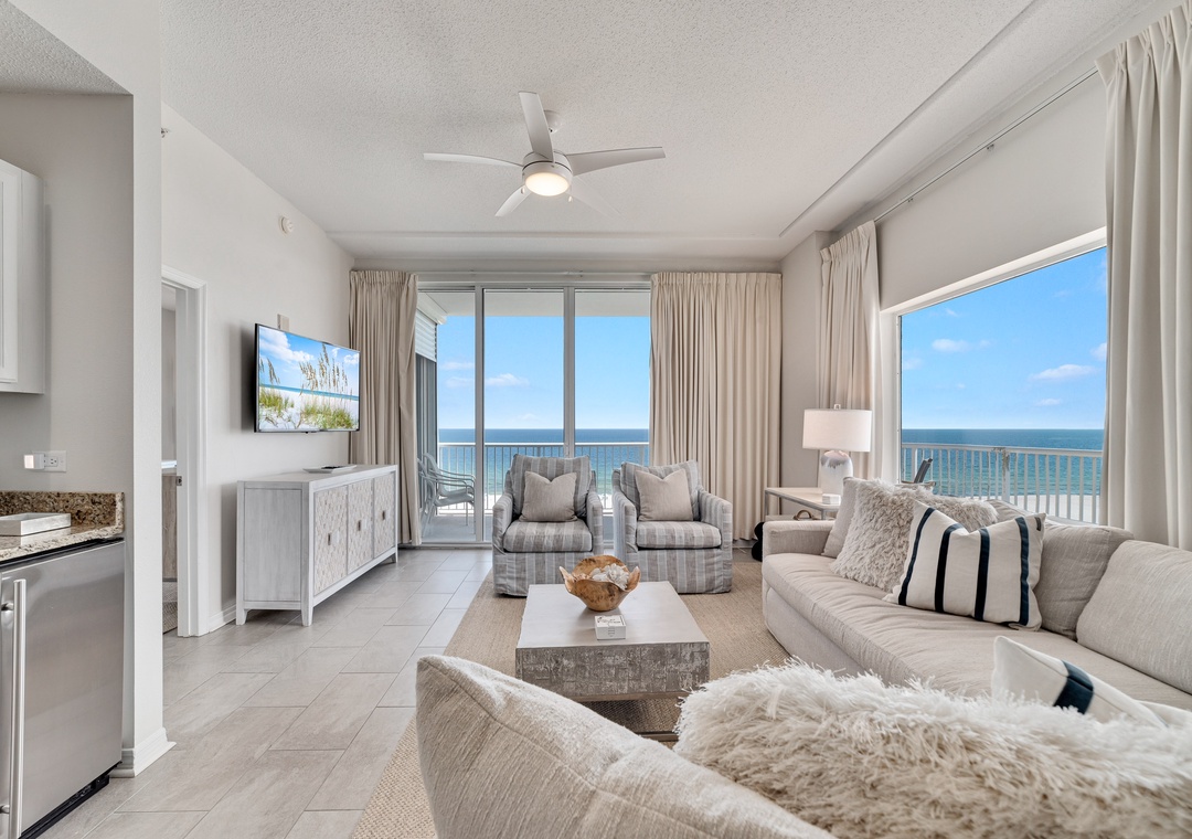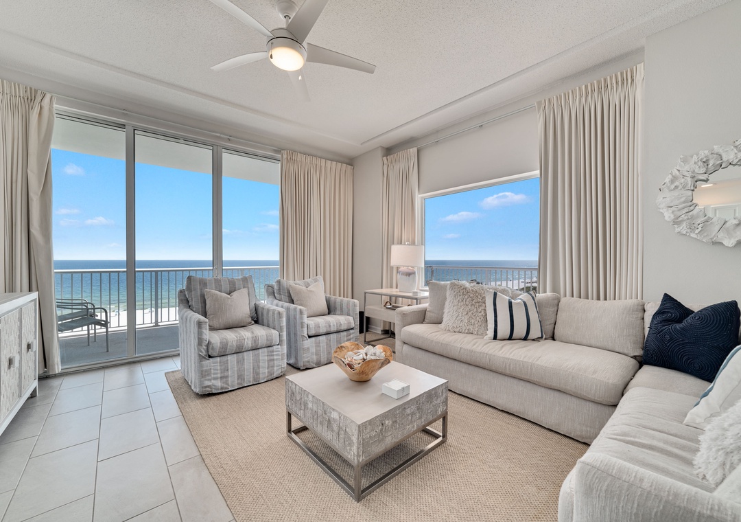 This fabulous 3-bedroom unit features a spacious open-concept layout, updated furnishings and beautiful décor throughout! Lounge with the family for movie night in the living area, complete with comfortable furnishings, a large flat screen TV, and beachfront balcony access! The sliding glass doors open to your covered terrace, where you can sit and enjoy the beauty and splendor of the Gulf of Mexico without leaving the comfort of your beachfront abode. With plenty of seating you can even enjoy a delicious dinner alfresco while the moon and stars reflect over the water and the waves crash gently against the shore, creating a breathtaking backdrop for an evening you’ll never forget!