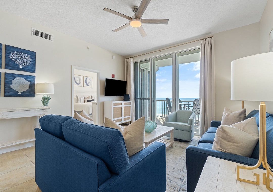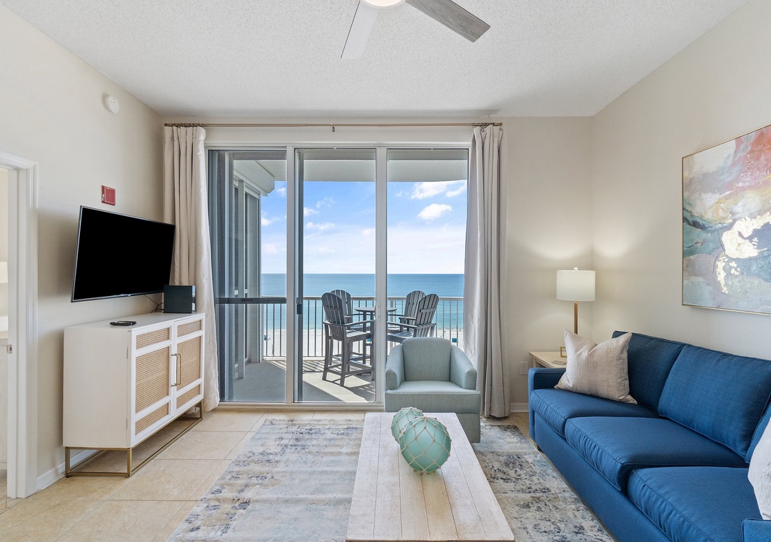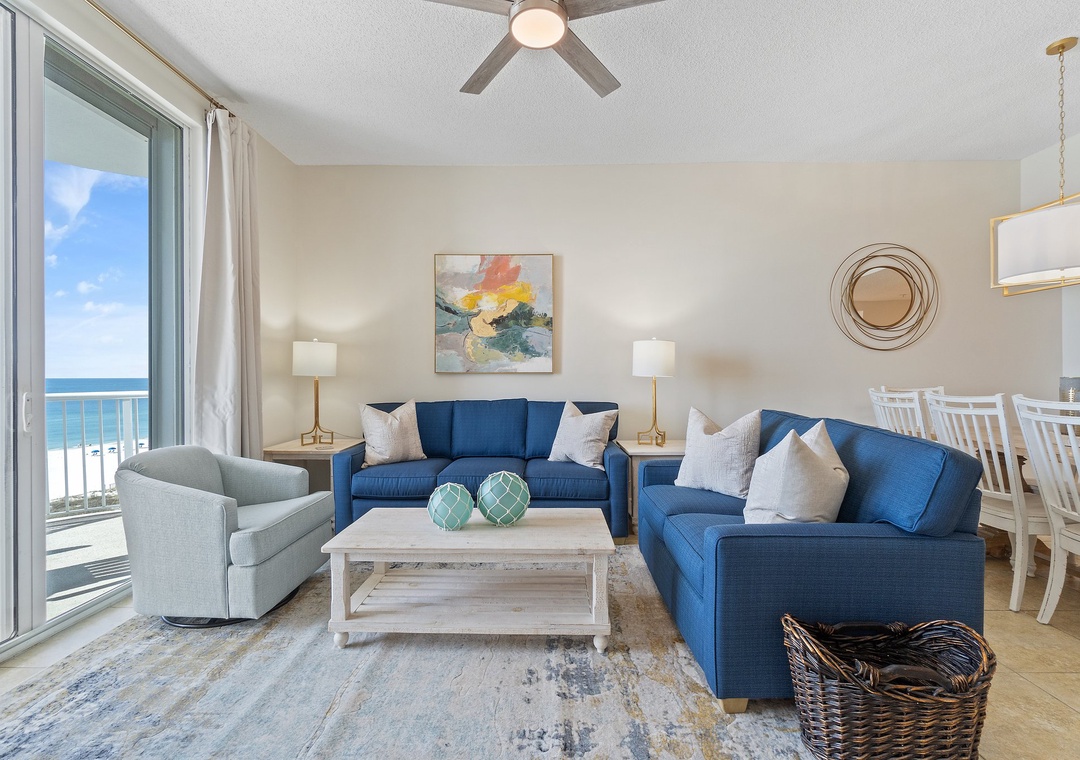 This fabulous unit features a spacious open-concept layout, comfortable designer furnishings, updated electronics and beautiful décor throughout! Lounge with the family for movie night in the living area, complete with plush furniture, updated TV and balcony access! The sliding glass doors open to your covered terrace, where you can sit and enjoy the beauty and splendor of the Gulf of Mexico without leaving the comfort of your beachfront abode. With plenty of seating you can even enjoy a delicious dinner alfresco while the moon and stars reflect over the water and the waves crash gently against the shore, creating a breathtaking backdrop for an evening you’ll never forget!