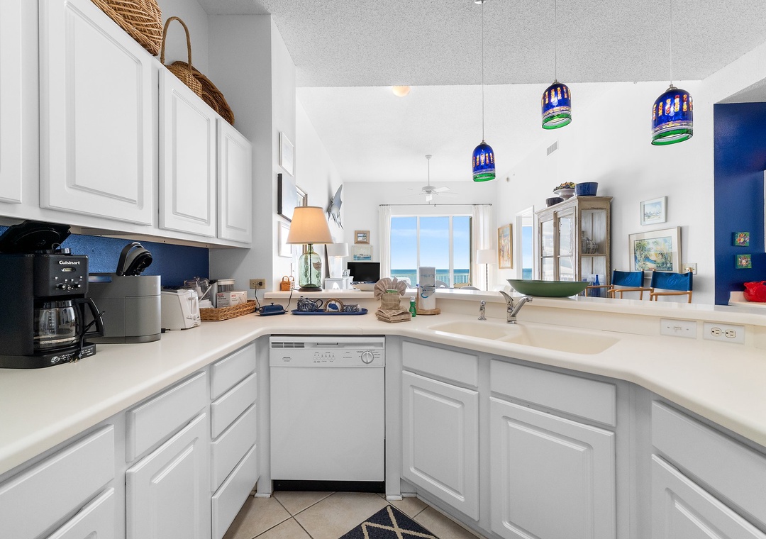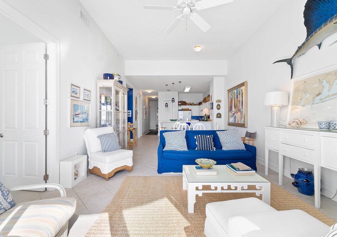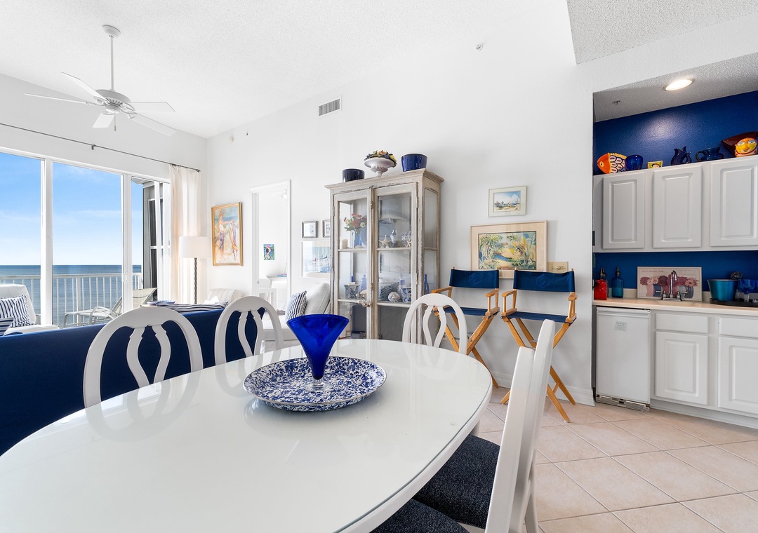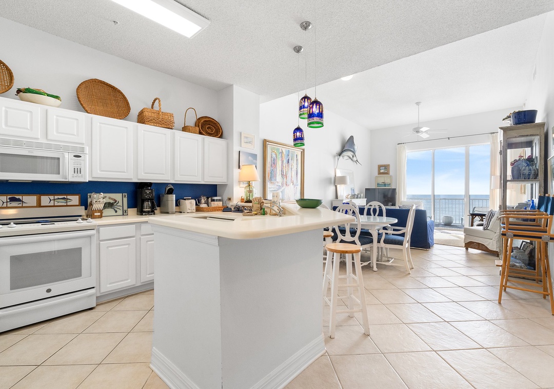 This fabulous unit features a spacious open-concept layout, comfortable designer furnishings, updated electronics, and beautiful décor throughout! Lounge with the family for movie night in the living area, complete with plush furniture, updated TV and balcony access! The sliding glass doors open to your covered terrace, where you can sit and enjoy the beauty and splendor of the Gulf of Mexico without leaving the comfort of your beachfront abode. With plenty of seating you can even enjoy a delicious dinner alfresco while the moon and stars reflect over the water and the waves crash gently against the shore, creating a breathtaking backdrop for an evening you’ll never forget!