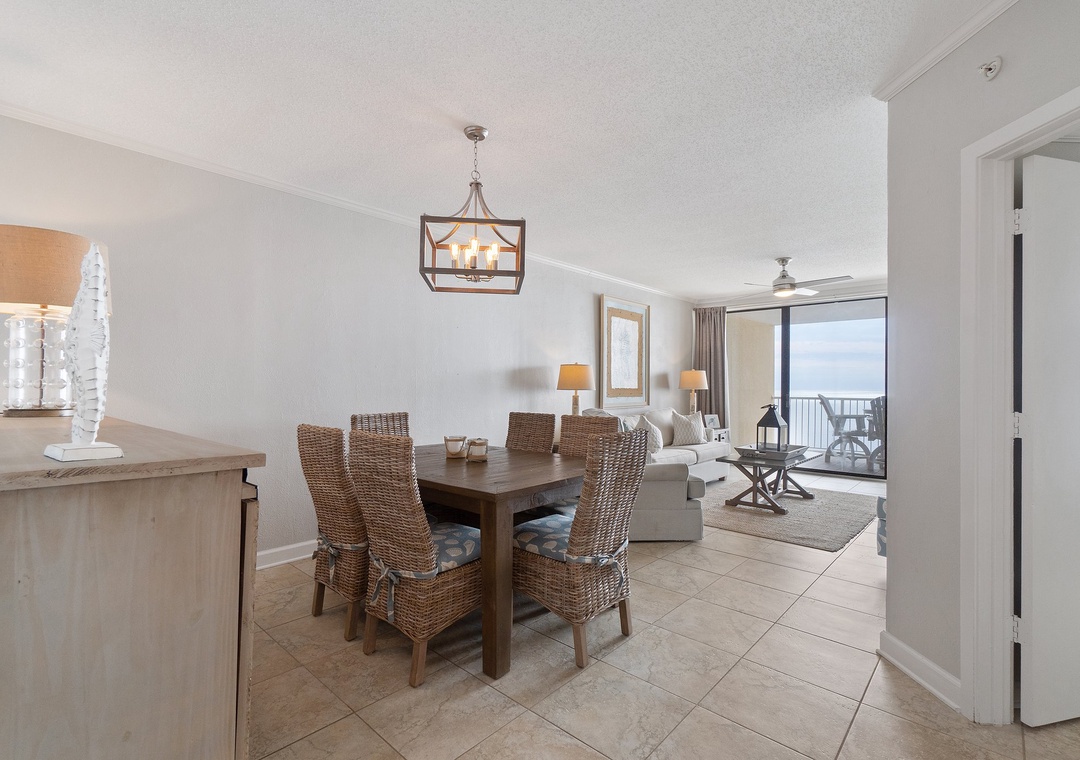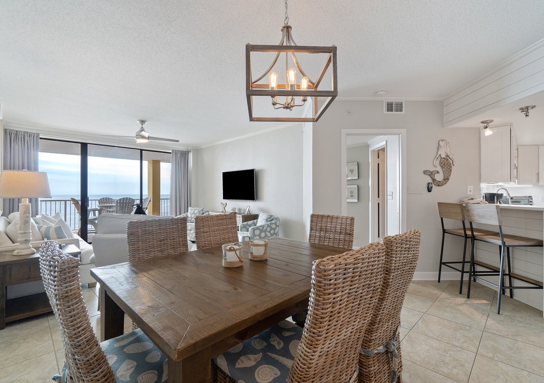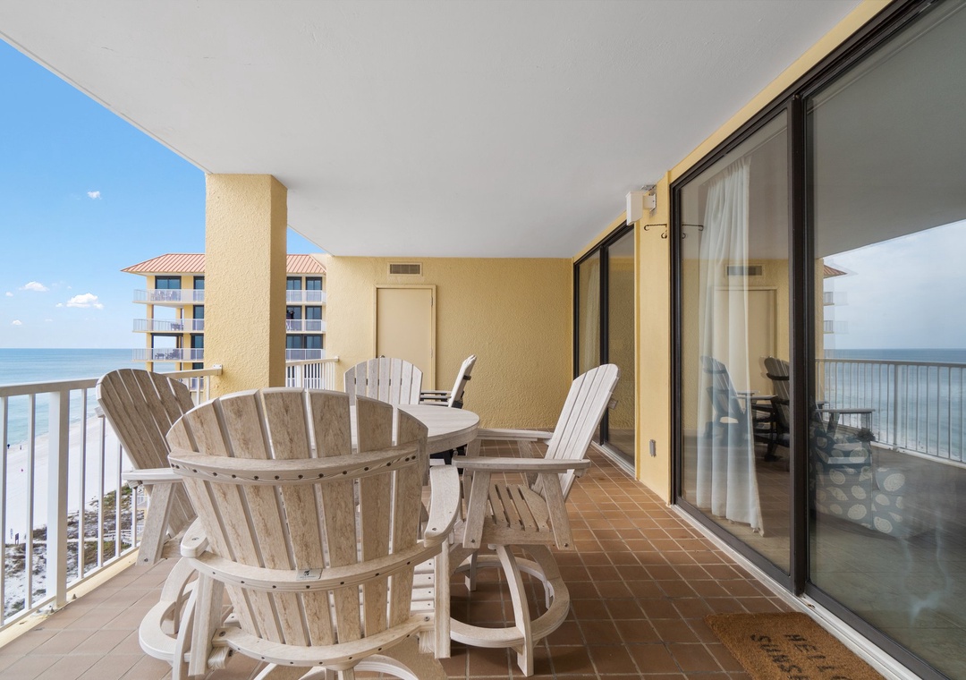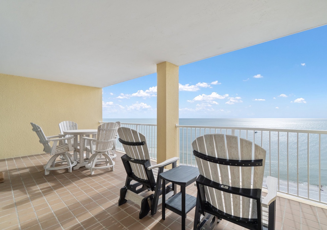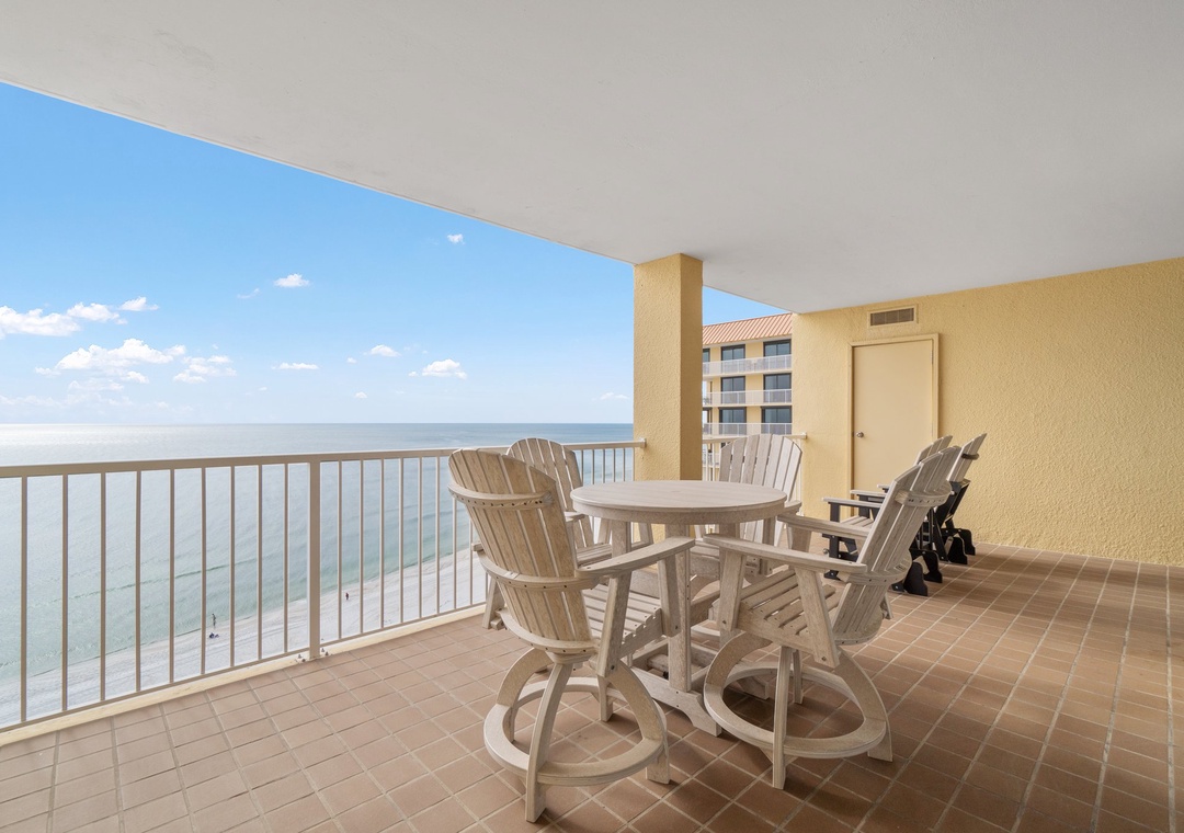 Floor-to-ceiling sliding glass doors open to the spacious covered terrace, providing comfortable furniture for the whole group to enjoy their favorite beverage and even savor a delicious meal while delighting in panoramic vistas of the sparkling Gulf Coast.