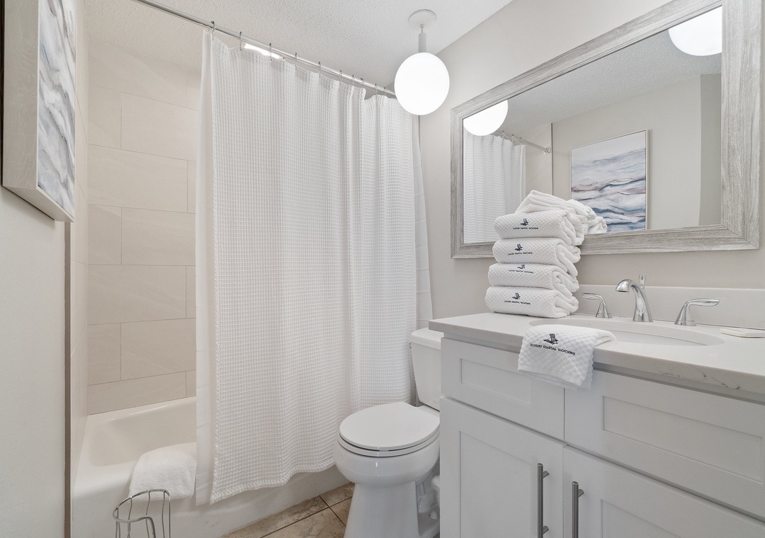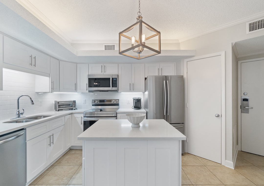 The impressive master suite boasts a King bed with luxurious linens and a premium mattress, and an attached bathroom. You’ll definitely indulge in some much-needed relaxation in this master retreat! The second bedroom is elegantly appointed with another King bed and luxury bedding. The third bedroom offers two Full beds, and there is also a queen sleeper sofa. This luxury unit also features a full-size washer and dryer for your convenience.