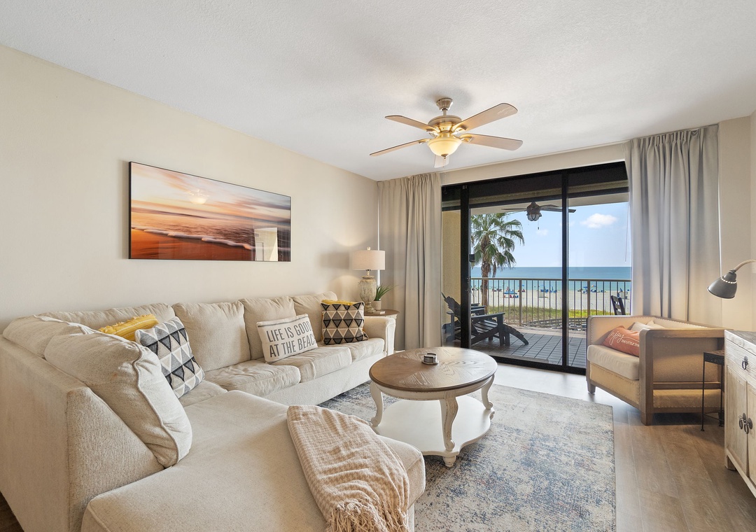 This 2nd floor, 3 bedroom, 2 bath retreat embodies contemporary comfort and elegance, where crisp, calming neutrals and nautical accents form a tranquil spa-inspired ambiance. The living area boasts plush furnishings in soft neutrals, giving the space a sophisticated yet updated feel, while ample seating allows the whole family to lounge and enjoy a cozy night in watching movies on the giant flat screen HDTV!
