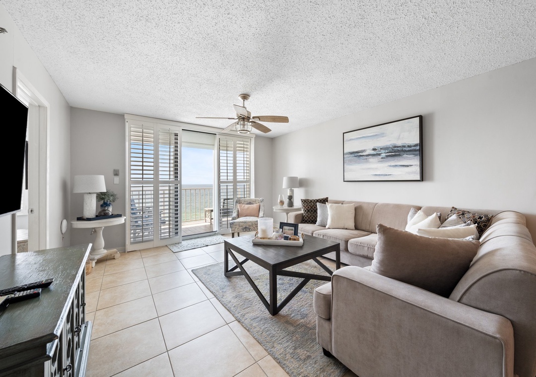 This spacious yet cozy Gulf front retreat boasts comfortable furnishings, stylish décor, updated electronics, and luxurious touches throughout. The living room offers plenty of seating where the whole family can lounge, not to mention the sliding glass doors that lead out to the expansive covered beachfront balcony! Wake up and sip your morning coffee while the sun rises over the Gulf, or even enjoy an alfresco dinner under the stars while the tranquil sound of the waves relaxes your senses and calms your mind!