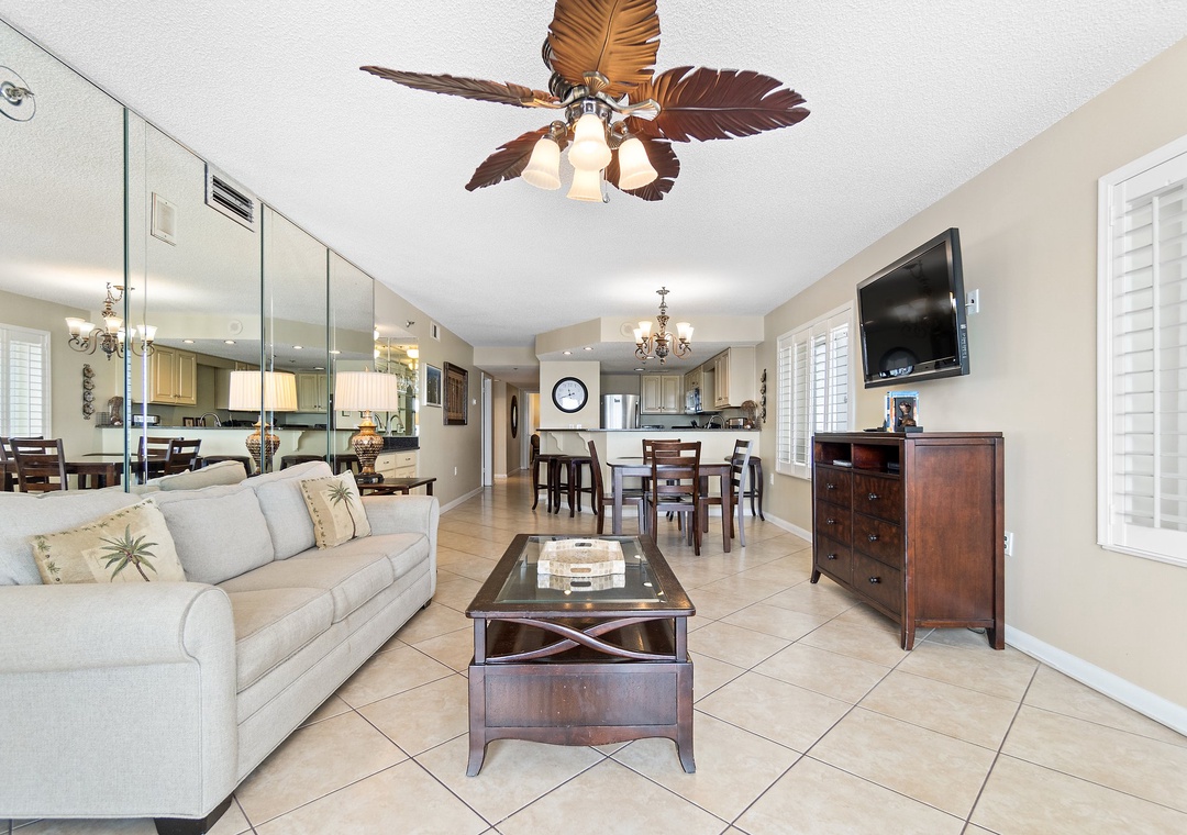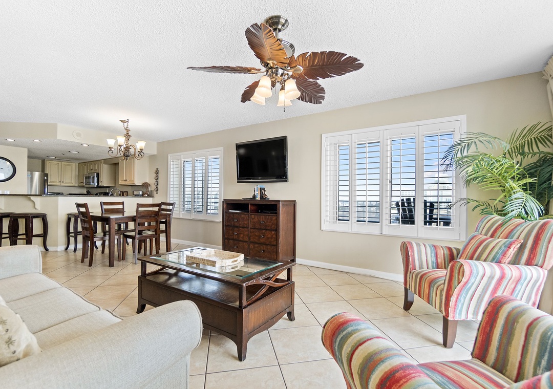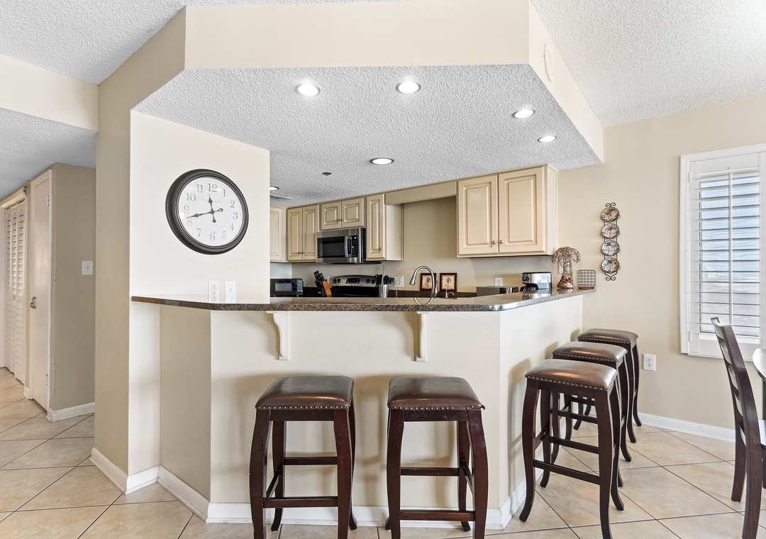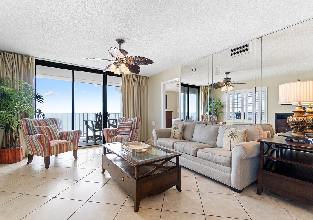 Welcome to Summerchase 401, a luxurious 3-bedroom, 2-bathroom condo nestled along the pristine shores of the Gulf of Mexico. This stunning unit offers breathtaking panoramic views of the azure waters, inviting you to unwind and soak in the beauty of the coast. Inside, you'll find a spacious king bedroom, a queen bedroom and a cozy twin over queen bunk bed. A queen sleeper sofa adds additional space to sleep, providing comfortable accommodations for up to nine guests. The interior boasts a modern aesthetic with tile flooring throughout, complemented by sleek stainless-steel appliances in the fully equipped kitchen. The open living area seamlessly blends with the kitchen, creating a welcoming space for gatherings and relaxation.